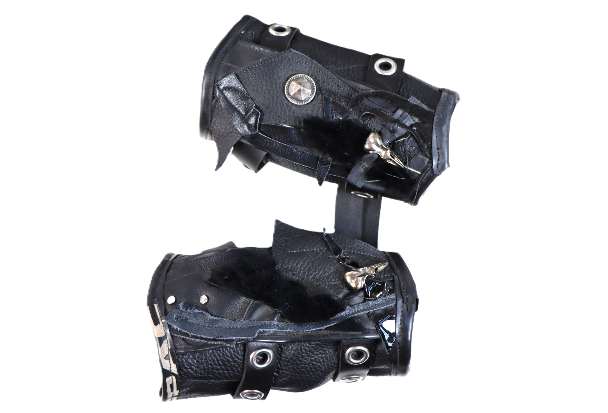 Handgefertigte Armschienen aus Leder, Gummi oder anderen Materialien. Die Schienen passen sich durch die Schnallen und Gurte ideal an. Das Leder schiebt sich ineinander.