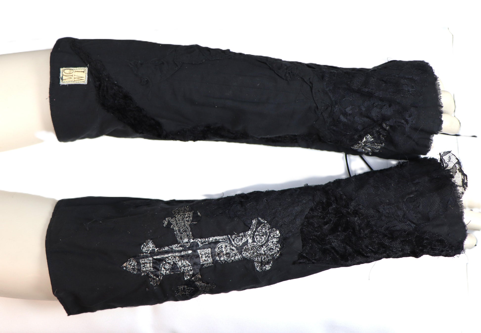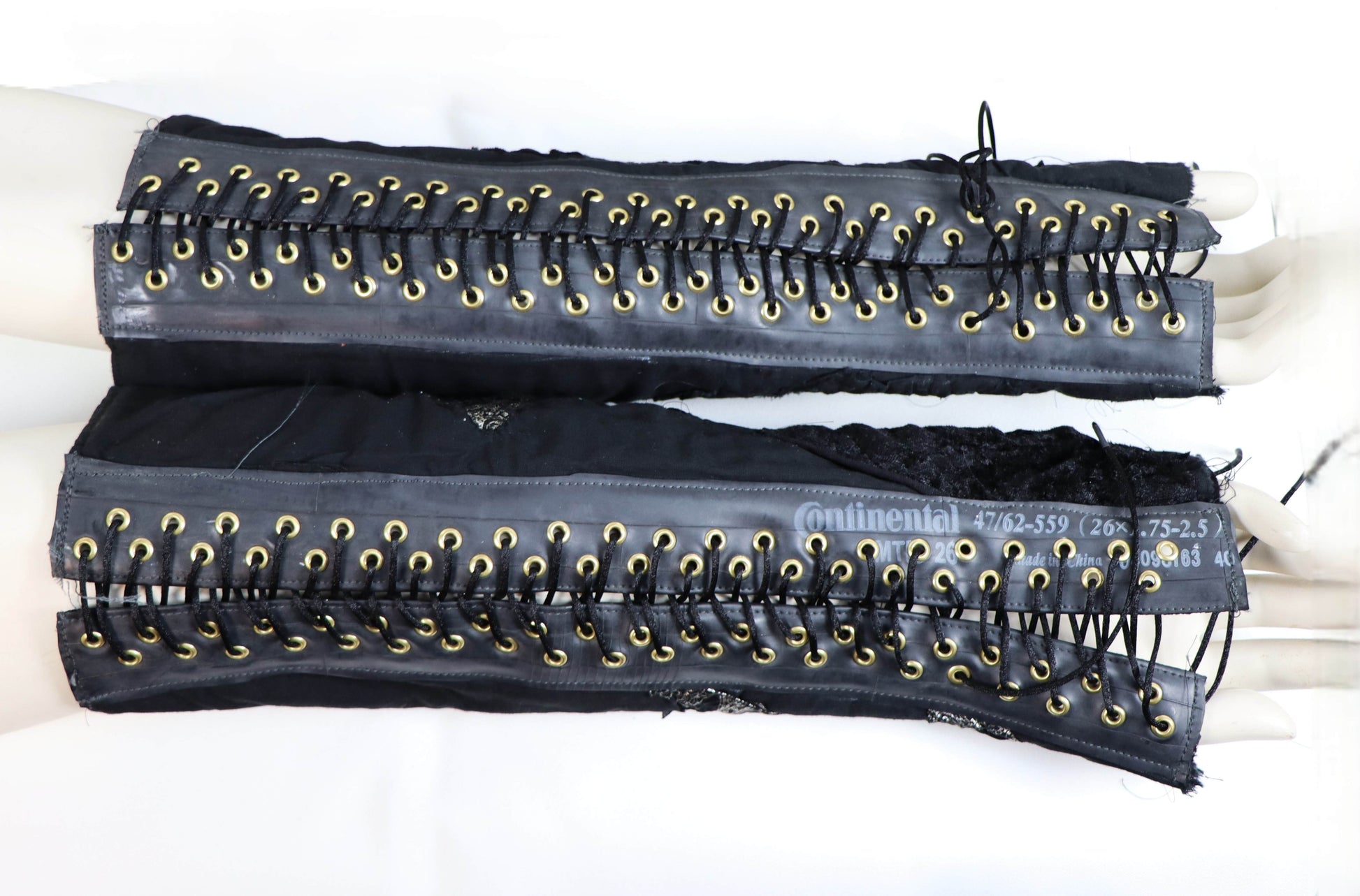 Handgefertigte Armstulpen aus Gummi und einzelnen Stoffelementen. Auf der der rechten Seite befindet sich ein appliziertes Kreuz. Besonders aufwendig ist die Doppelschnürung auf der Innenseite der Arme.