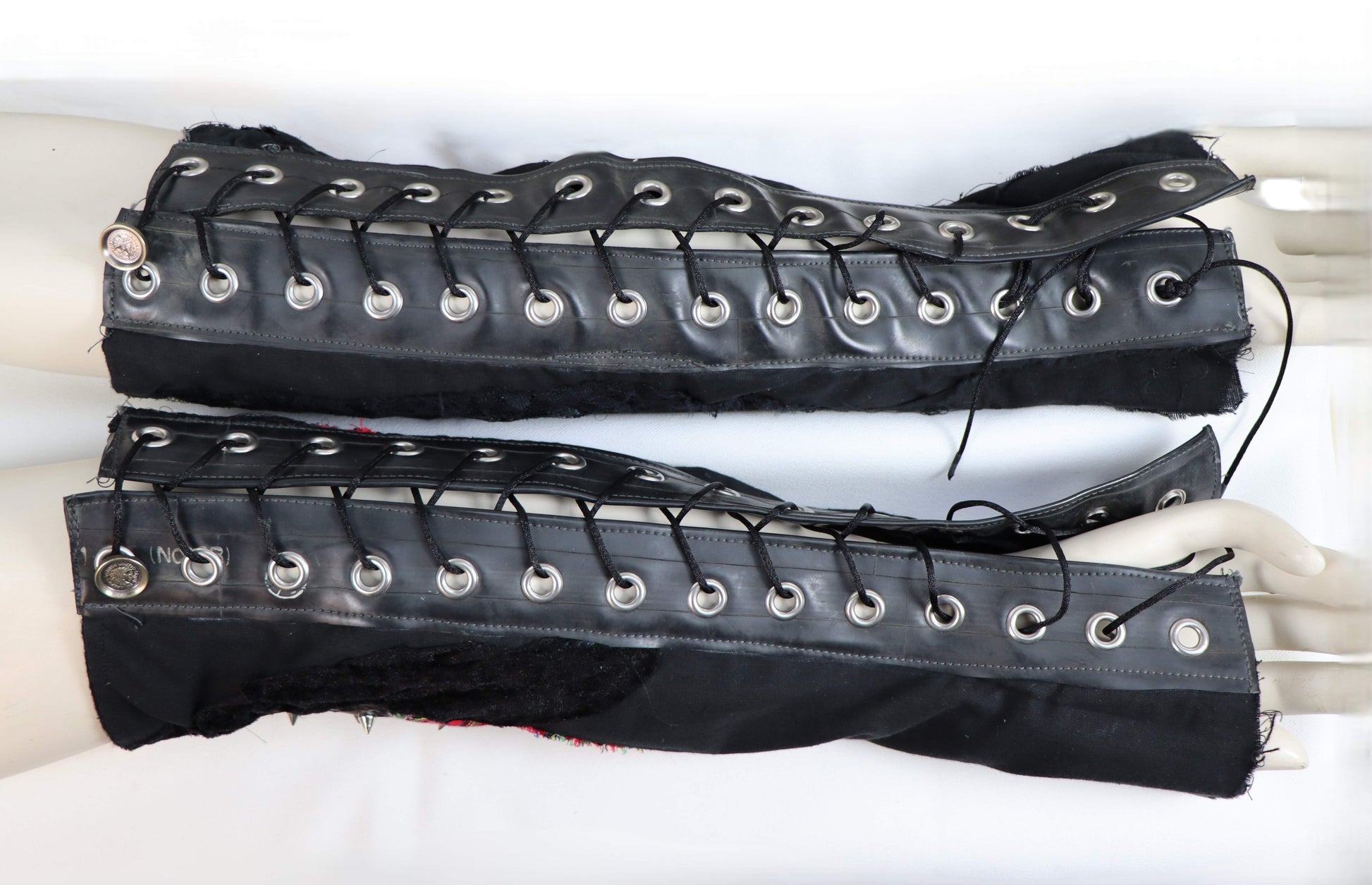 Handgefertigte Armstulpen aus Gummi, verschiedenen schwarzen und karierten Stoffelementen zusammengesetzt. Das besondere ist die lange Schnürung.