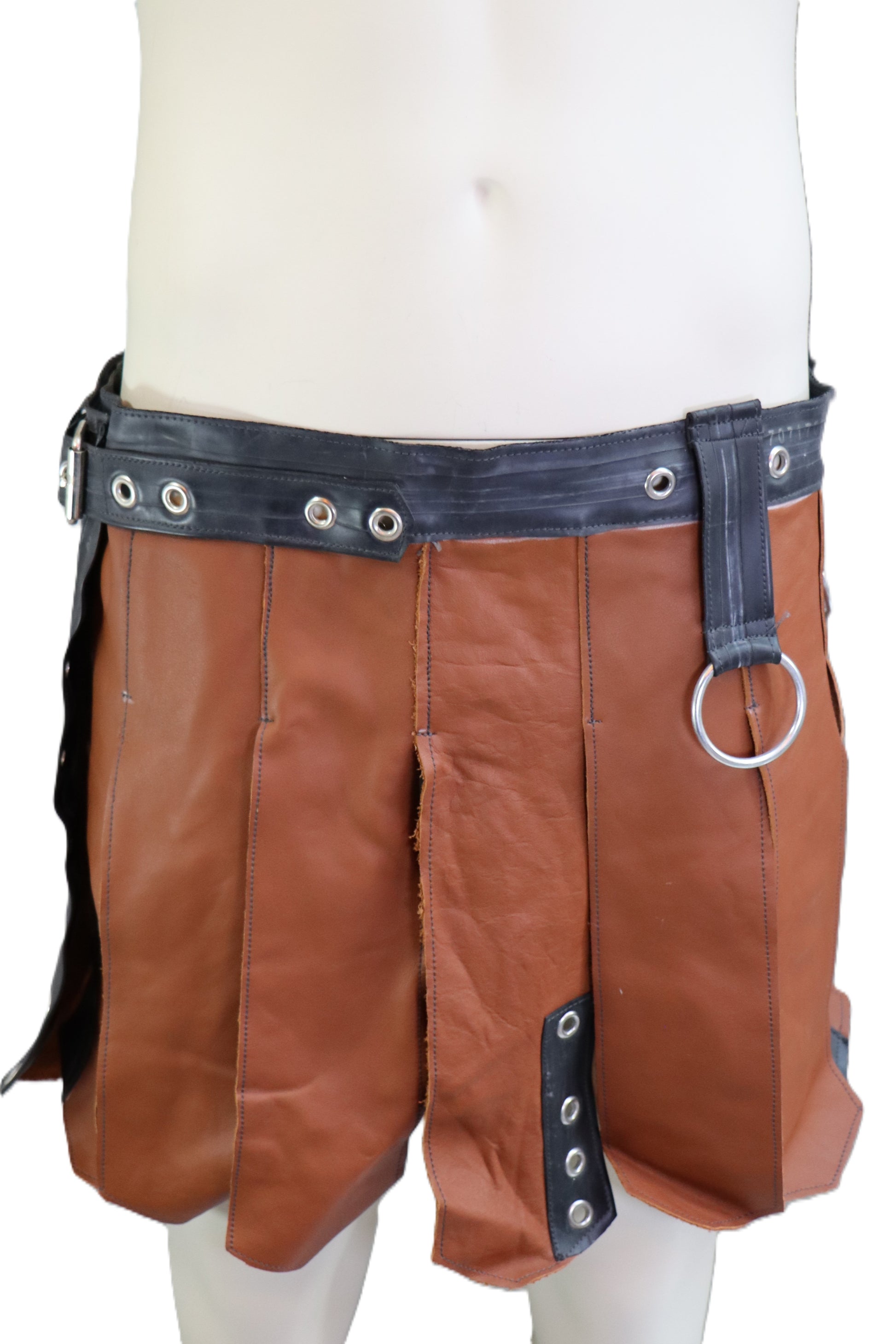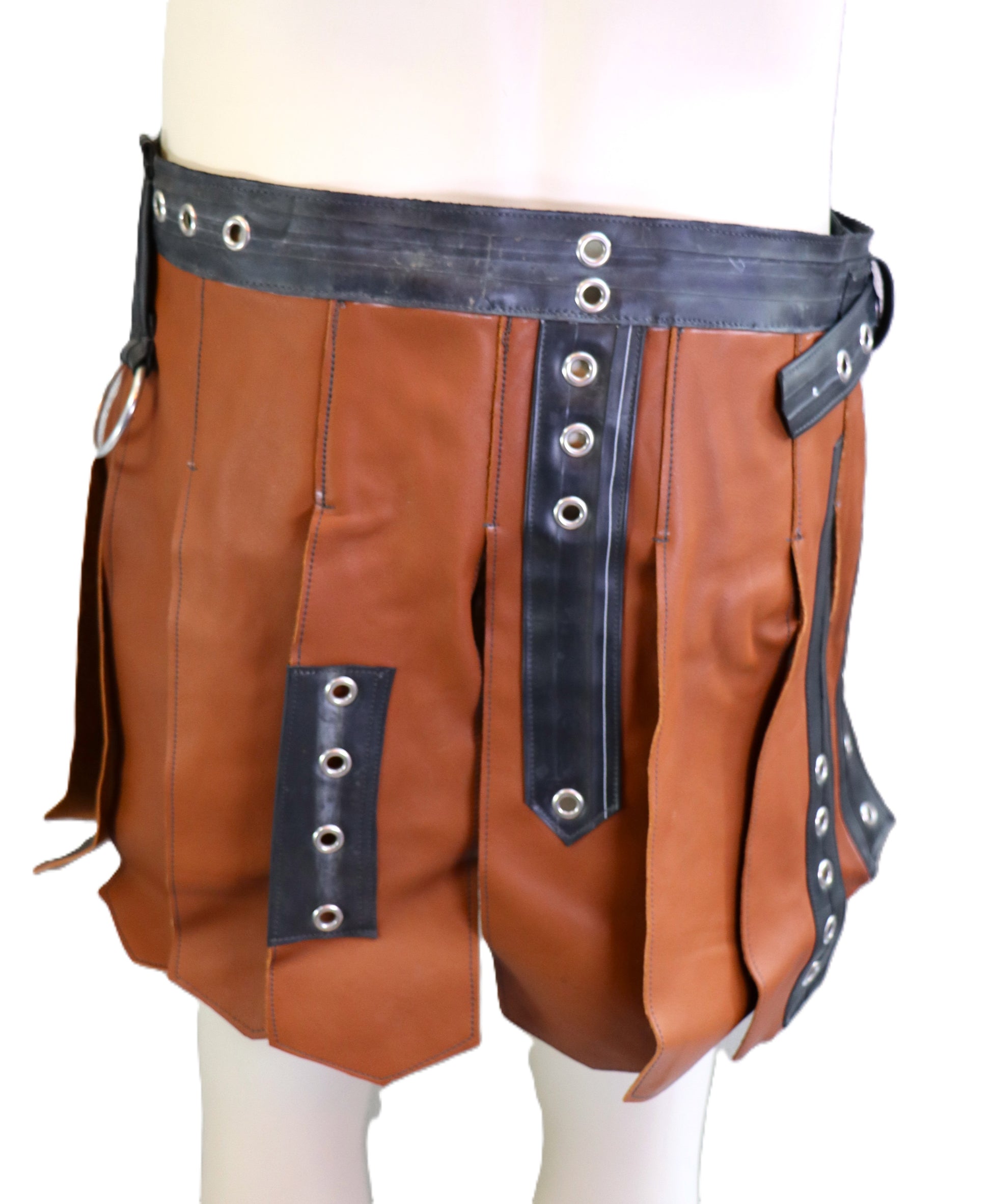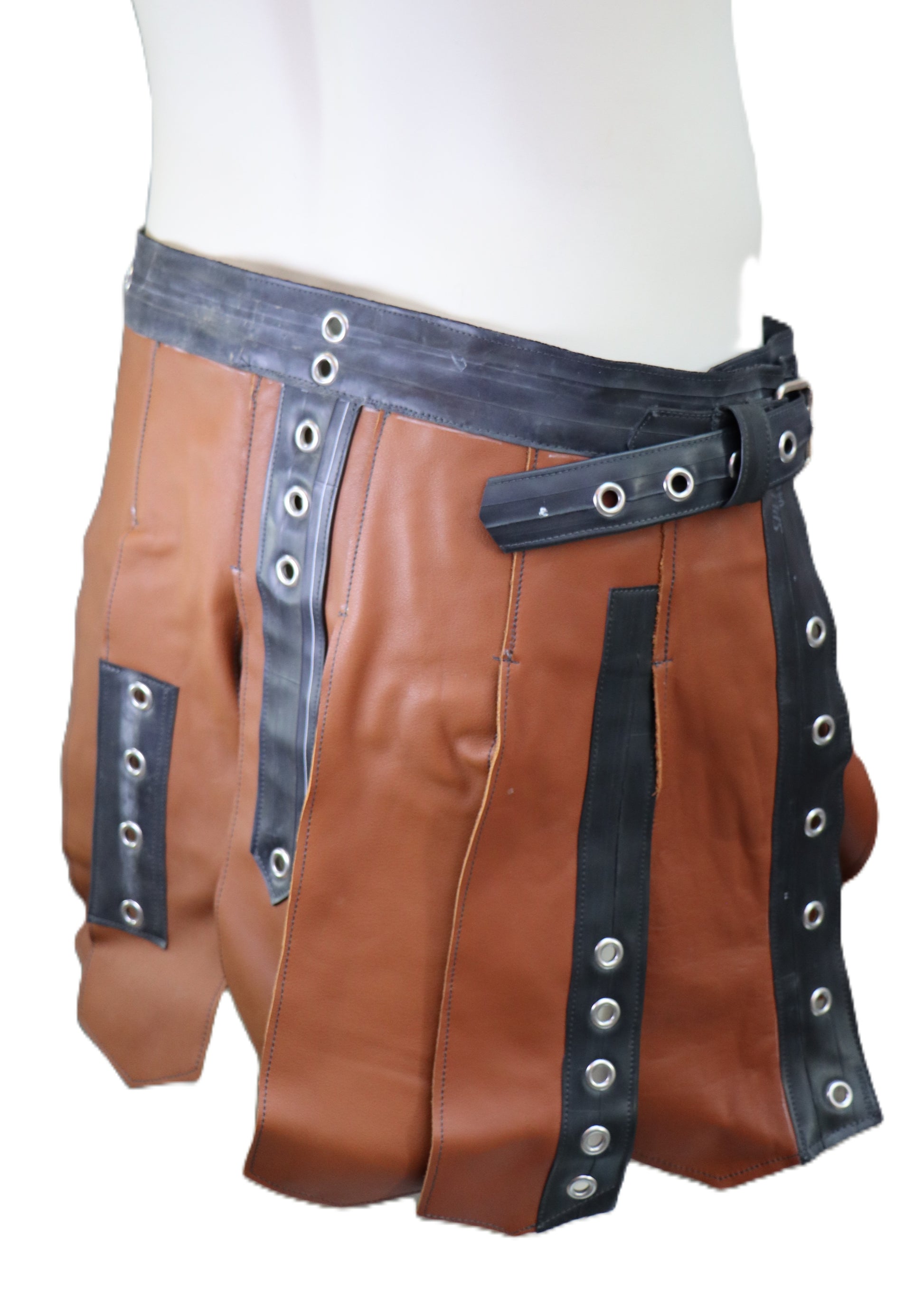 Handgefertigter Gladiatorenrock aus braunem Leder mit Gummielementen.