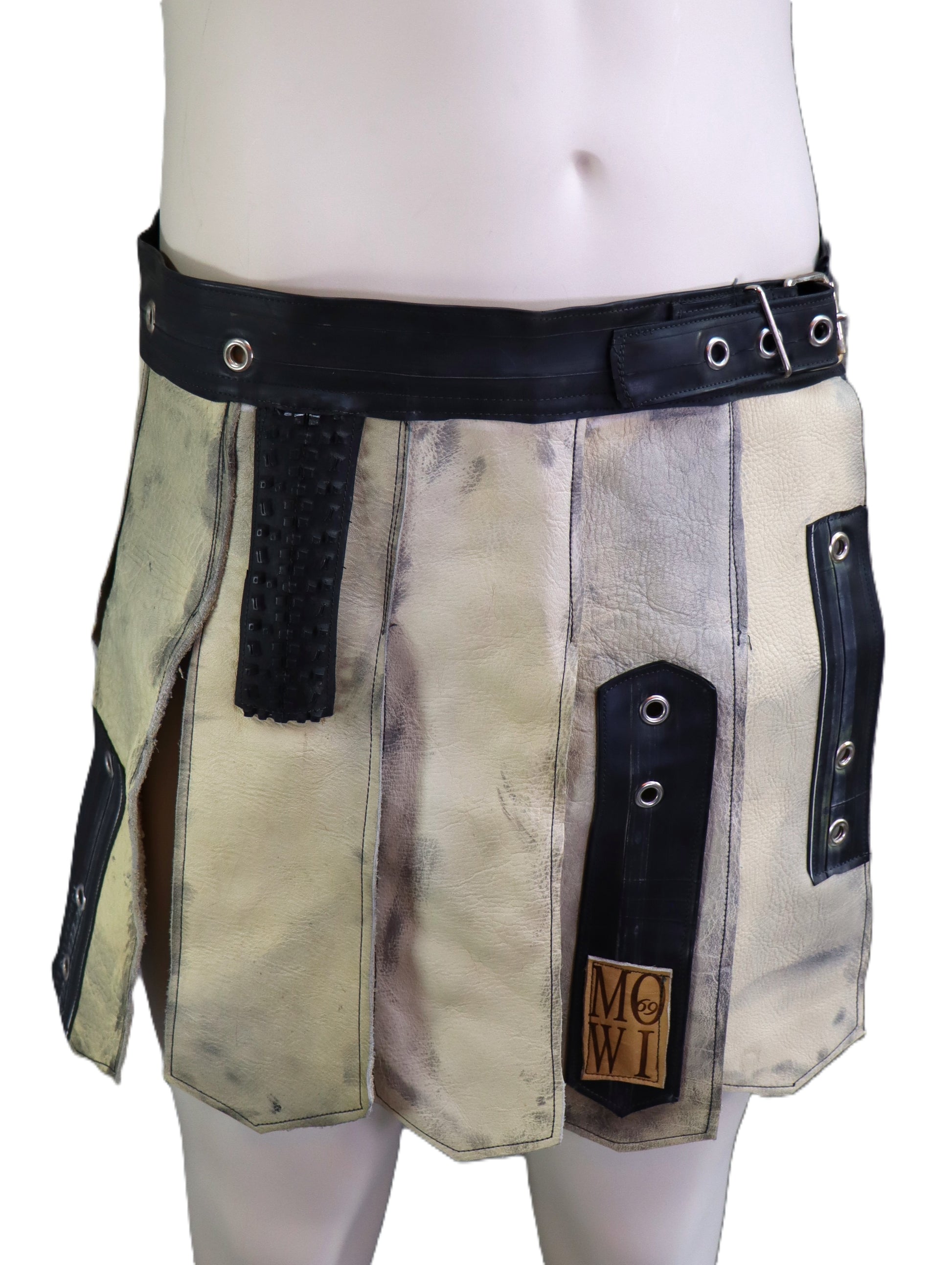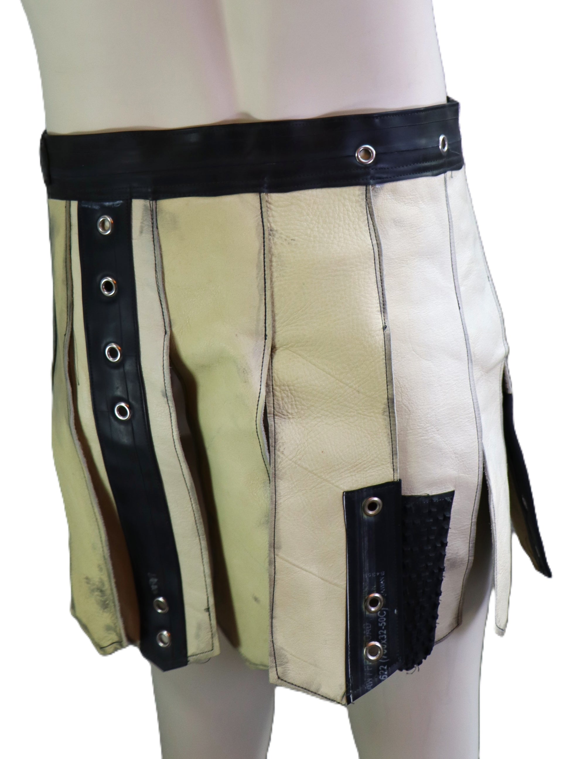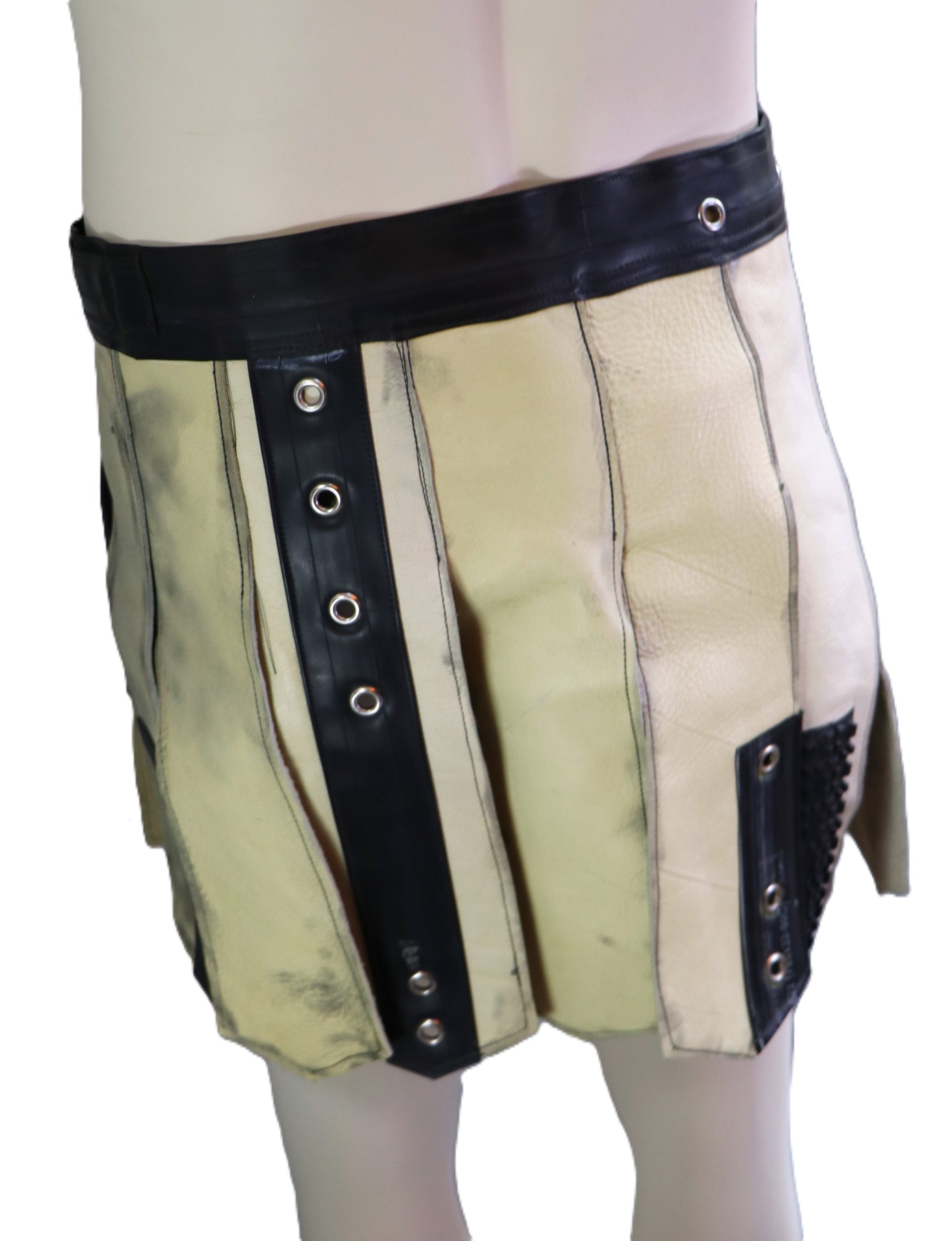 Handgemachter Gladiatorenrock aus braunem Leder mit schwarzen Gummiapplikationen.