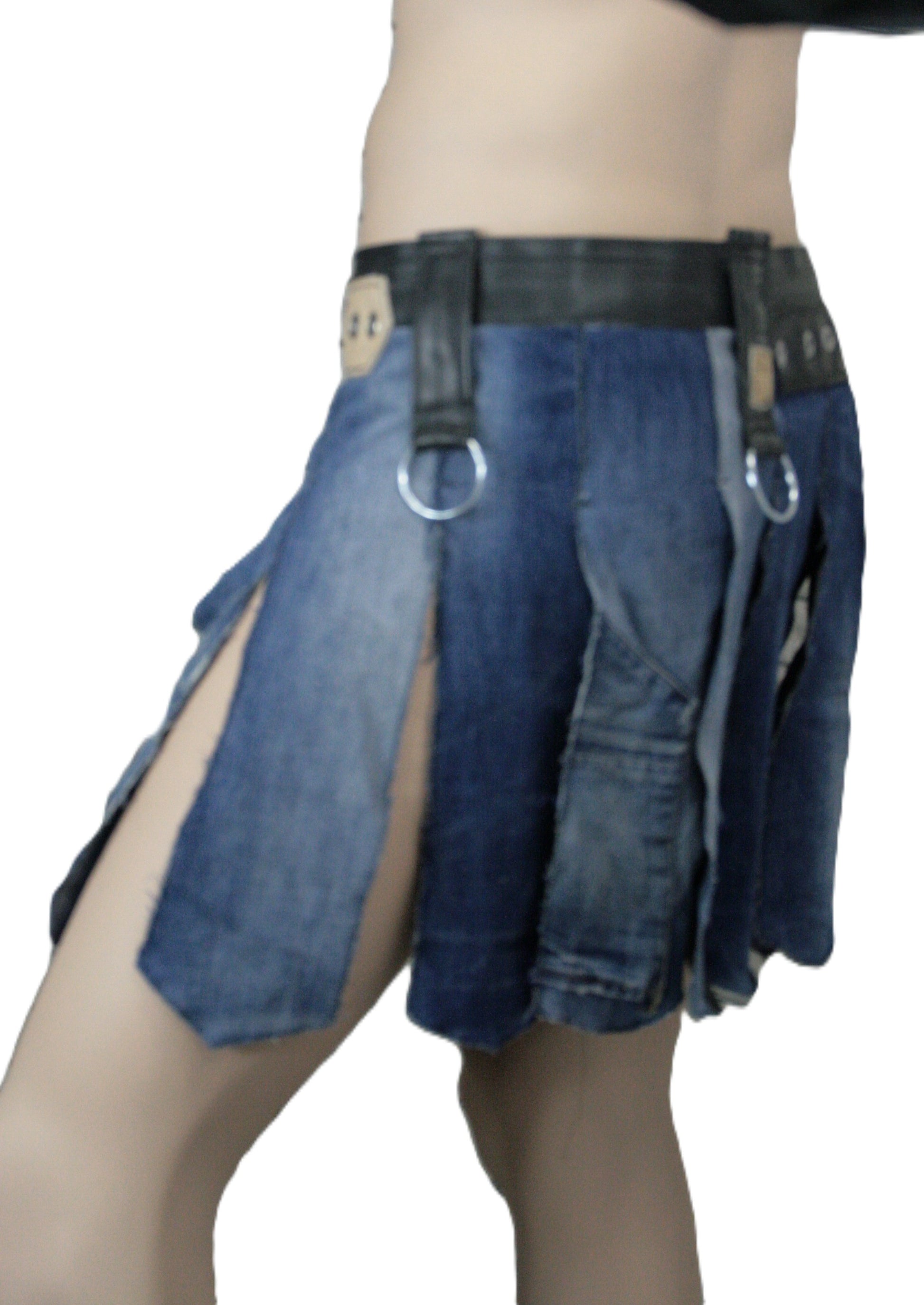 Handgefertigter Römerrock aus Jeans, Leder und Gummi.