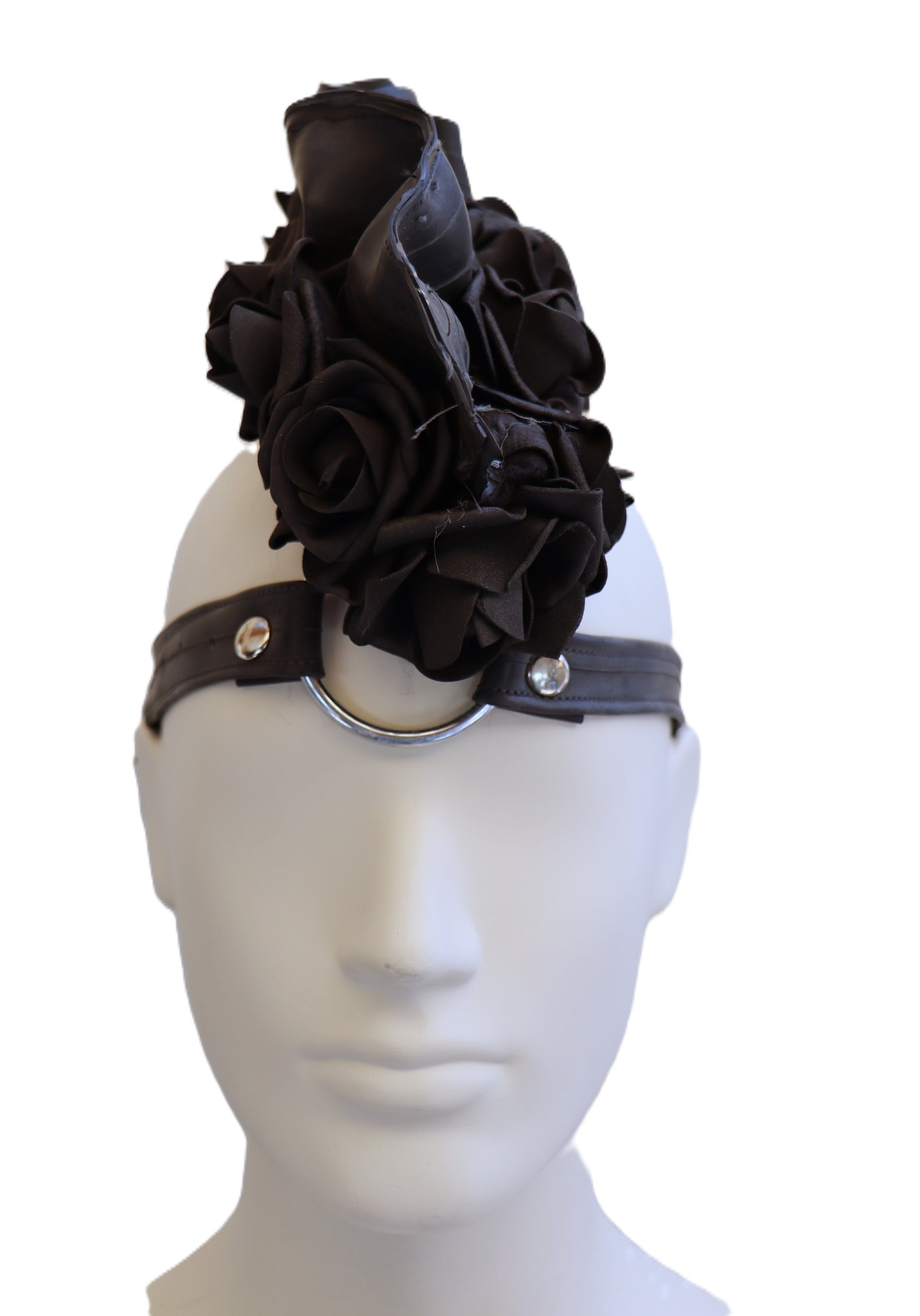 Handgefertigter Irokese aus schwarzem Schlauchgummi mit schwarzen Schaumgummirosen. Dieser Kopfschmuck wird durch den Gurt am Kopf befestigt.