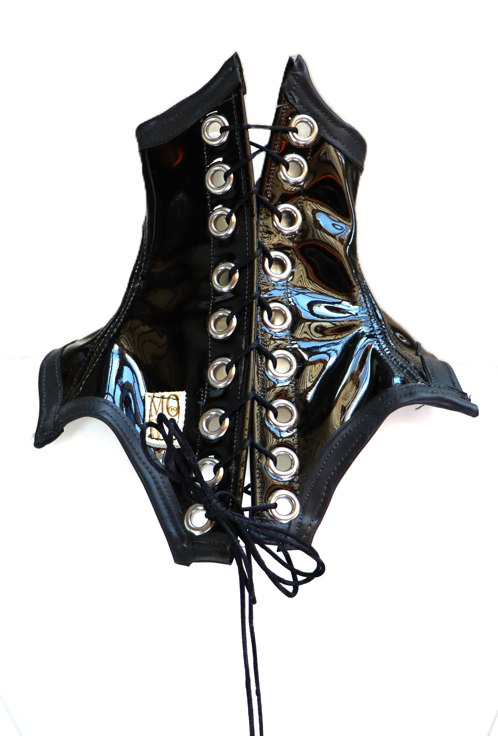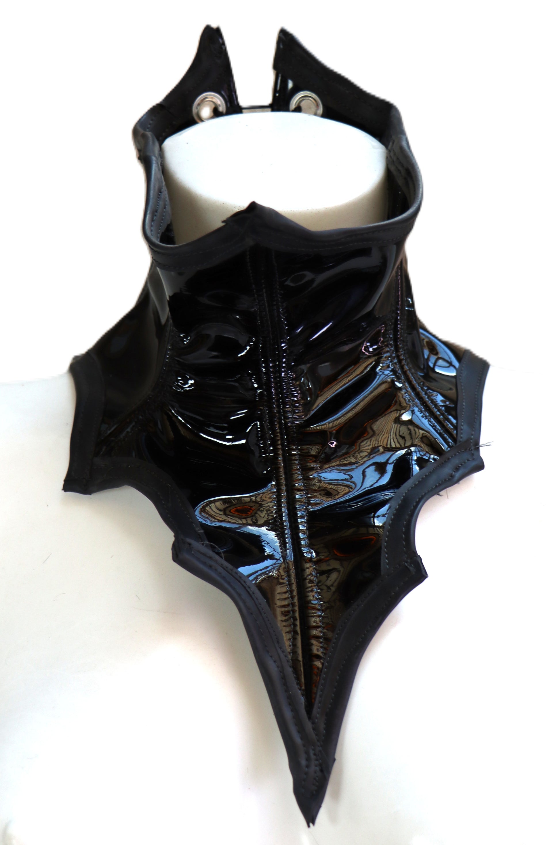 Handgefertigte Halskorsette aus schwarzem Lackleder, kann über die Schnürung reguliert werden.