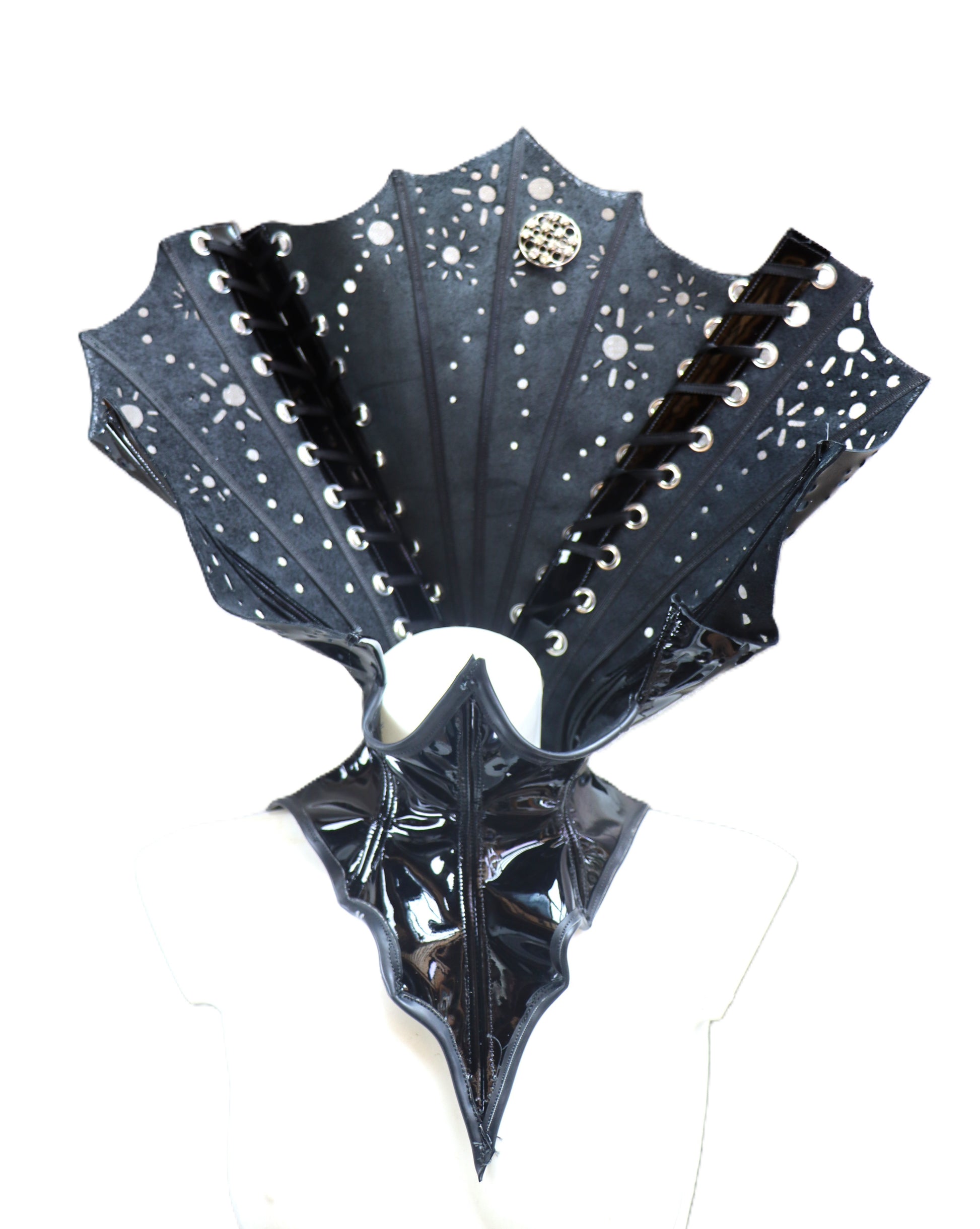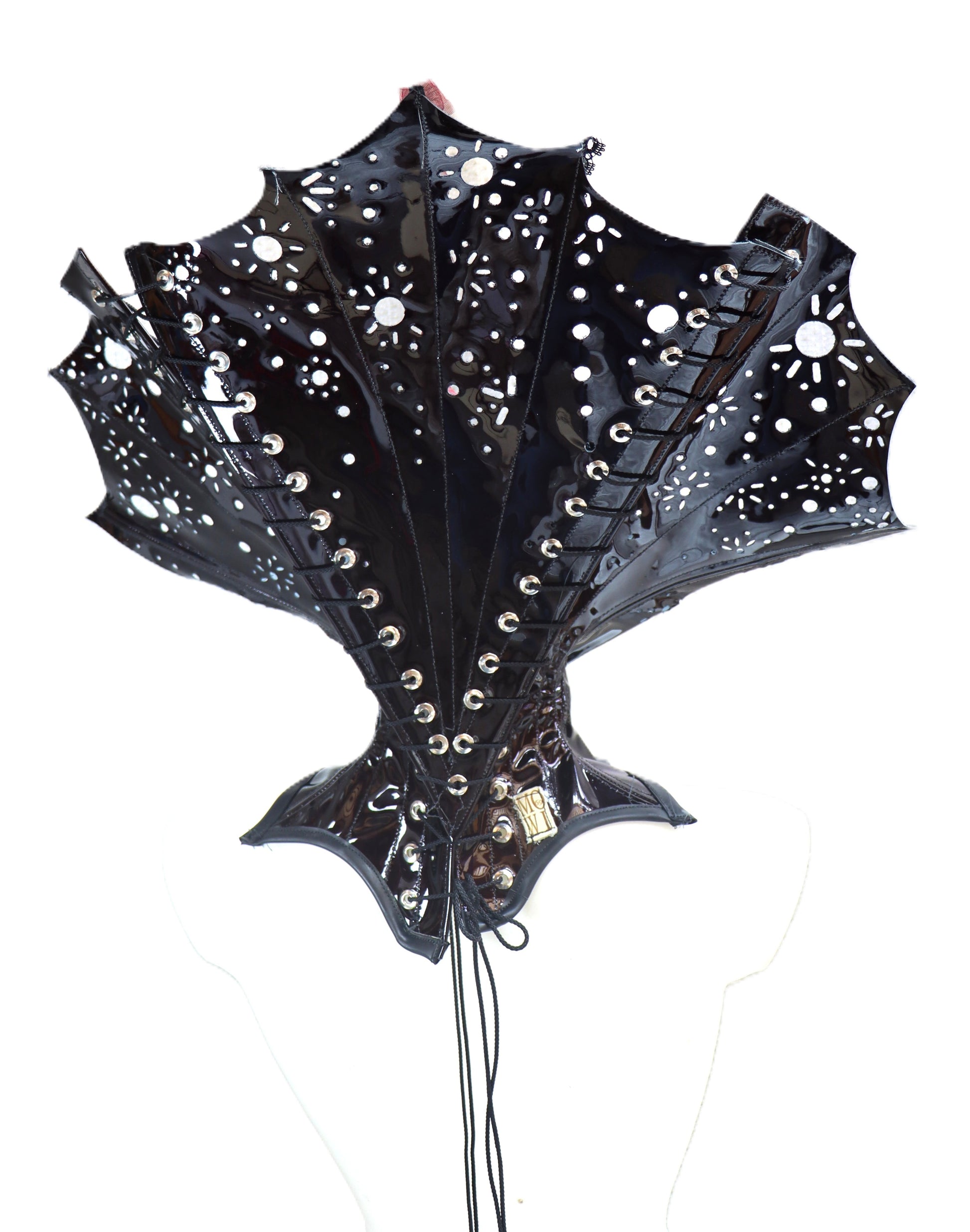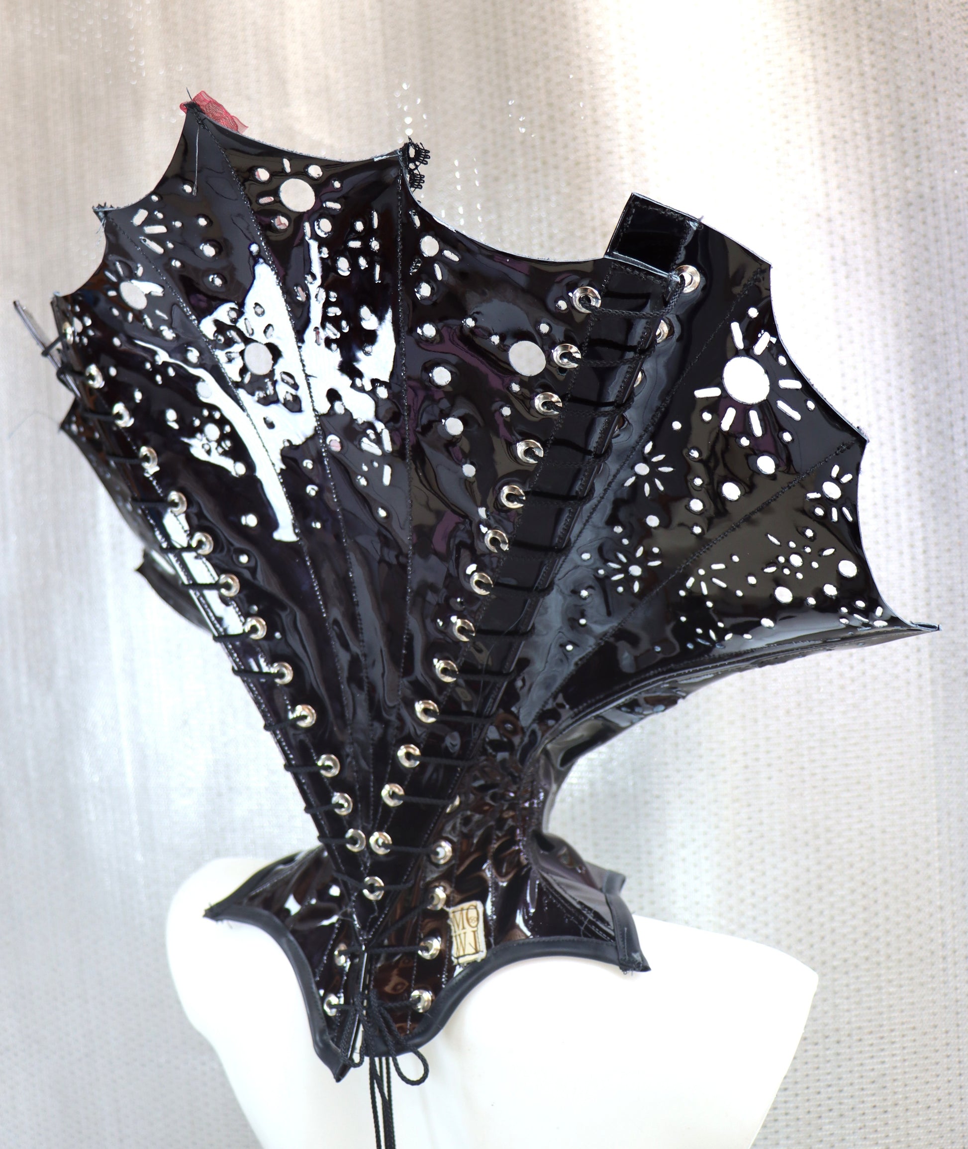 Handgefertigtes Halskorsett mit großem Kragen aus dunkel weinrotem Lackleder, fast schwarz.