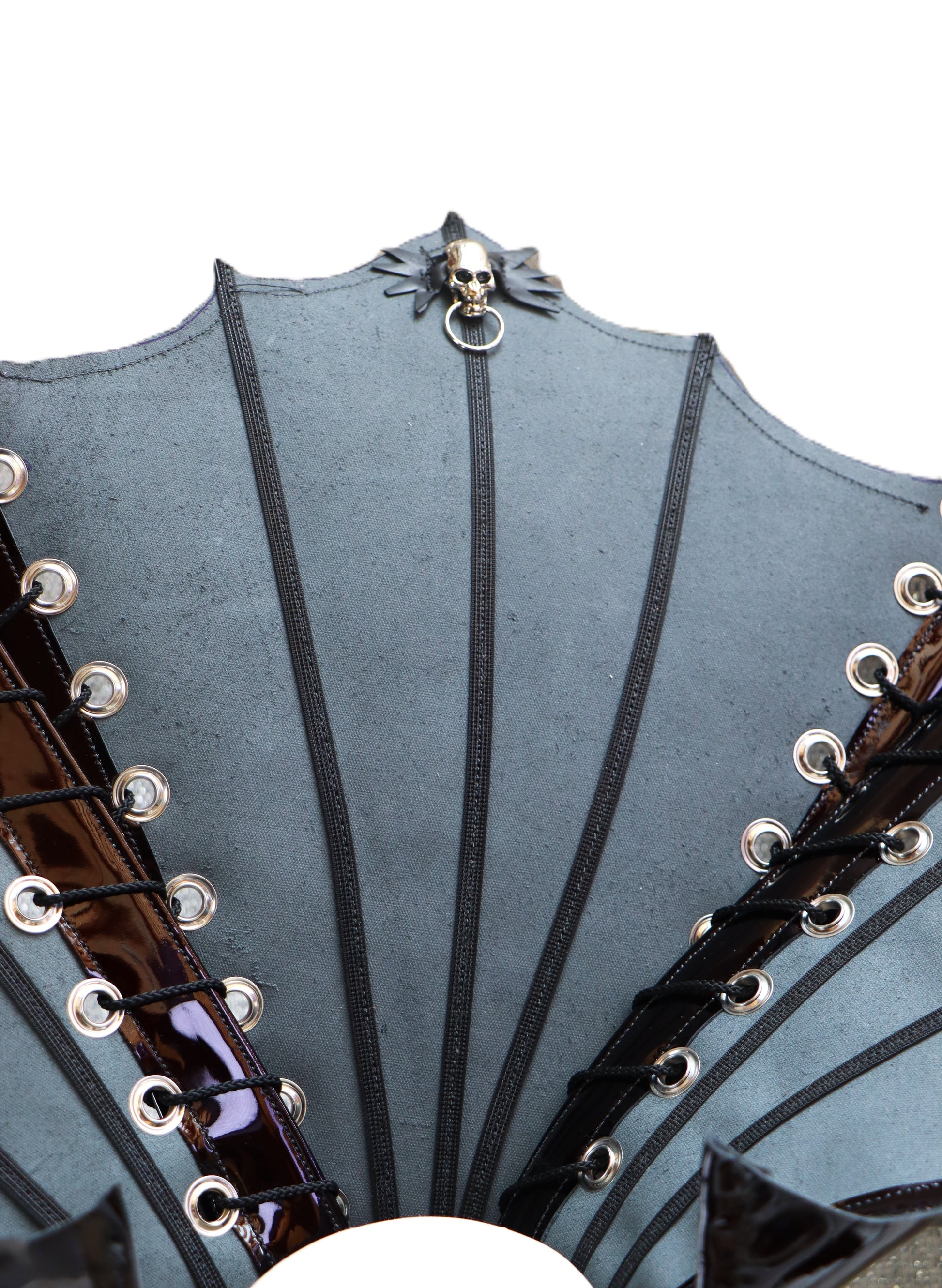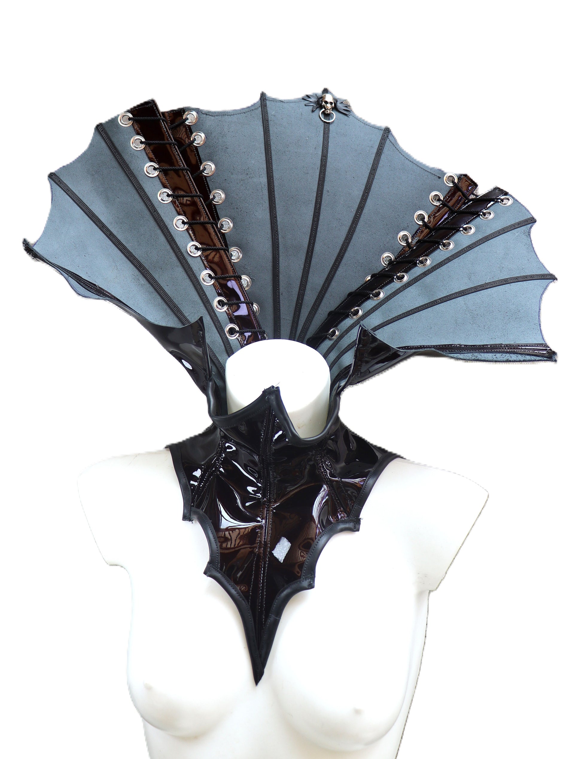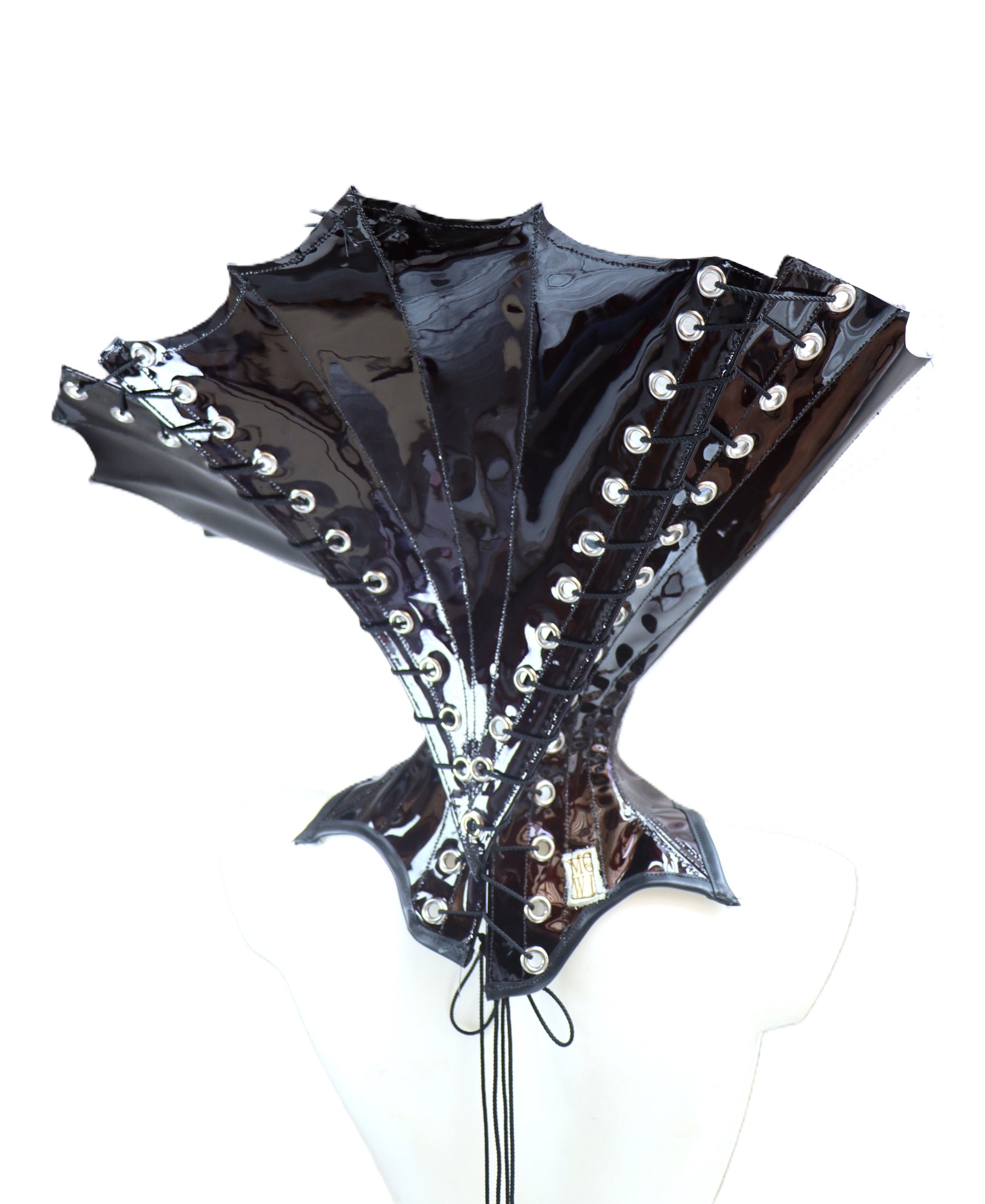 Halskorsett mit großem Kragen und Stäben, aus Lackleder in dunklem Weinrot.
