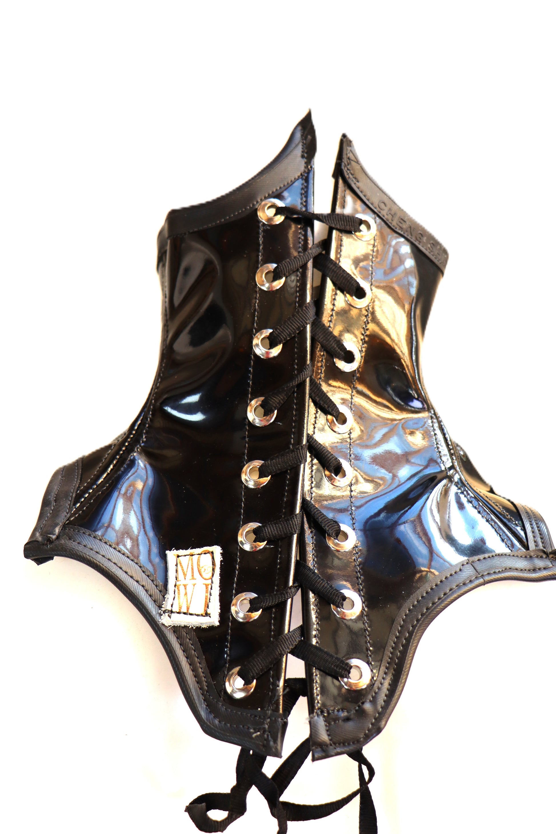Handgefertigte Halscorsage aus schwarzem Lackleder kombiniert zu Fell mit animalprint.