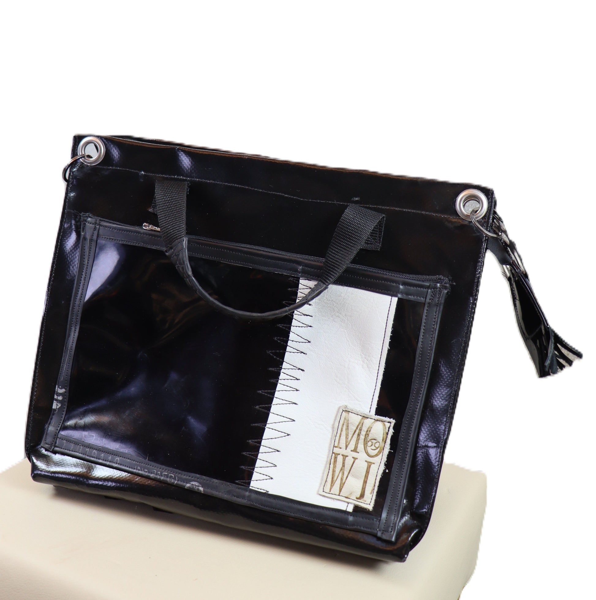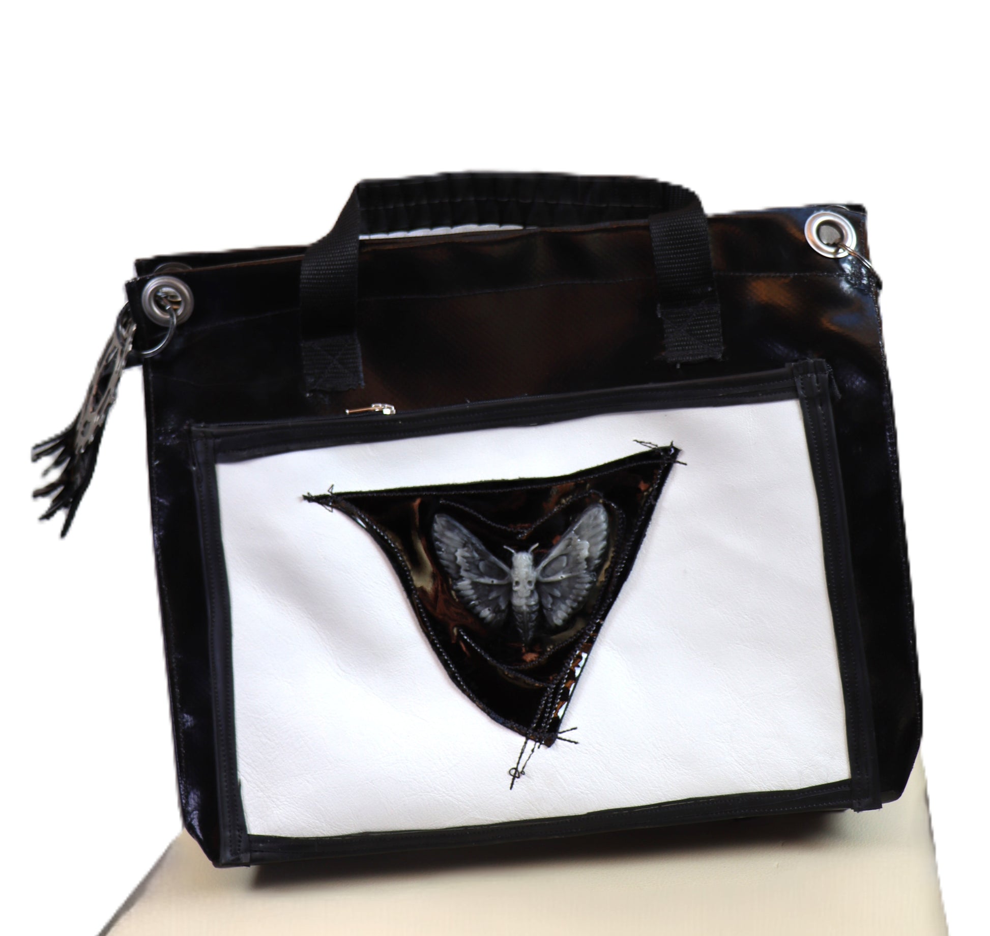 Handgefertigte Tasche aus LKW Plane mit aufgesetzten Ledertaschen rechts und Links. Die gegossene Motte auf der Vorderseite ist phosphoreszierend. Verschlossen wird die Tasche durch Reißverschlüsse. Innen befindet sich ein großes Fach mit kleinem Geldbörsenfach. Die Tasche kann mit einem langen mowi69 Gurt, für die Schulter ergänzt werden.