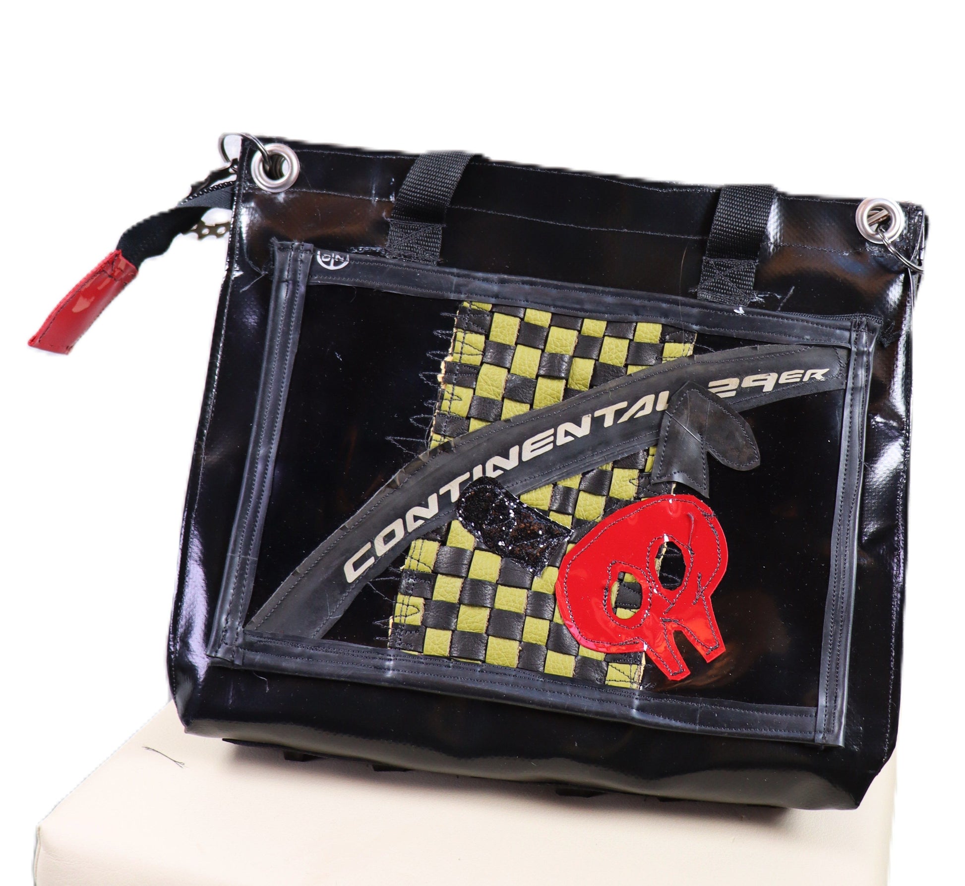 Handgefertigte Handtasche aus LKW Plane, mit Ledertaschen links und rechts. Im Innenbereich befindet sich ein großer Raum mit einem kleinen Seitenfach für die Geldbörse. Die Tasche kann durch einen mowi69 Gurt ,für die Schulter ergänzt werden.