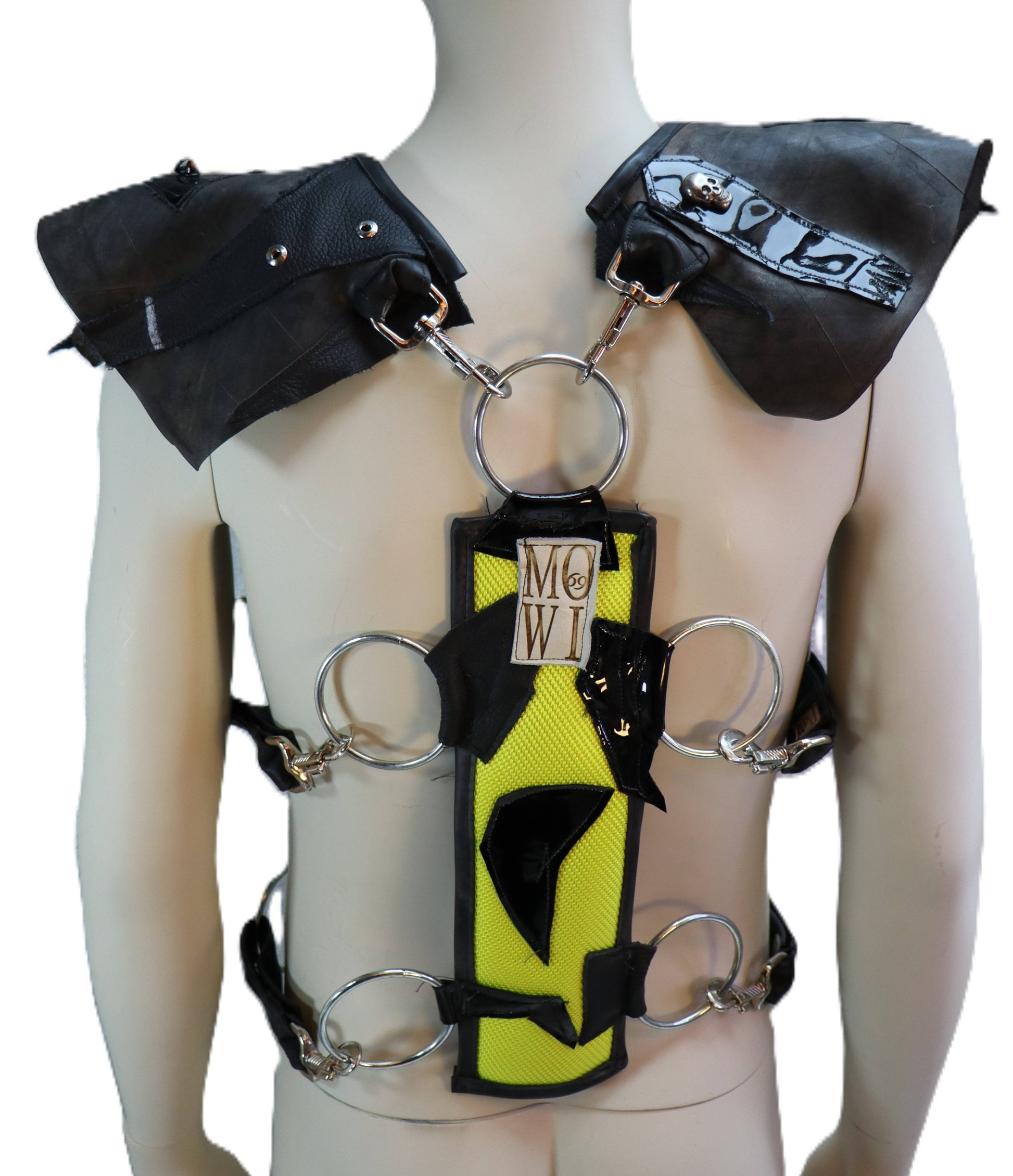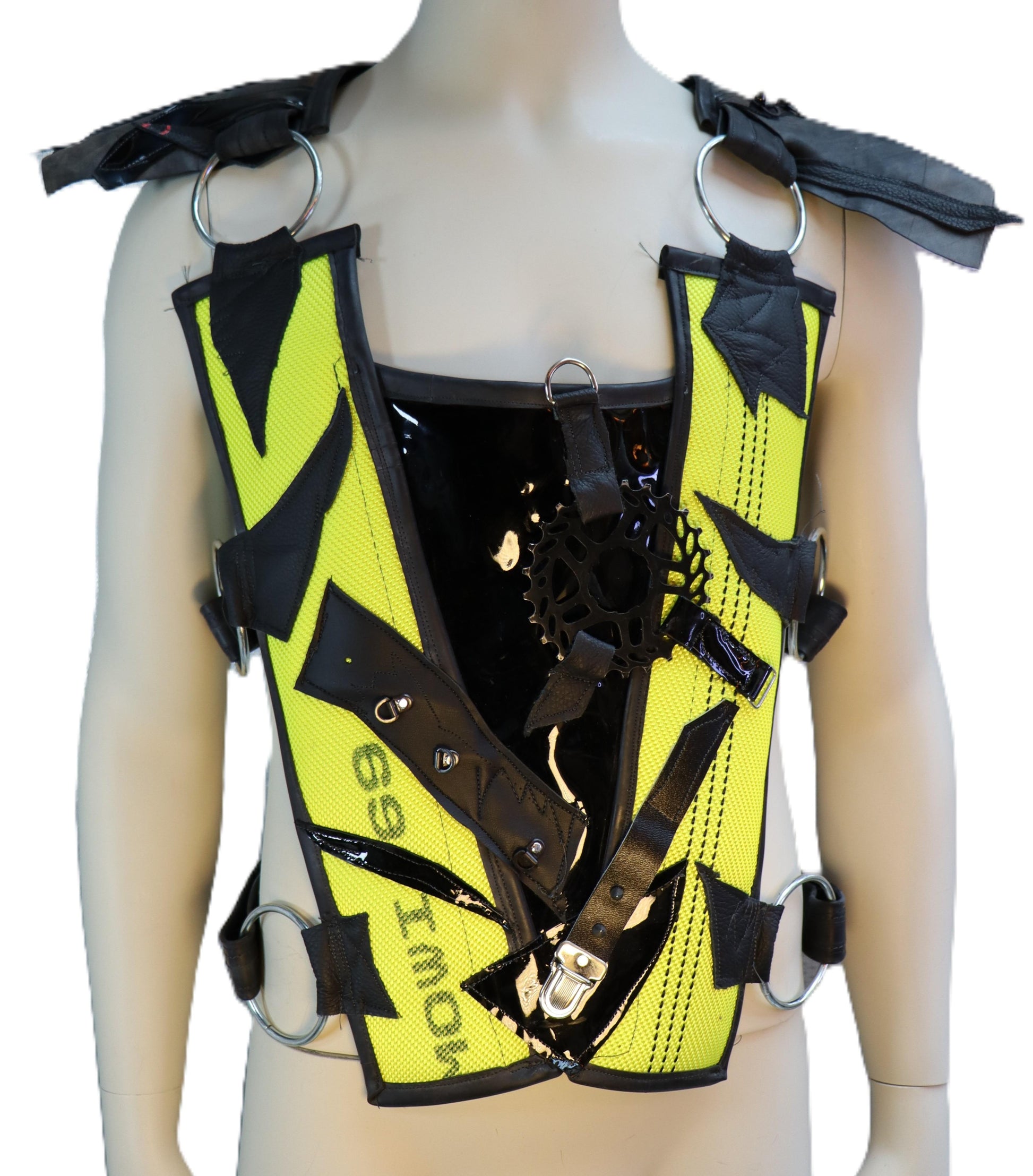 Harnisch aus neon gelben Feuerwehrschlauch und schwarzem Lackleder.