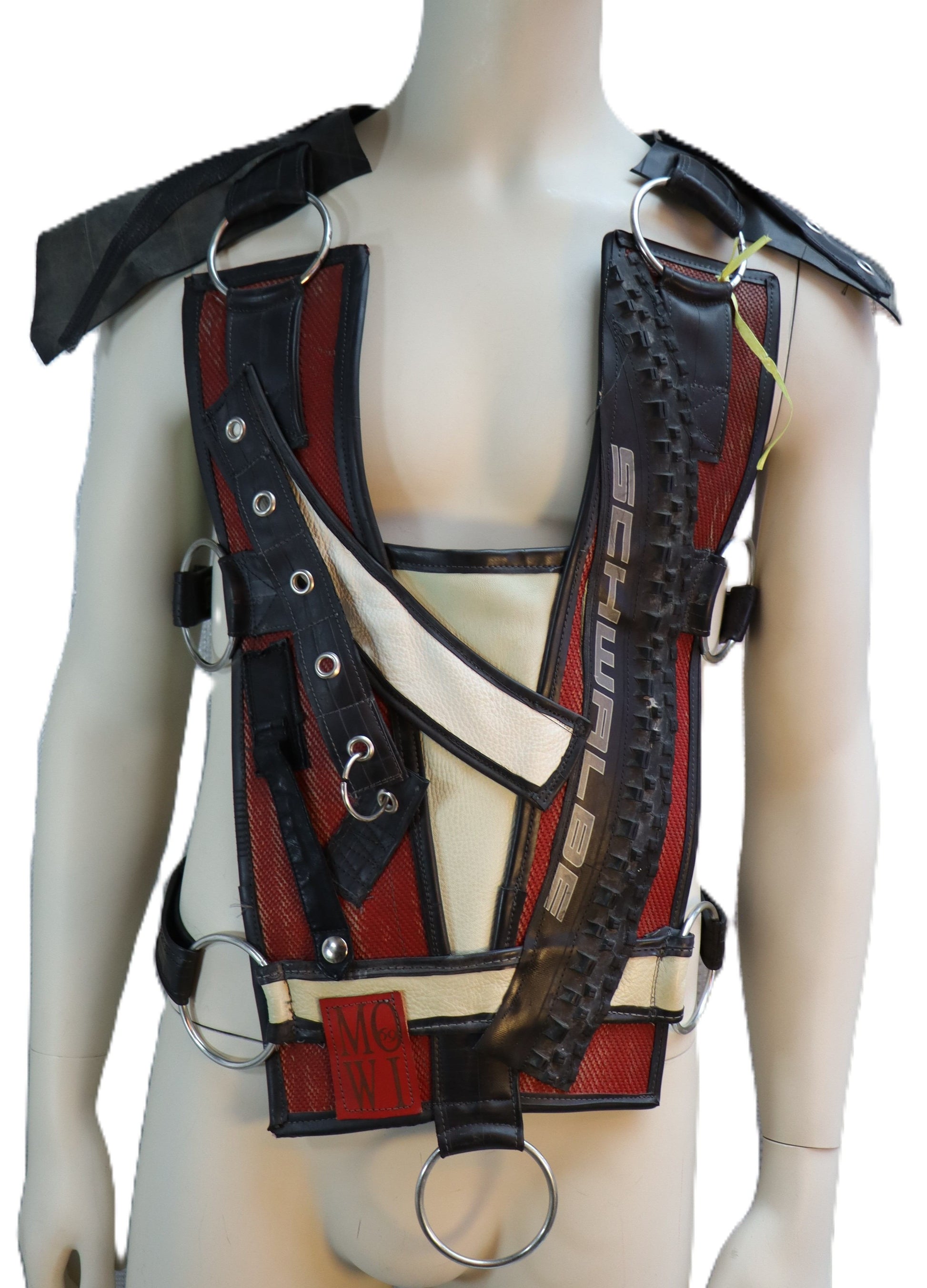Harnisch, hergestellt aus Feuerwehrschlauch und Leder. Dieser Harnisch wird an den Seiten und der Schulter durch das mowi69 Gurtsystem verbunden, wodurch es in der Weite verstellbar ist. Jedes Oberteil ist ein Unikat.