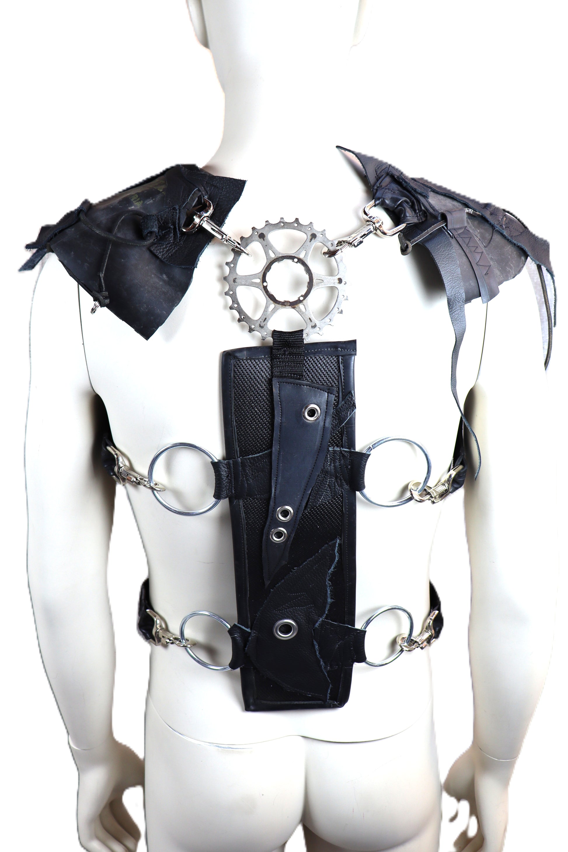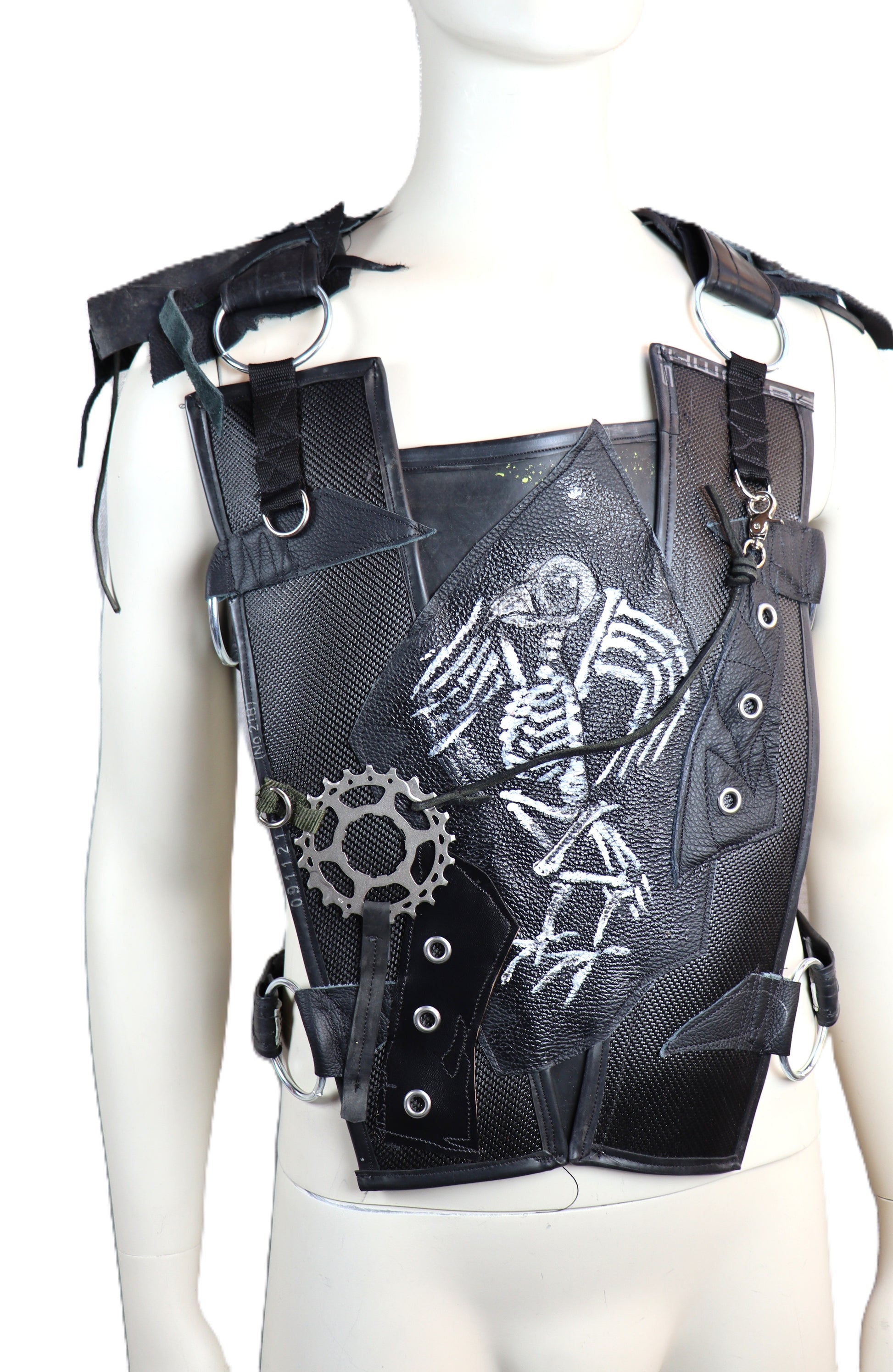 Handgefertigter Harnisch aus schwarzem Feuerwehrschlauch mit Rabenskelett. Durch die mowi69 Gurte an den Seiten, kann die Weite individuell verstellt werden.