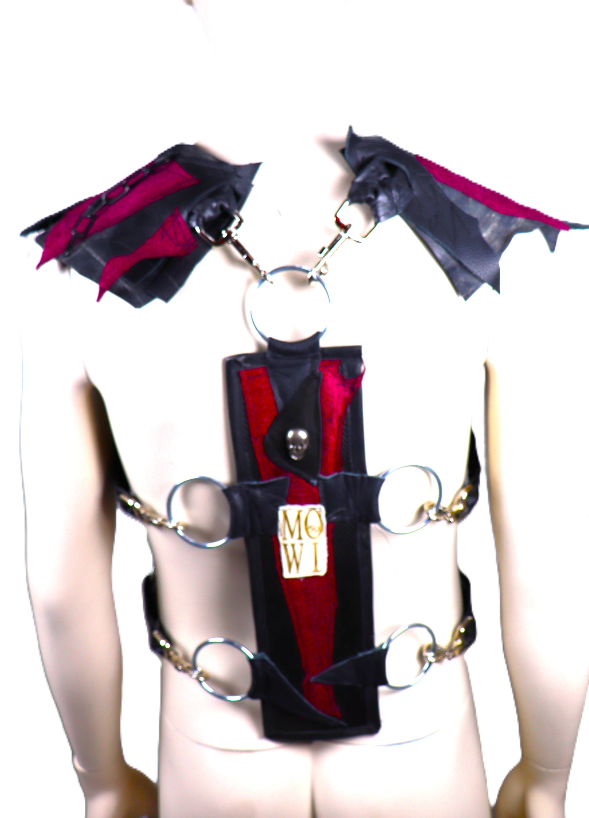 Handgefertigter Harnisch aus schwarzem Feuerwehrschlauch. Der Harnisch kann an den Seiten und der Schulter durch mowi69 Gurte in der Weite und Länge angepasst werden.