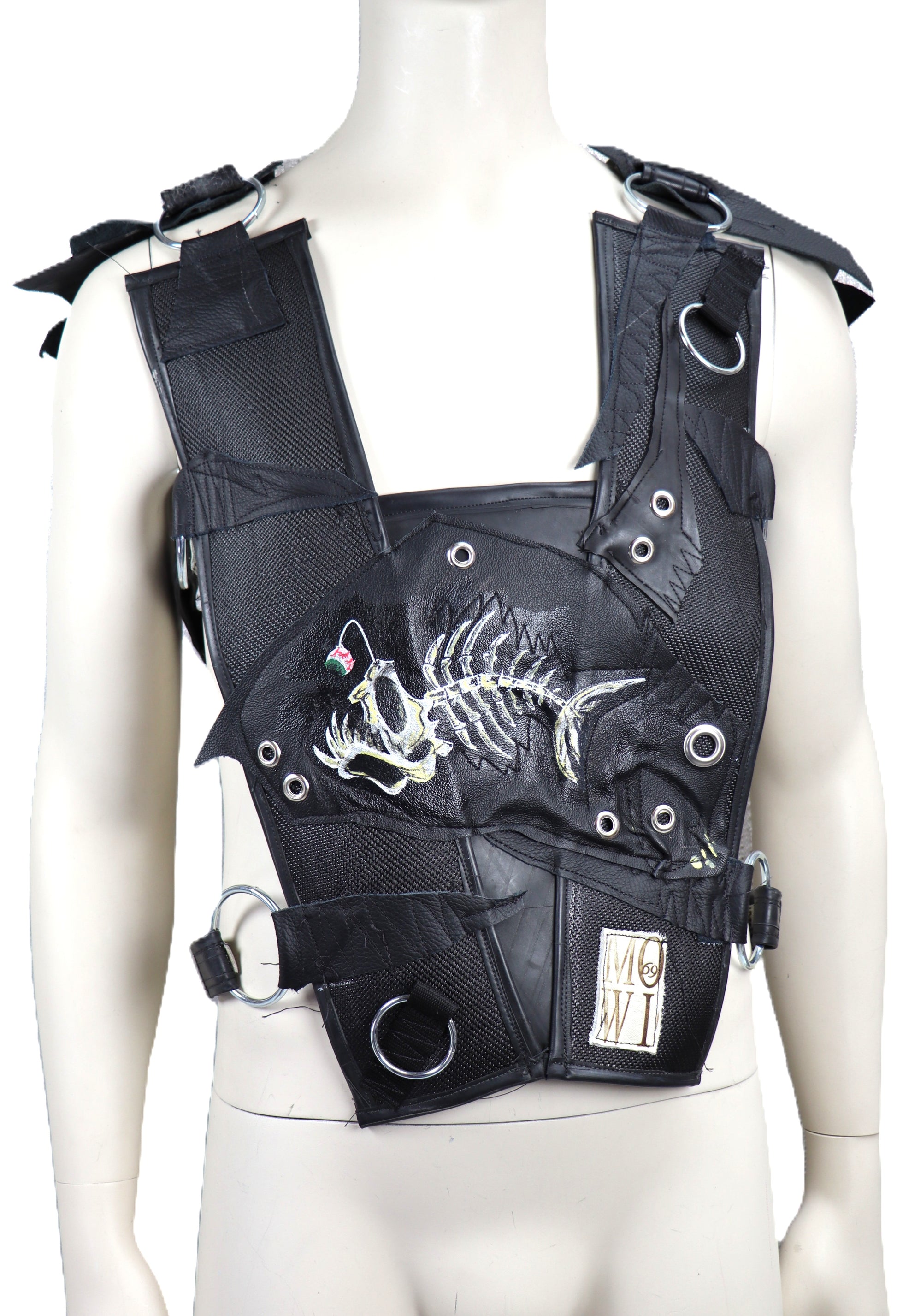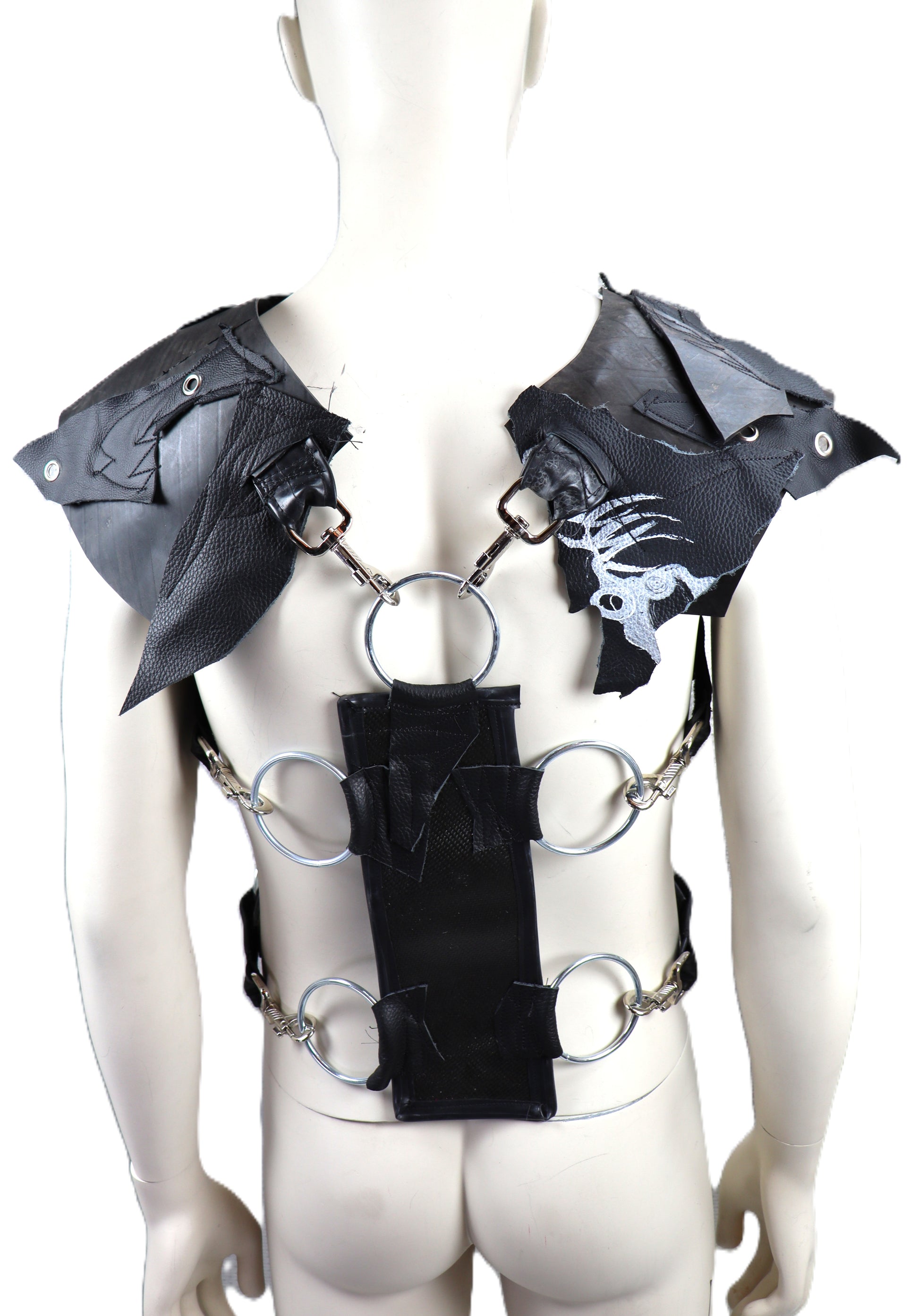 Handgefertigter Harnisch aus schwarzem Feuerwehrschlauch mit Fischgräte. Durch mowi69 Gurte kann den Hanrisch an den Schultern und der Seite in der Weite und Länge angepasst werden.