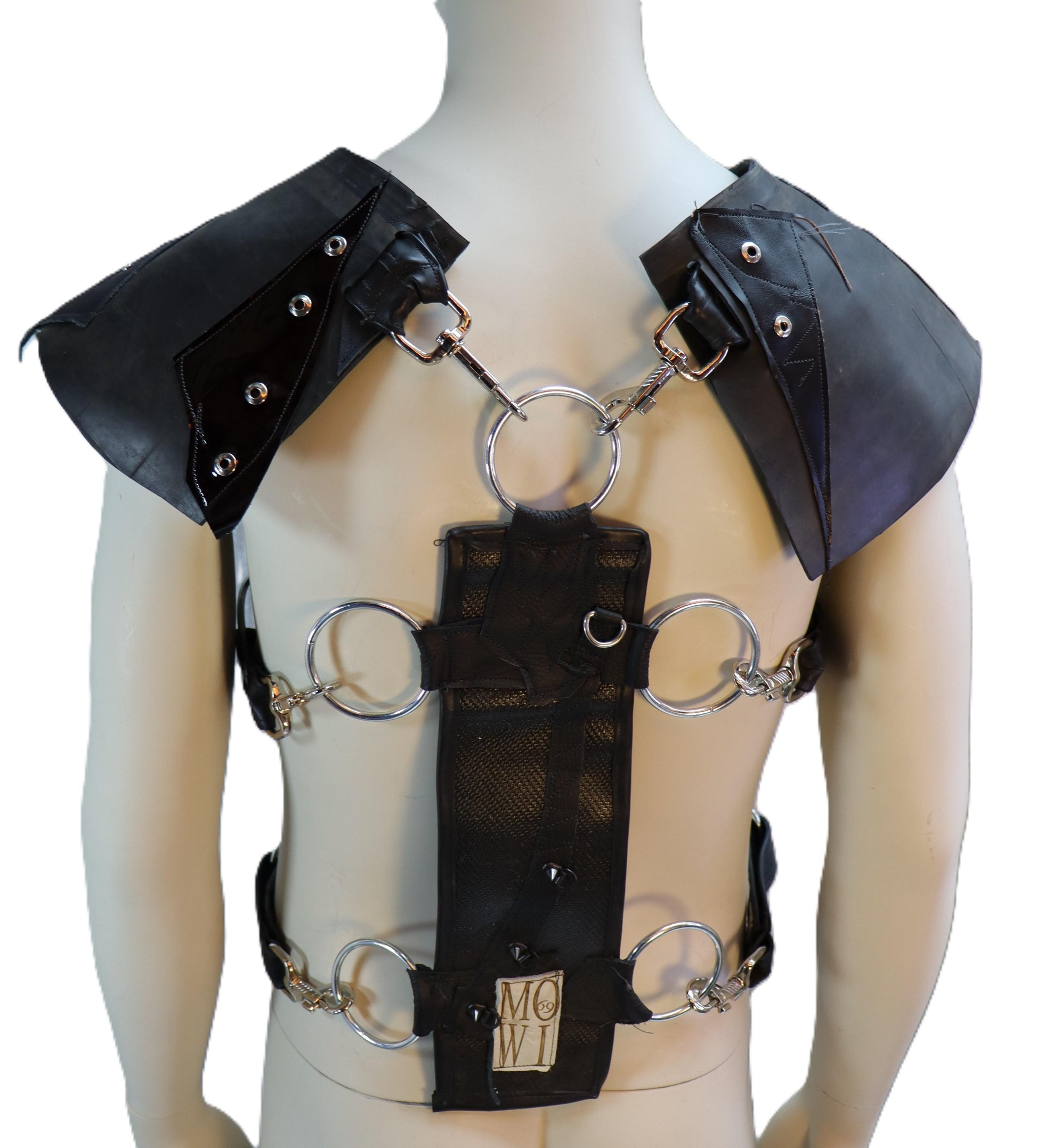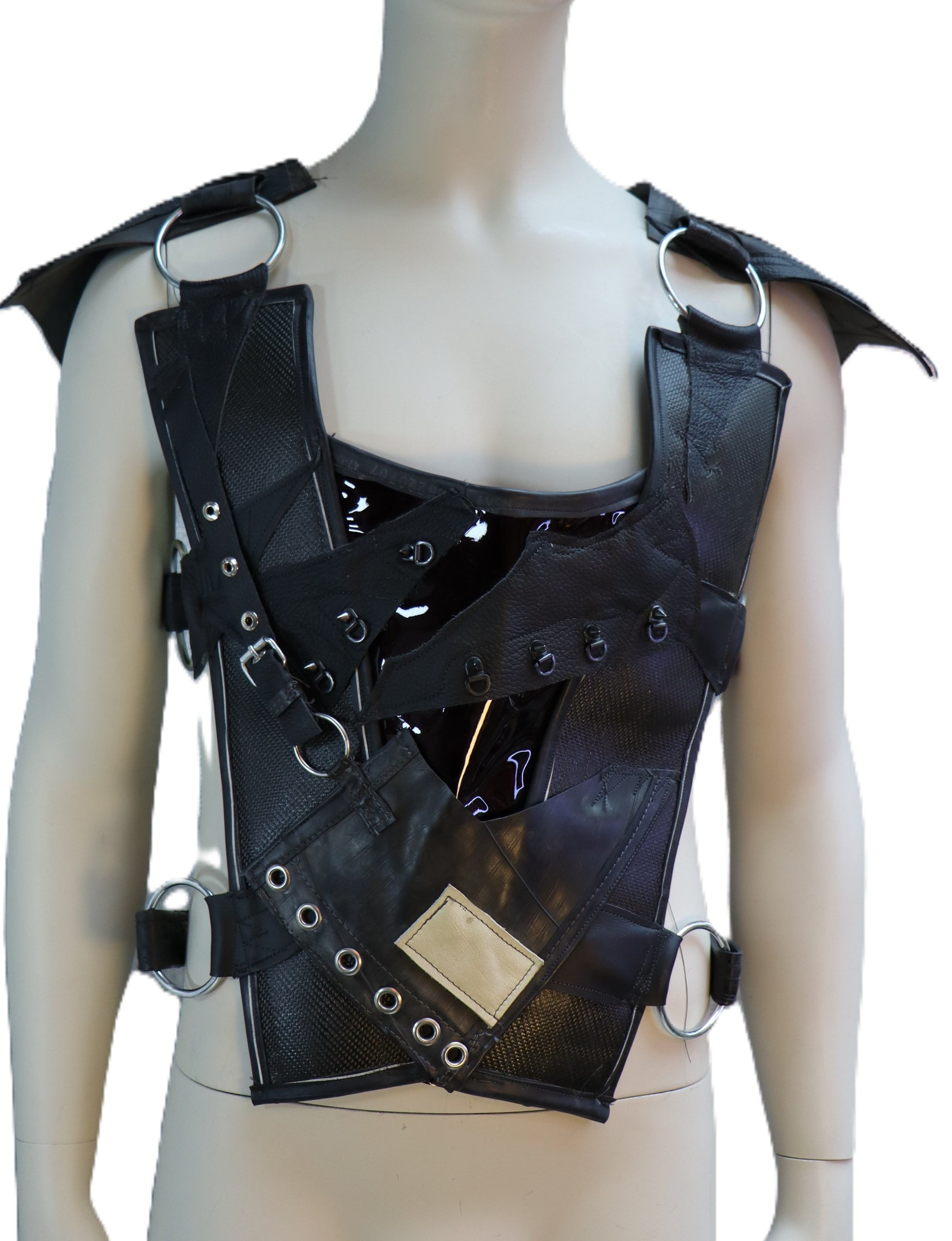 Handgefertigter Harnisch aus schwarzem Feuerwehrschlauch, Gummi und dunkel weinrotem Leder in Lack Optik. Das Oberteil wird an den Seiten und auf der Schulter durch unser mowi69 Gurtsystem zusammen gehalten , wodurch es in der Weite angepasst werden kann.