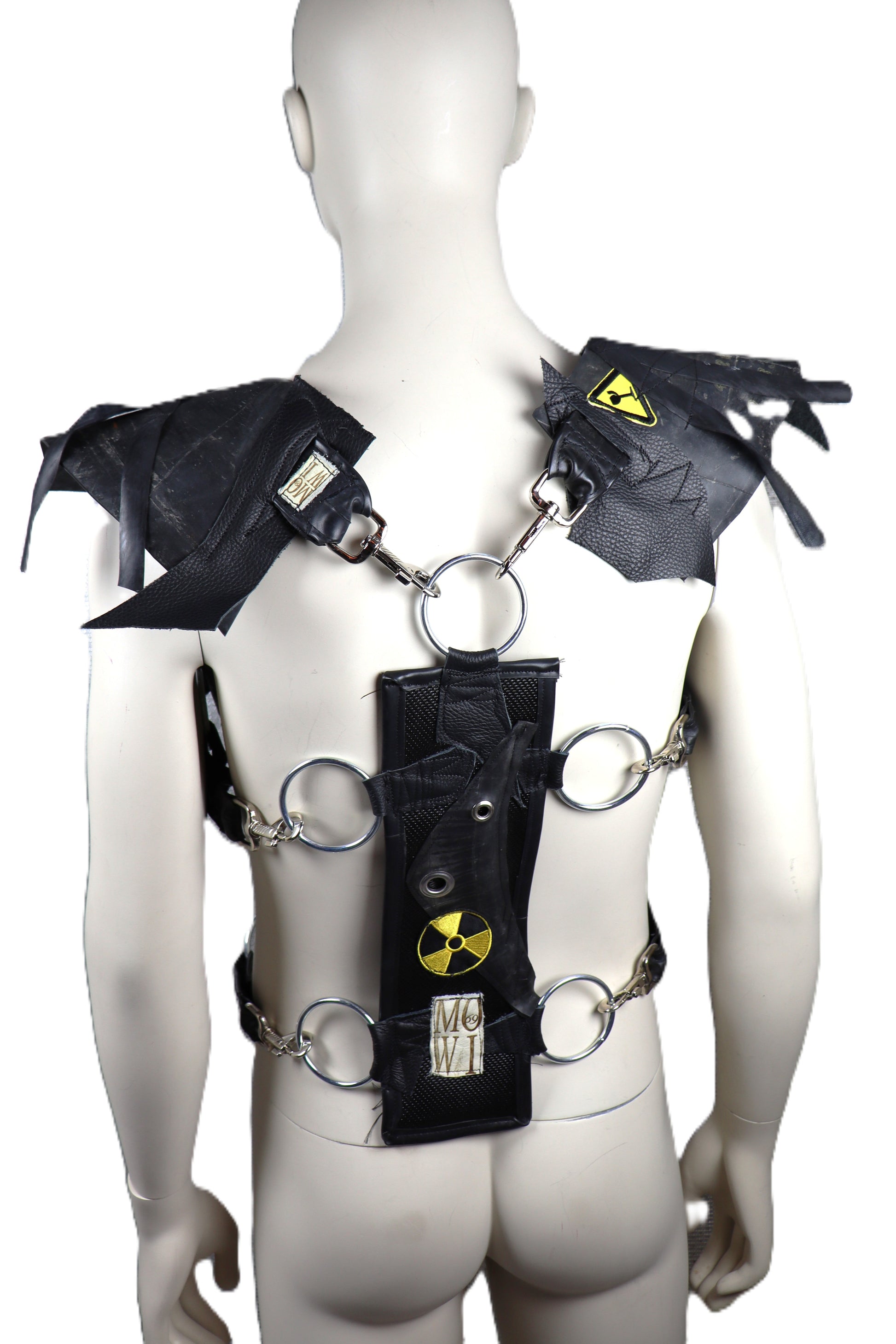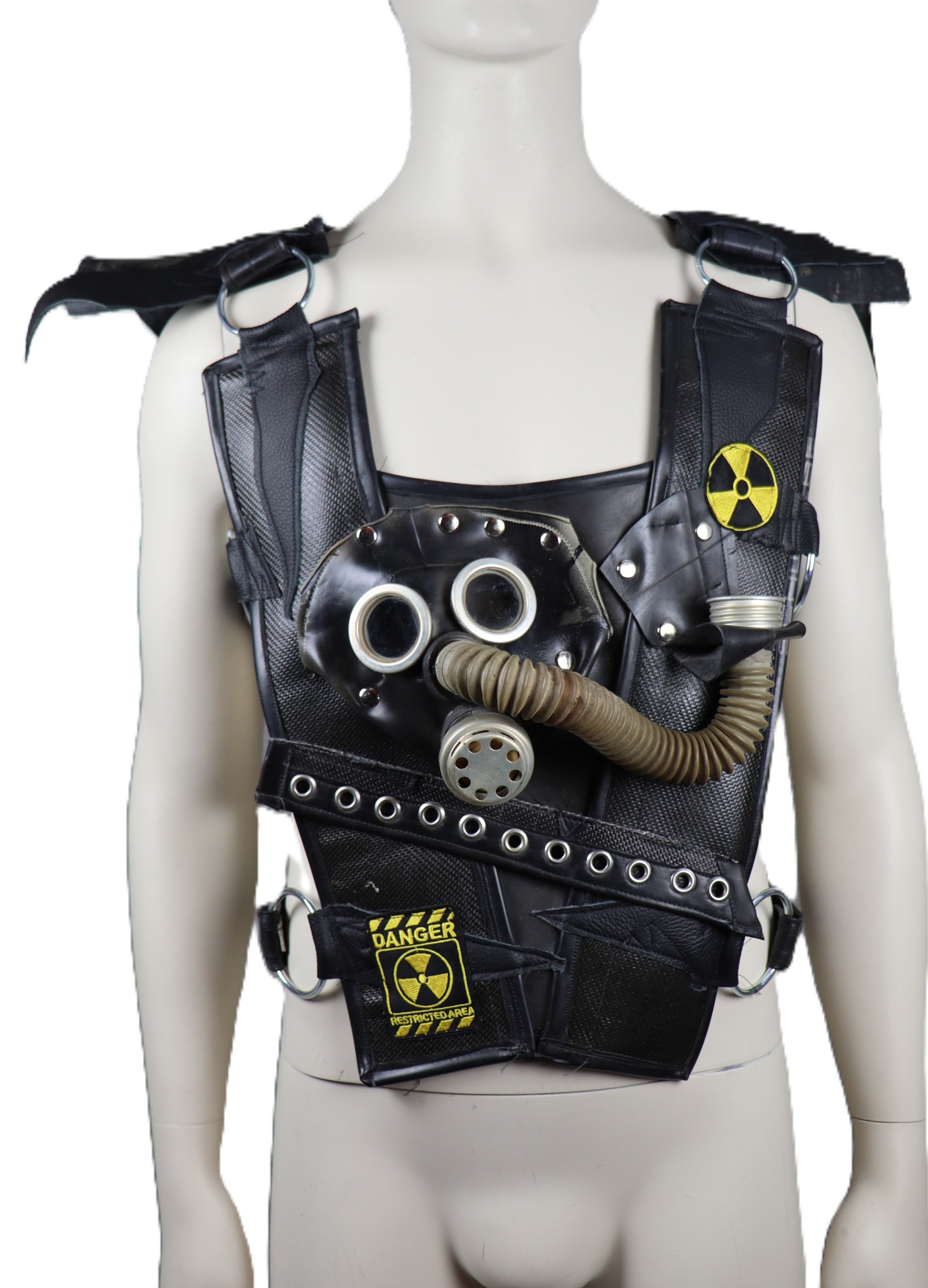 Handgefertigter Harnisch aus schwarzem Feuerwehrschlauch mit Gasmaske. Die Weite des Harnisch kann durch mowi69 Gurte an den Seiten und Schultern individuell angepasst werden.