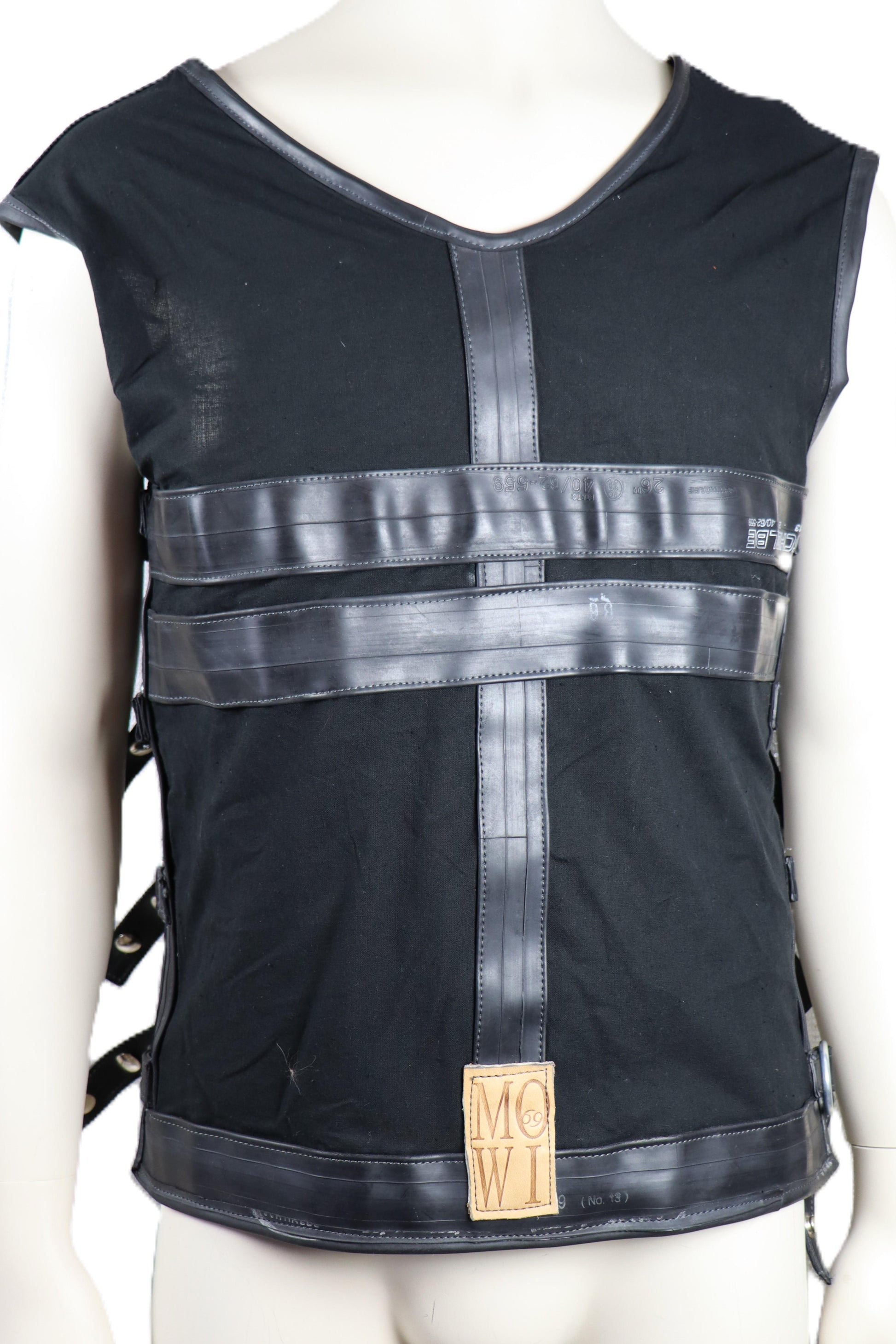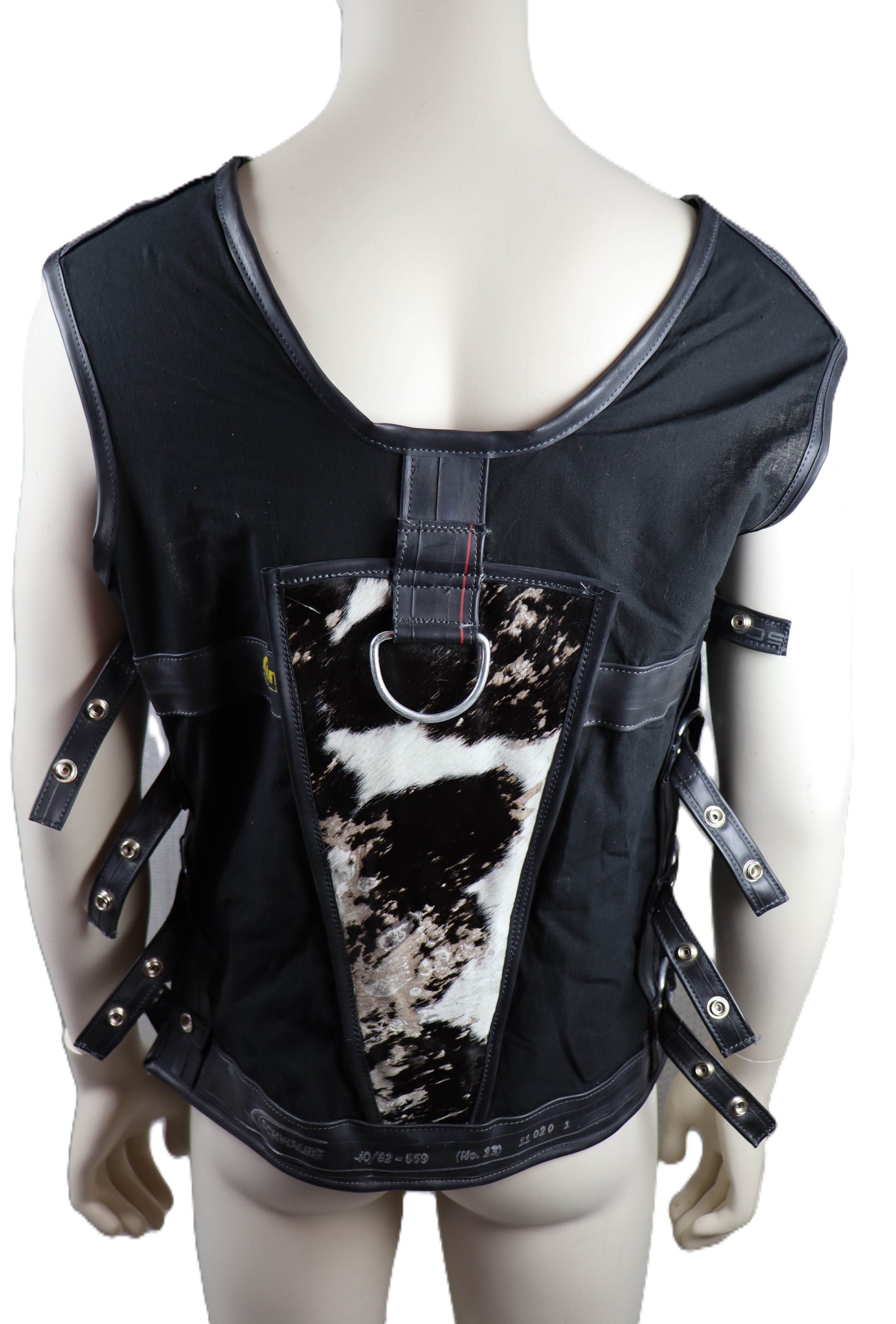 Handgefertigtes Hemd aus schwarzem Baumwollstoff, mit Gummi und Kuhfellapplikation . An den Seiten kann das Hemd durch Druckknöpfe angepasst werden.