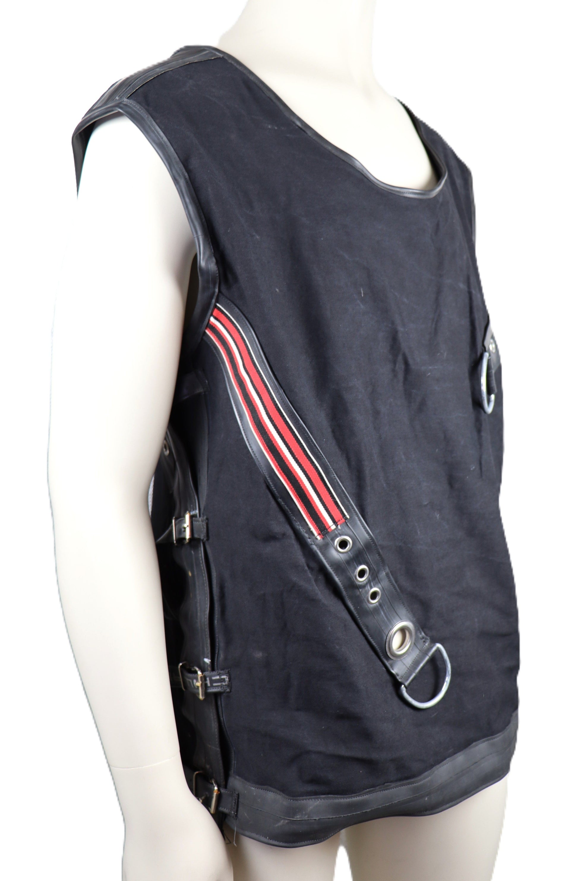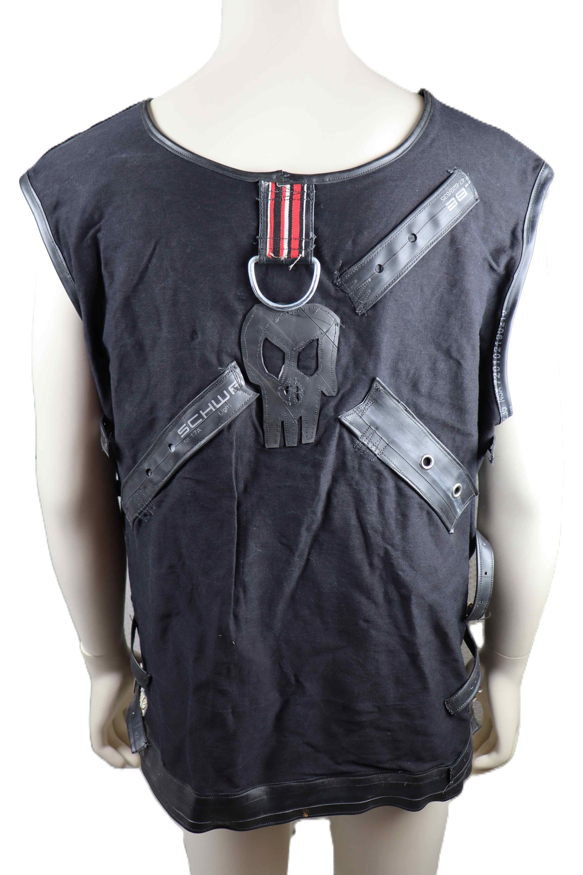 Handgefertigtes Hemd aus schwerem Baumwollstoff mit Gummiapplikationen, Kotenkopf und Metallelementen. Hemd kann an den Seiten durch Schnallen in der Größe verstellt werden.