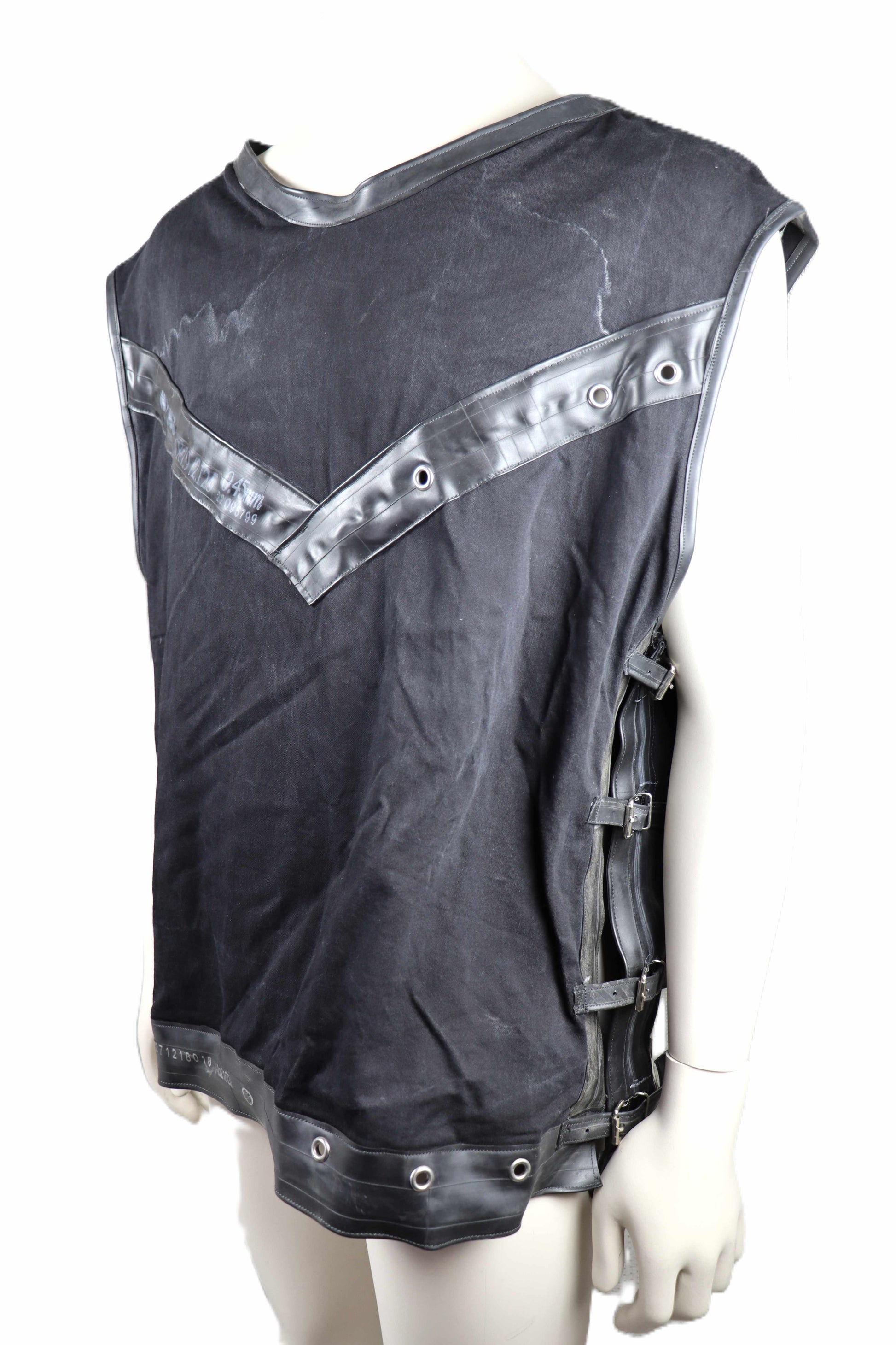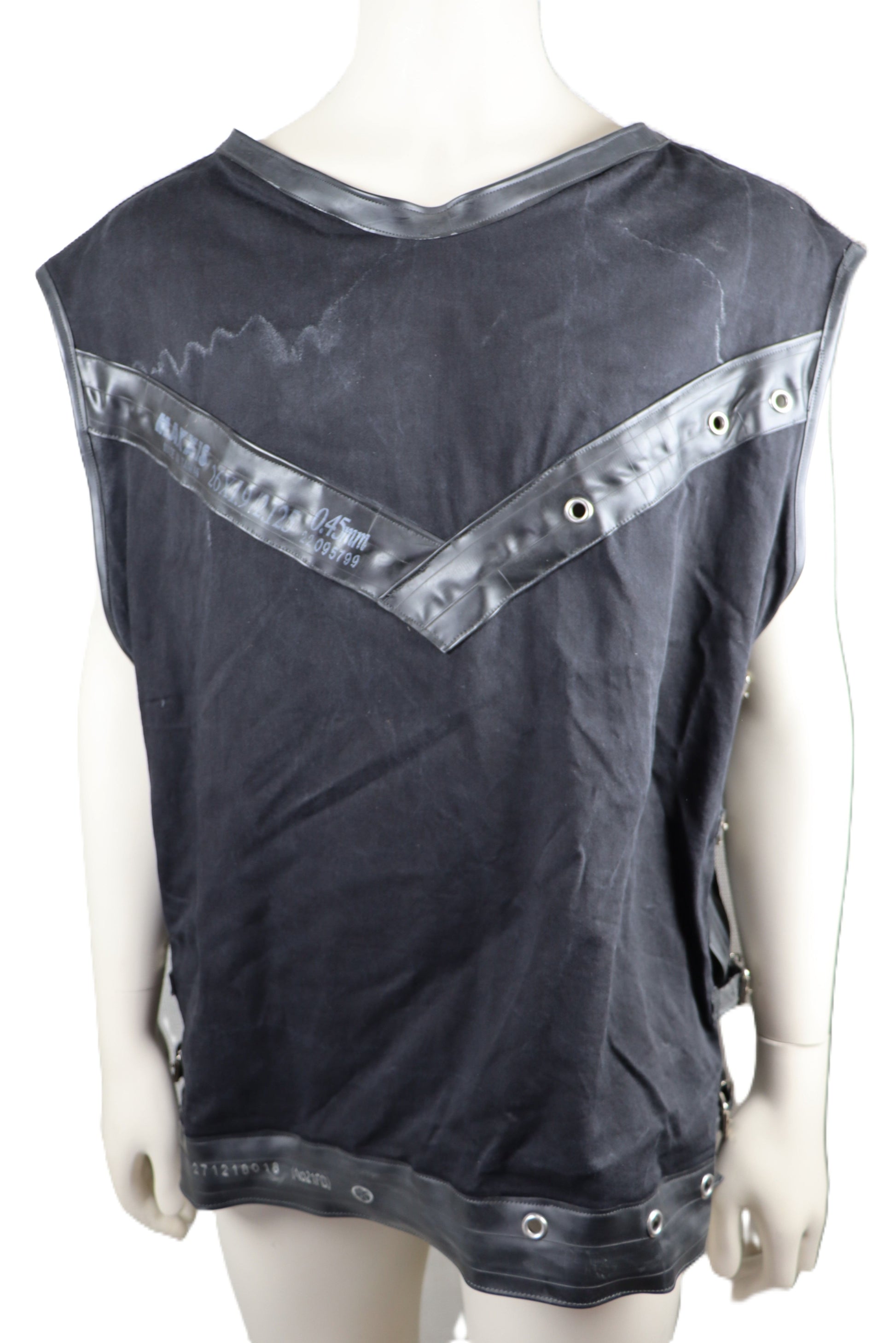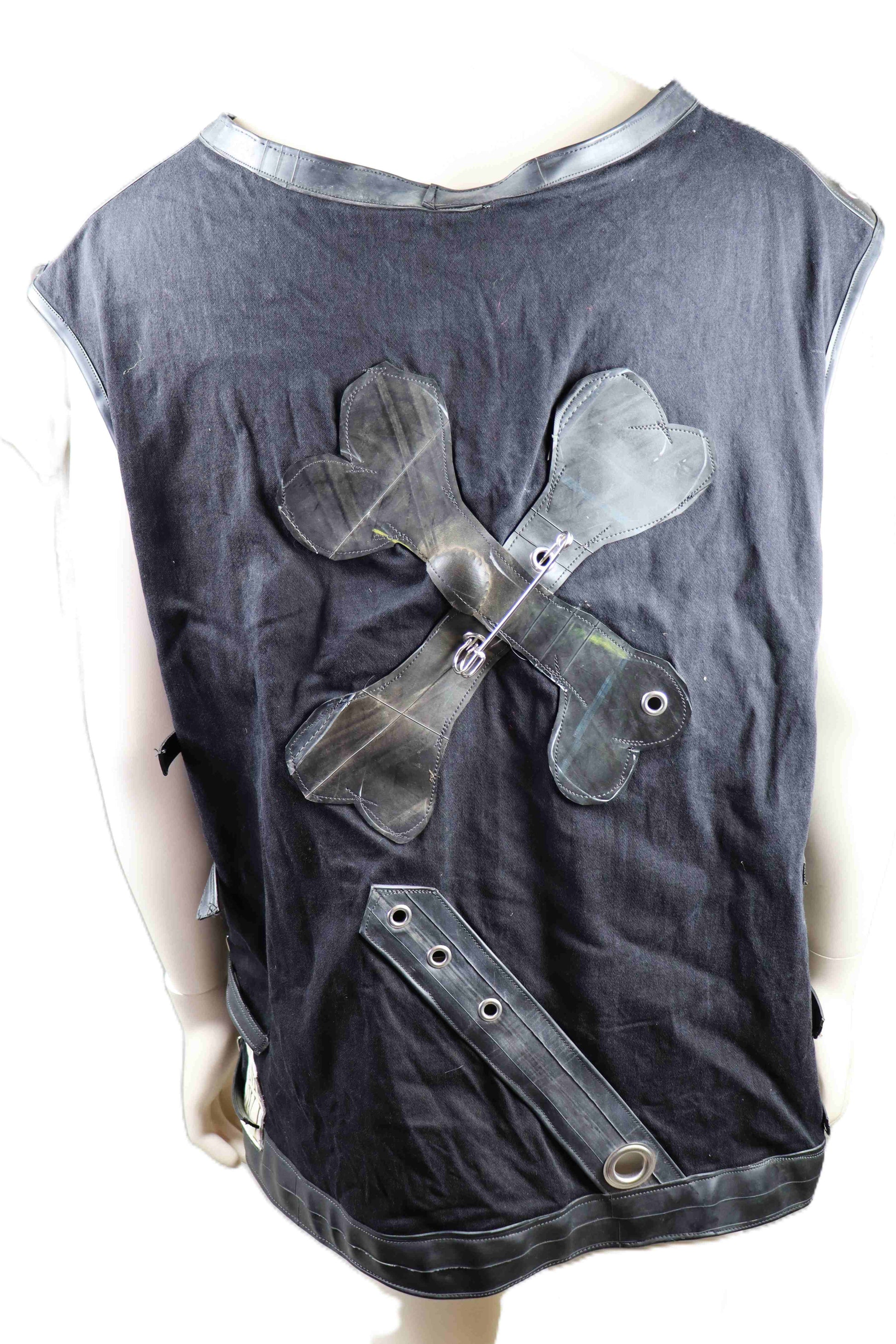 Handgefertigtes Hemd aus schwerem Baumwollstoff mit Gummiapplikation gekreuzte Knochen. Das Hemd kann an den Seiten durch Schnallen in der Größe verstellt werden.