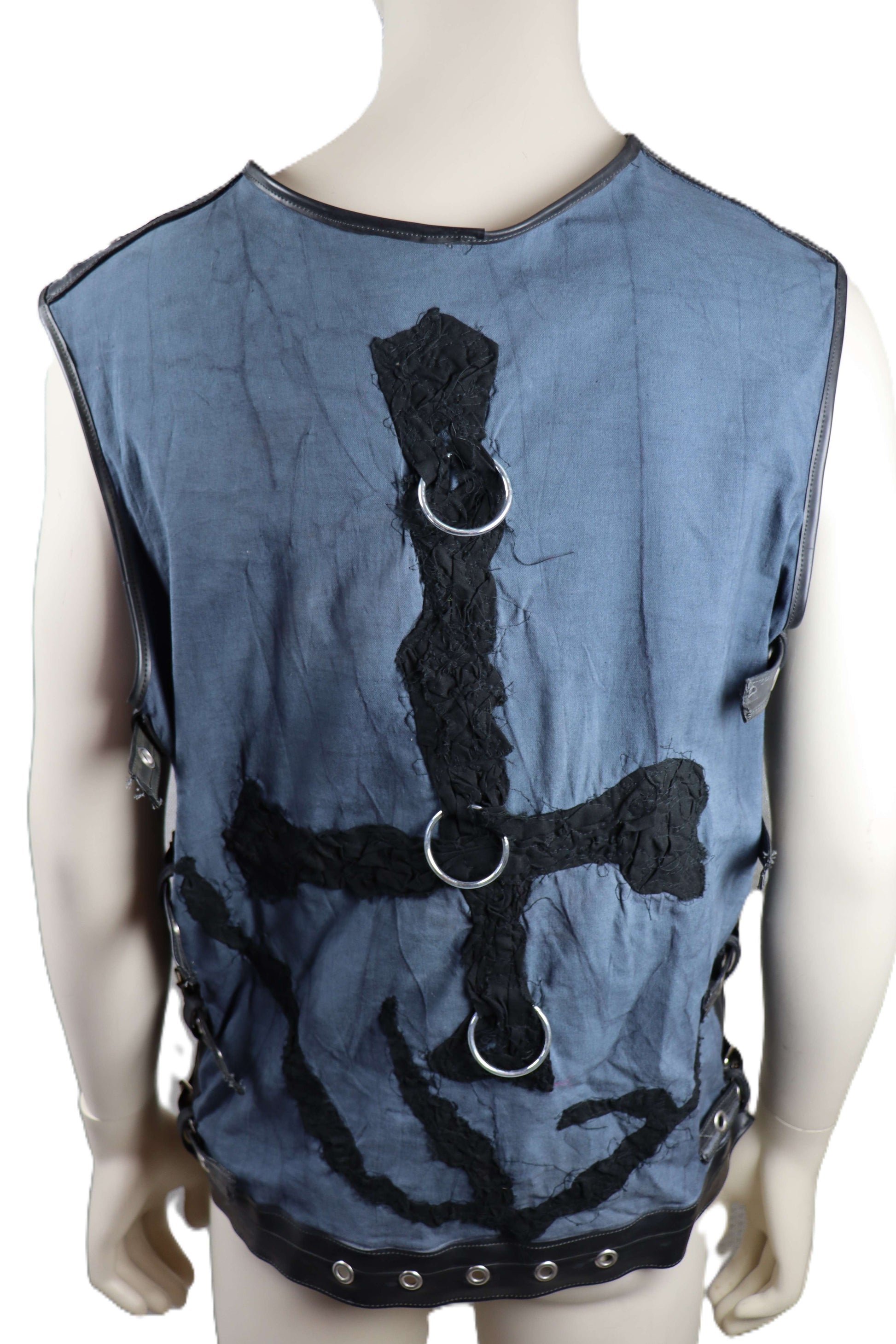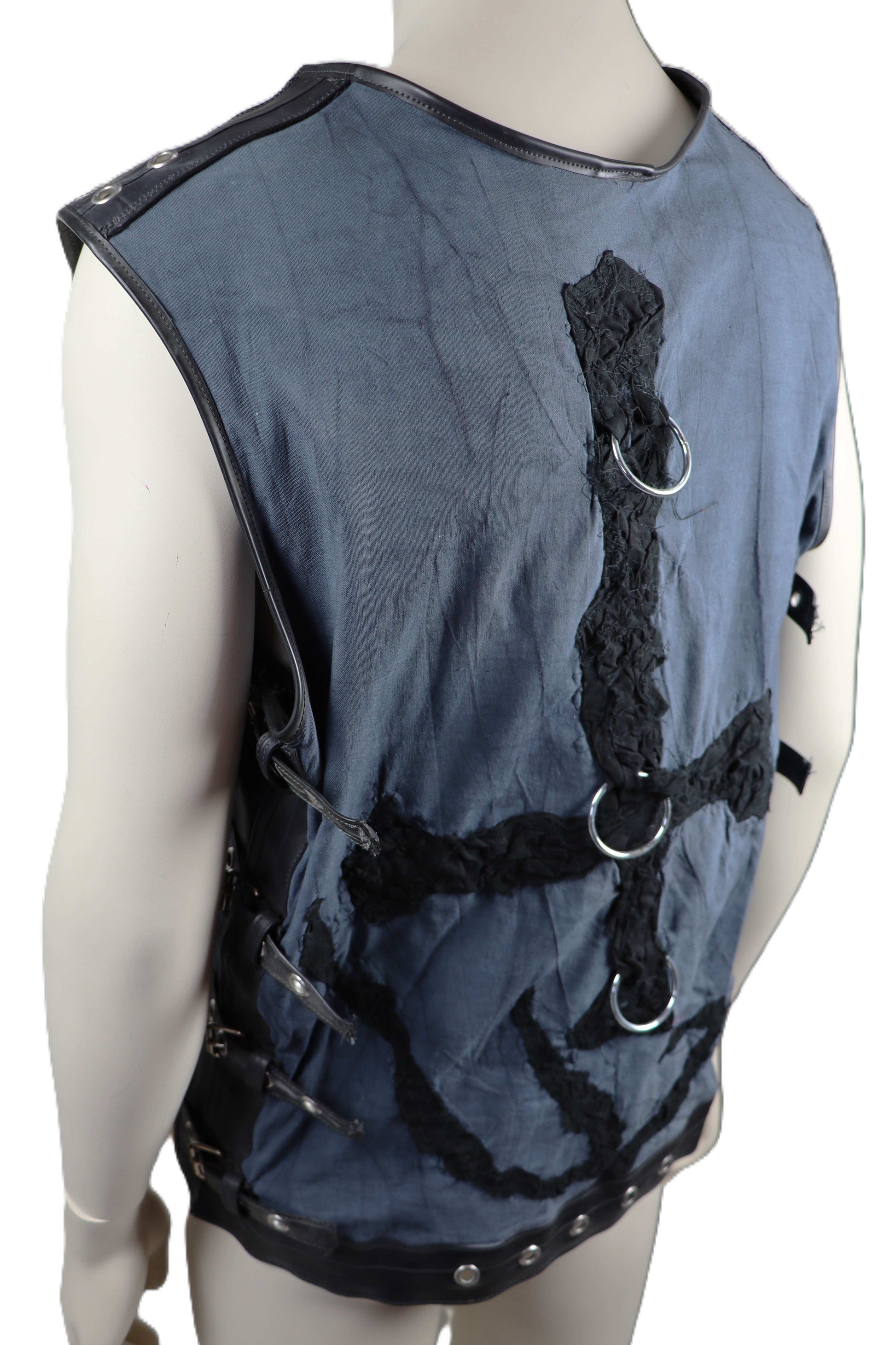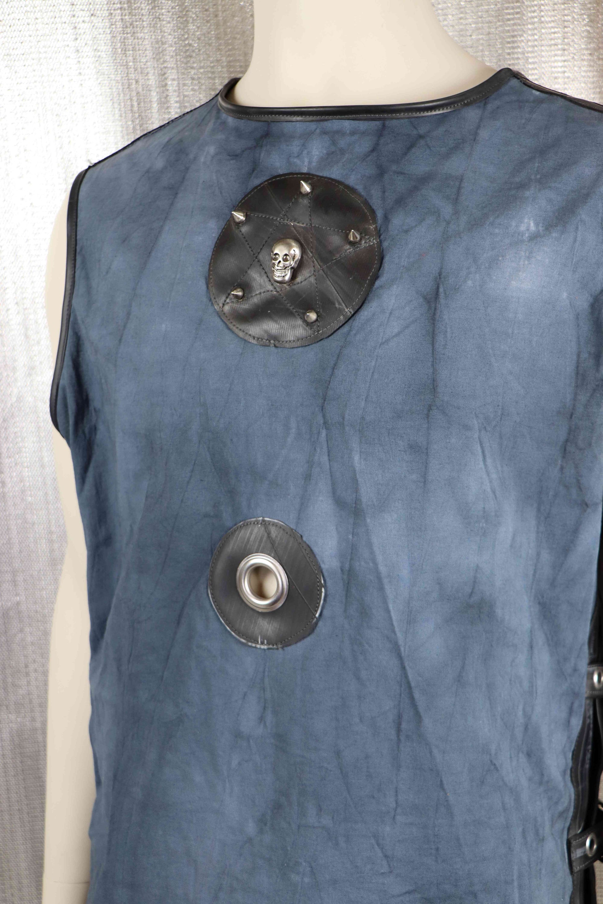 Handgefertigtes Hemd aus dunkelblauem, schwerem Baumwollstoff mit Applikationen.
