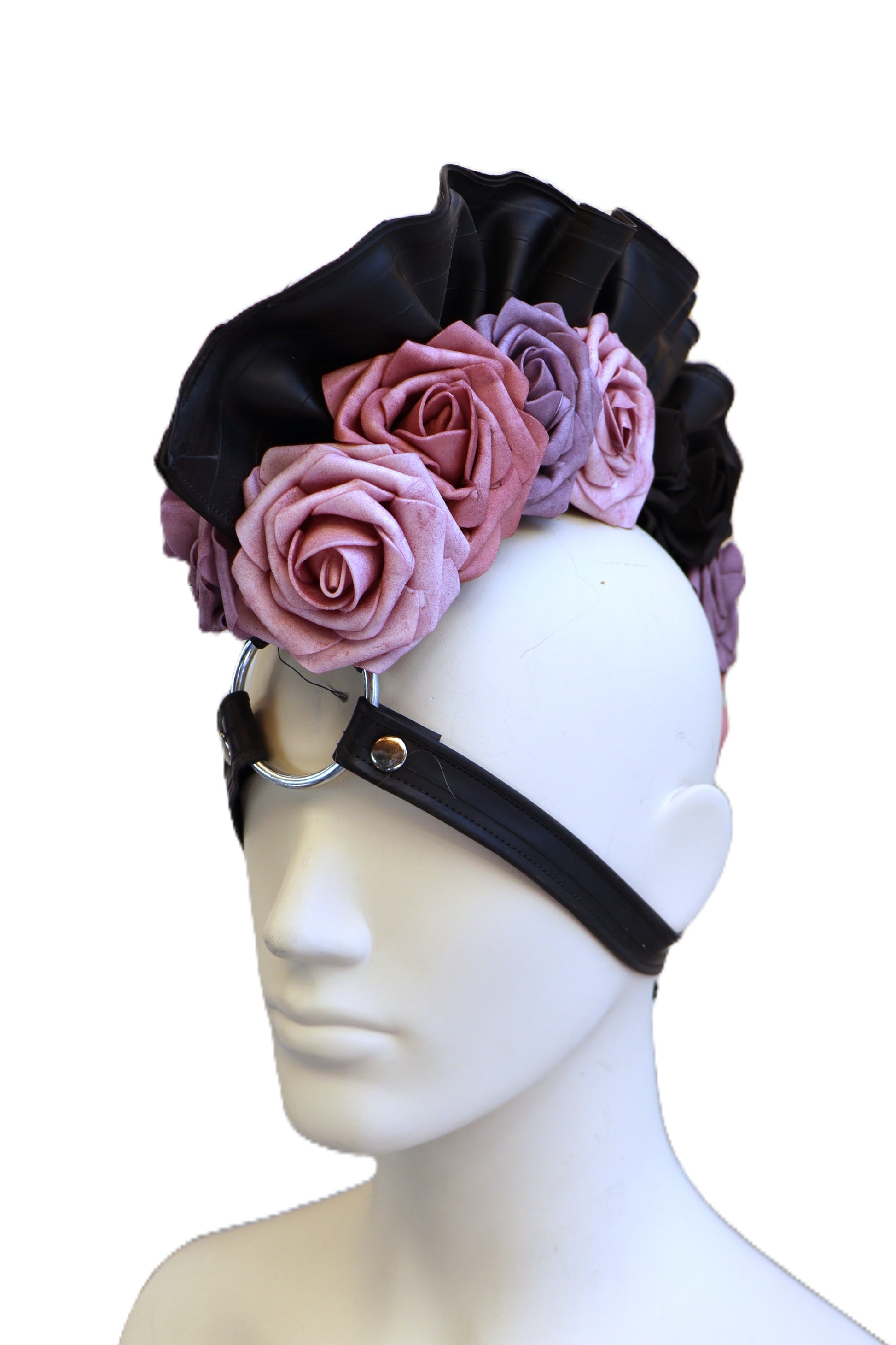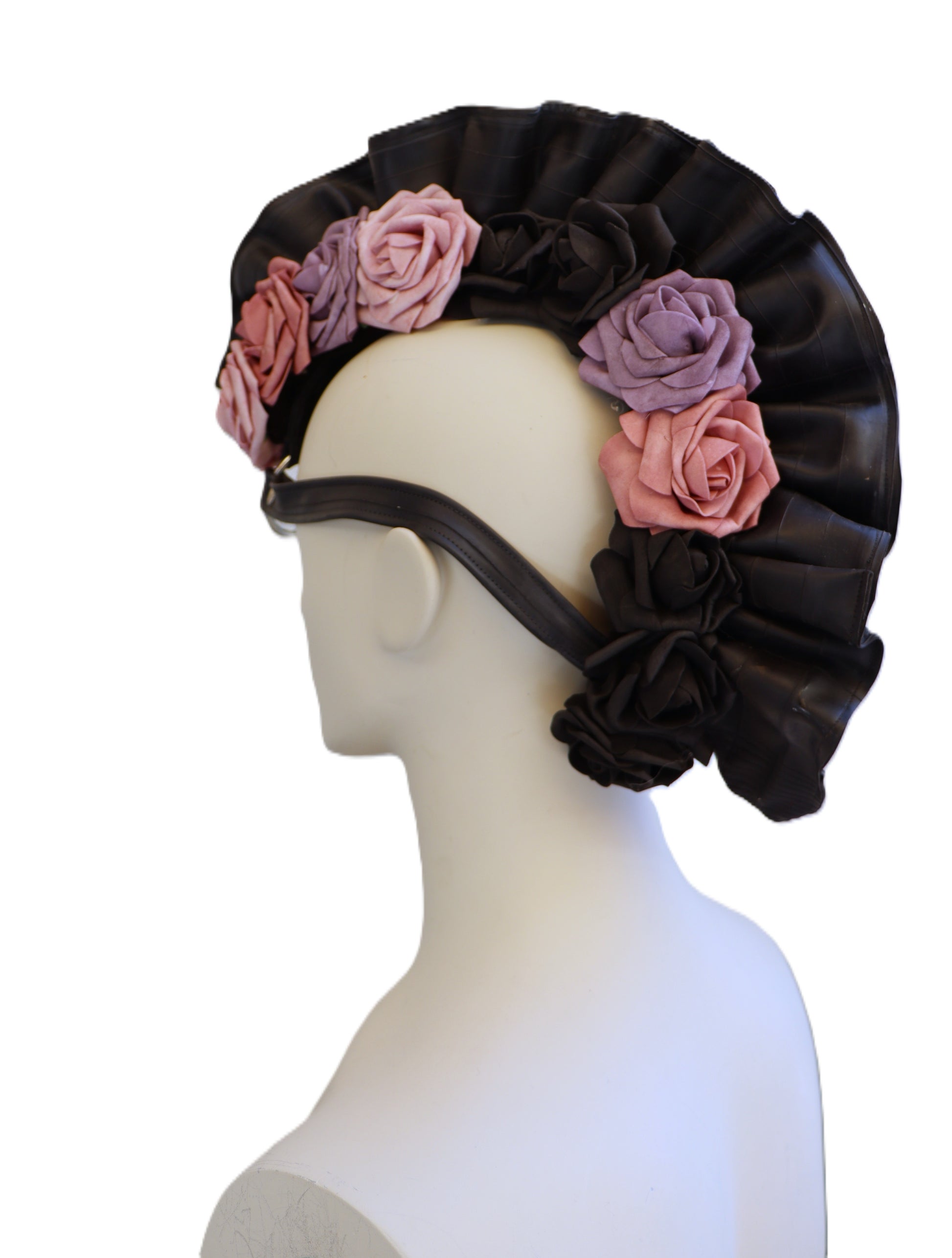 Handgefertigter Irokesenschnitte aus upgecyceltem Fahrradschlauch mit Schaumrosen violett und schwarz. Der Kopfschmuck wird durch den Gurt am Kopf befestigt.