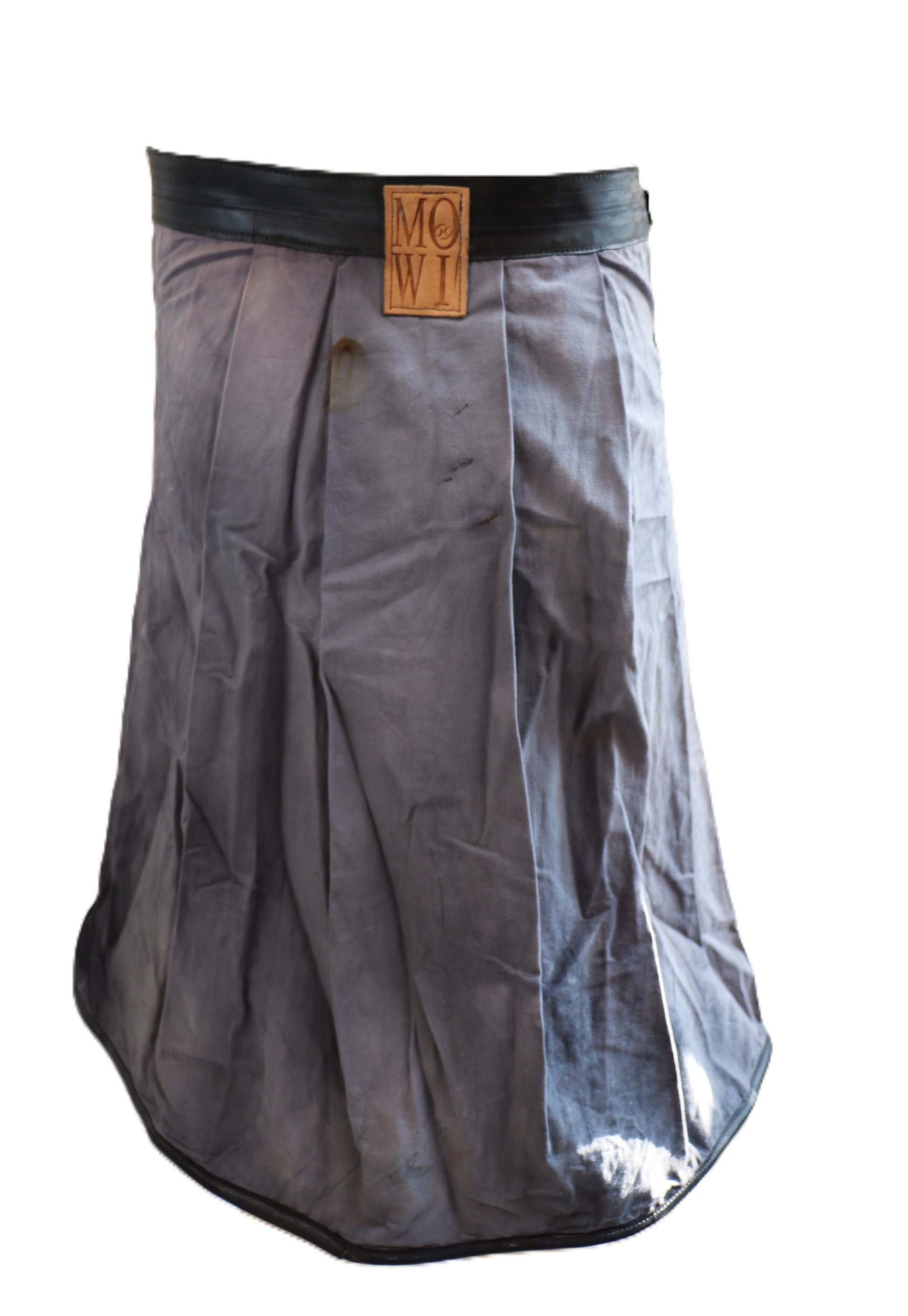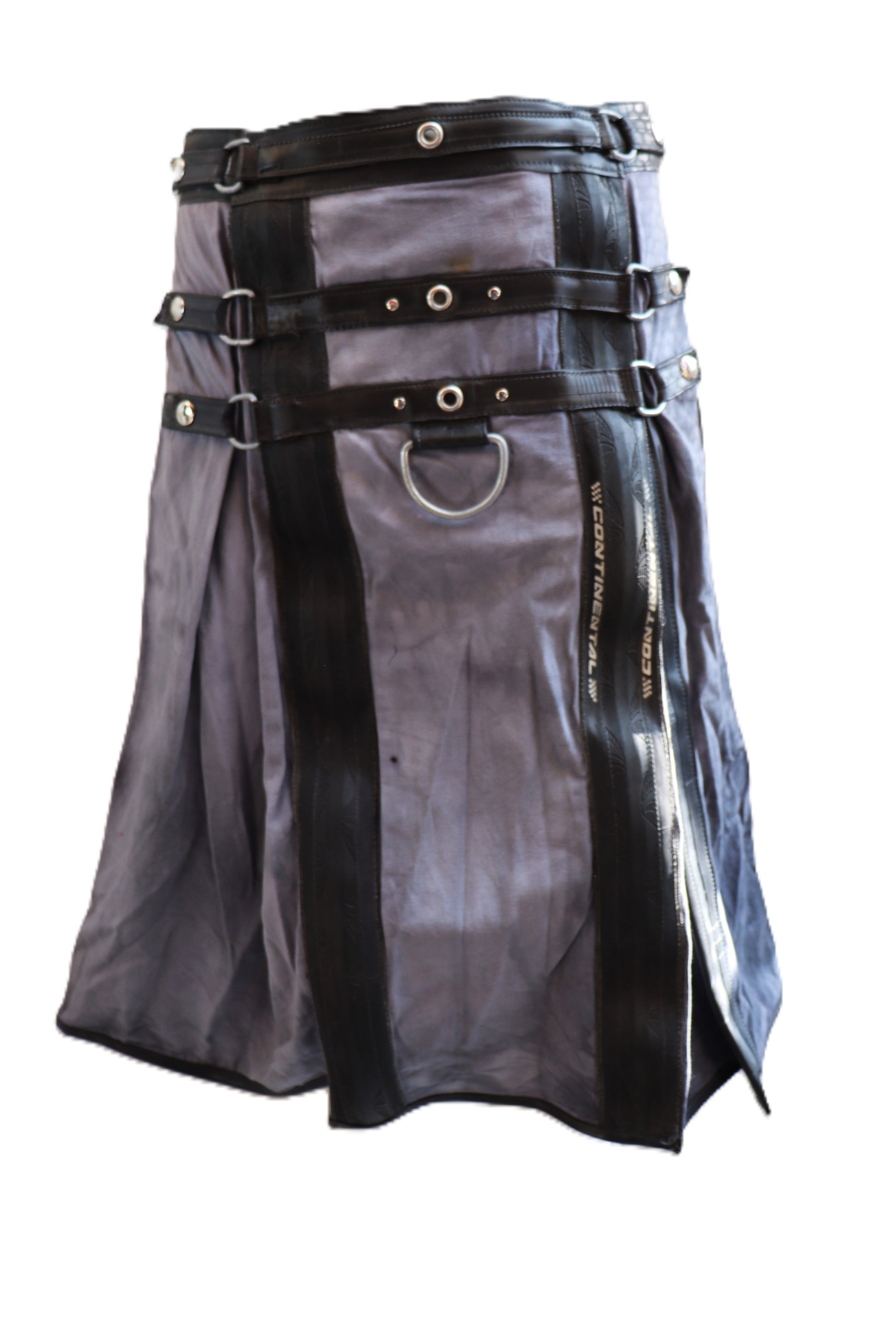 Handgefertigter Kilt aus schwerem Stoff mit Fahrradprofil Applikationen.
