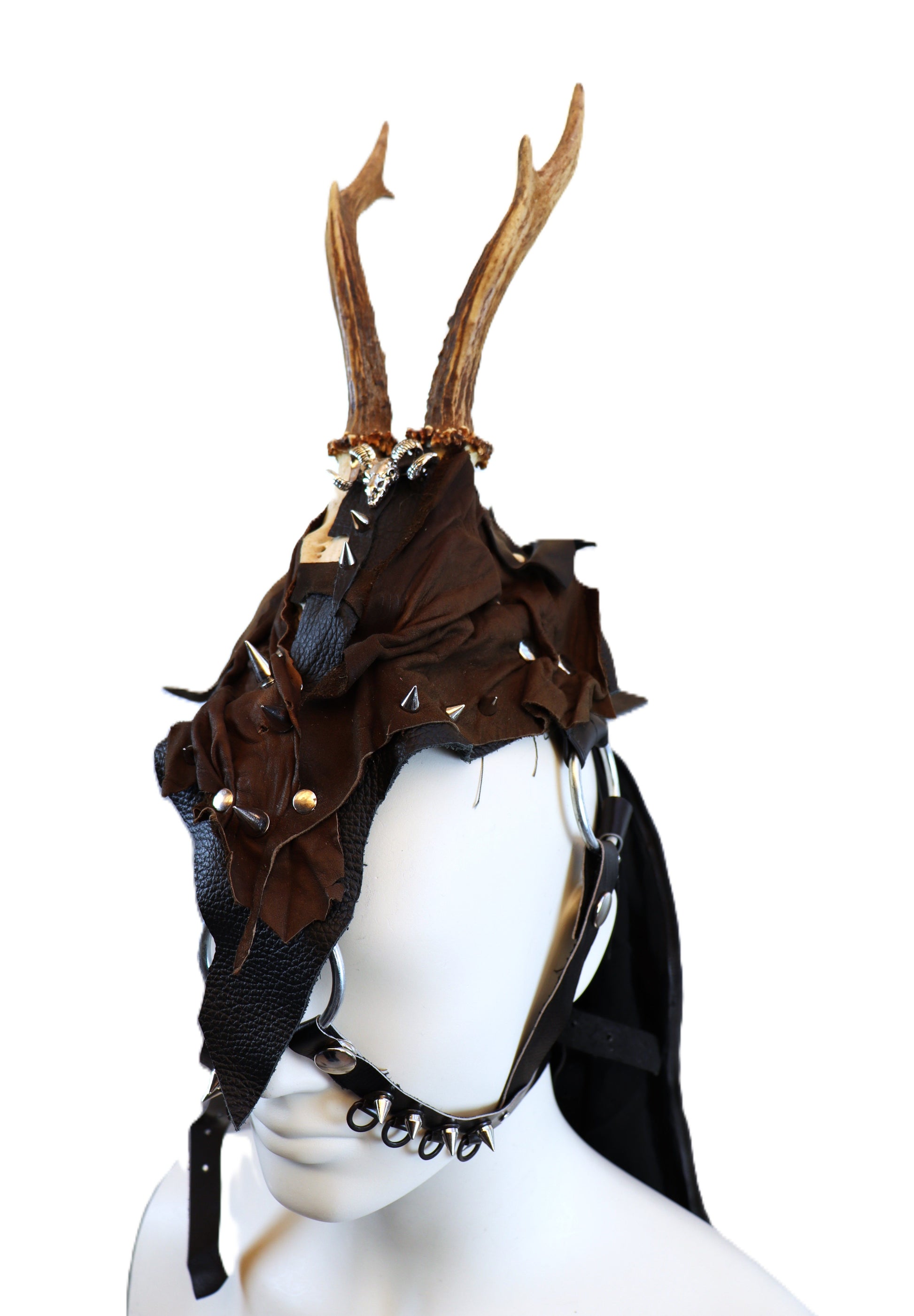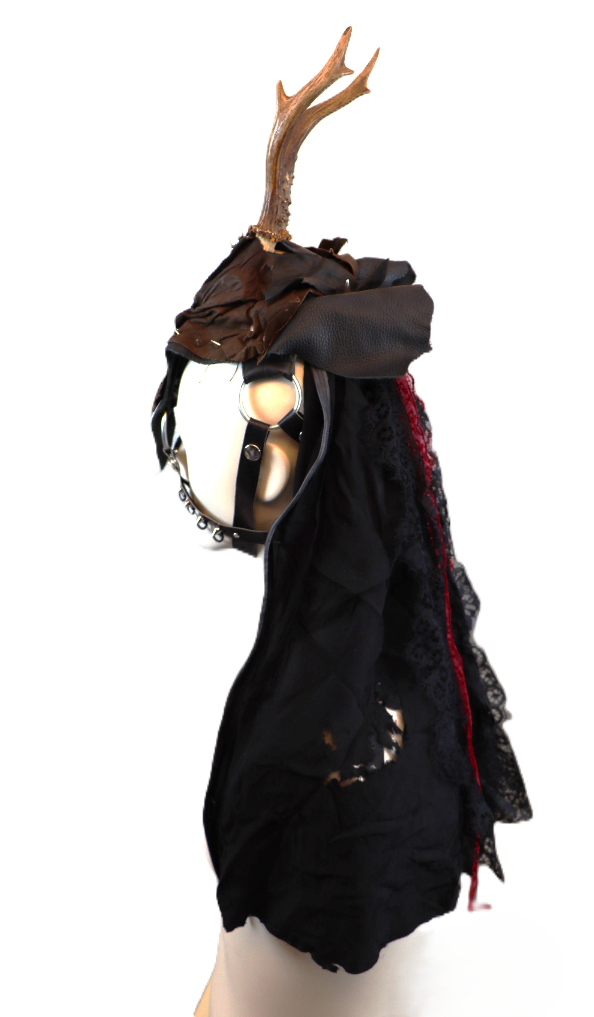 Handgefertigter Kopfschmuck aus Leder mit Rehgeweih. Der Schleier kann durch einen Druckknopf abgenommen werden. Die Löcher im Stoff sind beabsichtigt um einen morbiden Eindruck zu verstärken. Befestigt wird das Headpice durch einen Gurt am Hinterkopf, welcher durch Haarnadeln und das einarbeiten in eine Frisur unterstützt werden kann.