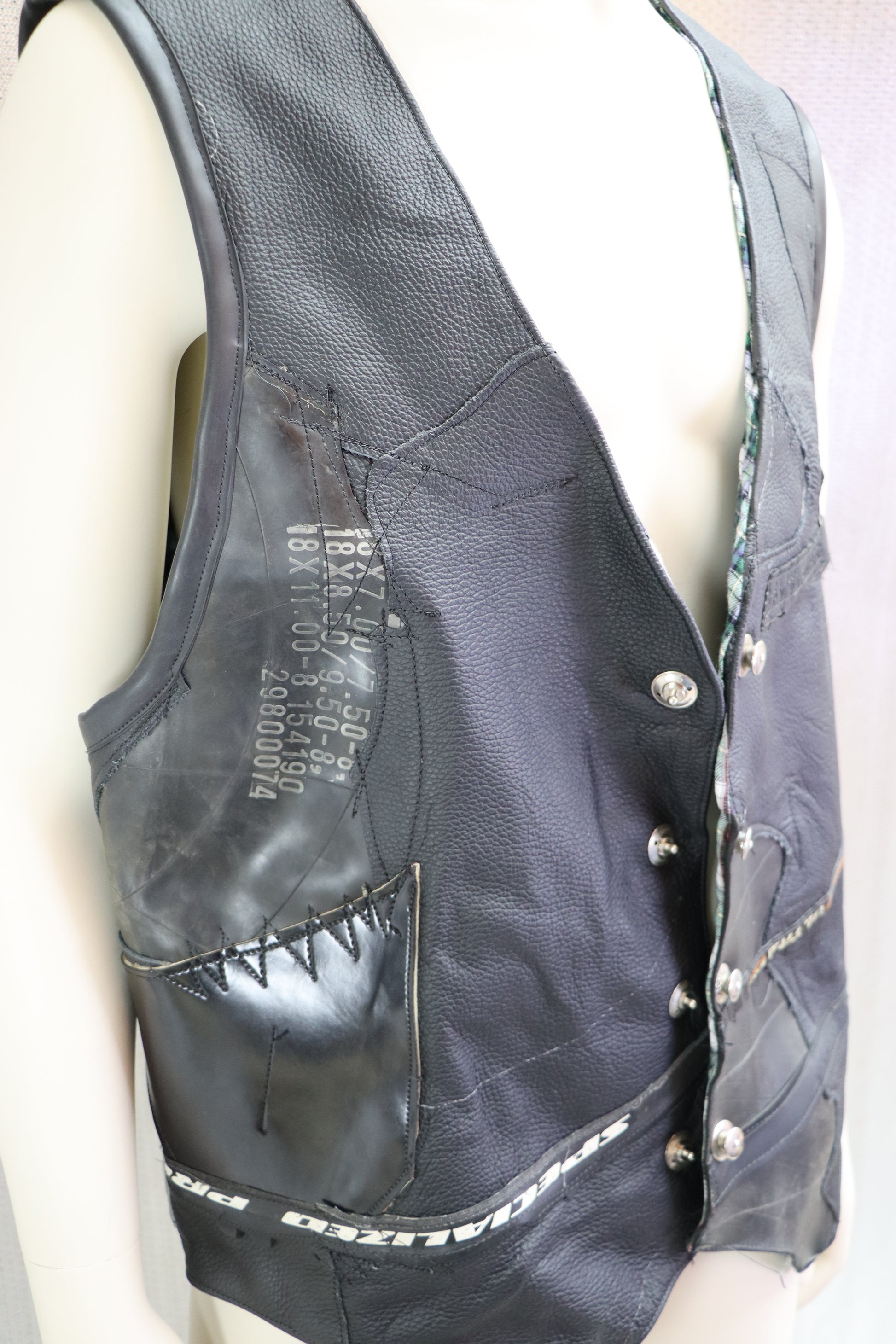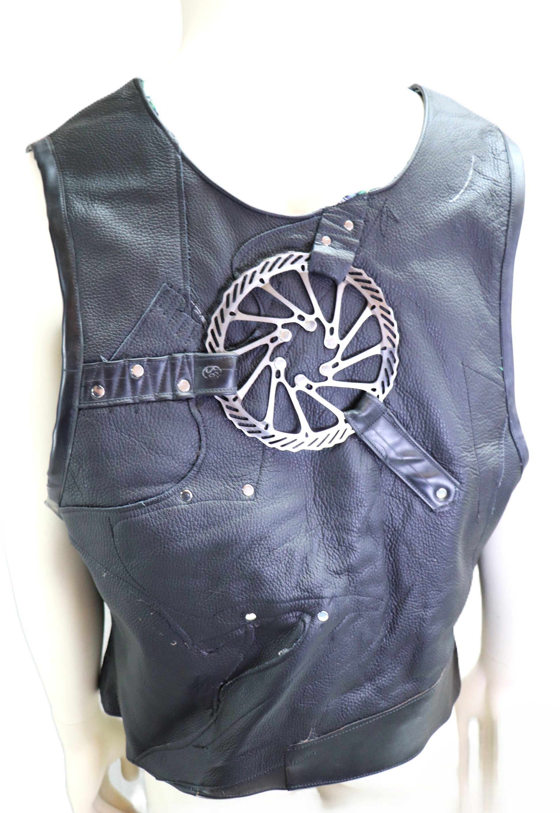 Lederweste aus verschiedenen Leder und Gummielementen zusammengesetzt. Dominante Besonderheit ist das Ritzel auf dem Rücken. Weste wird durch Loxx Knöpfe verschlossen.