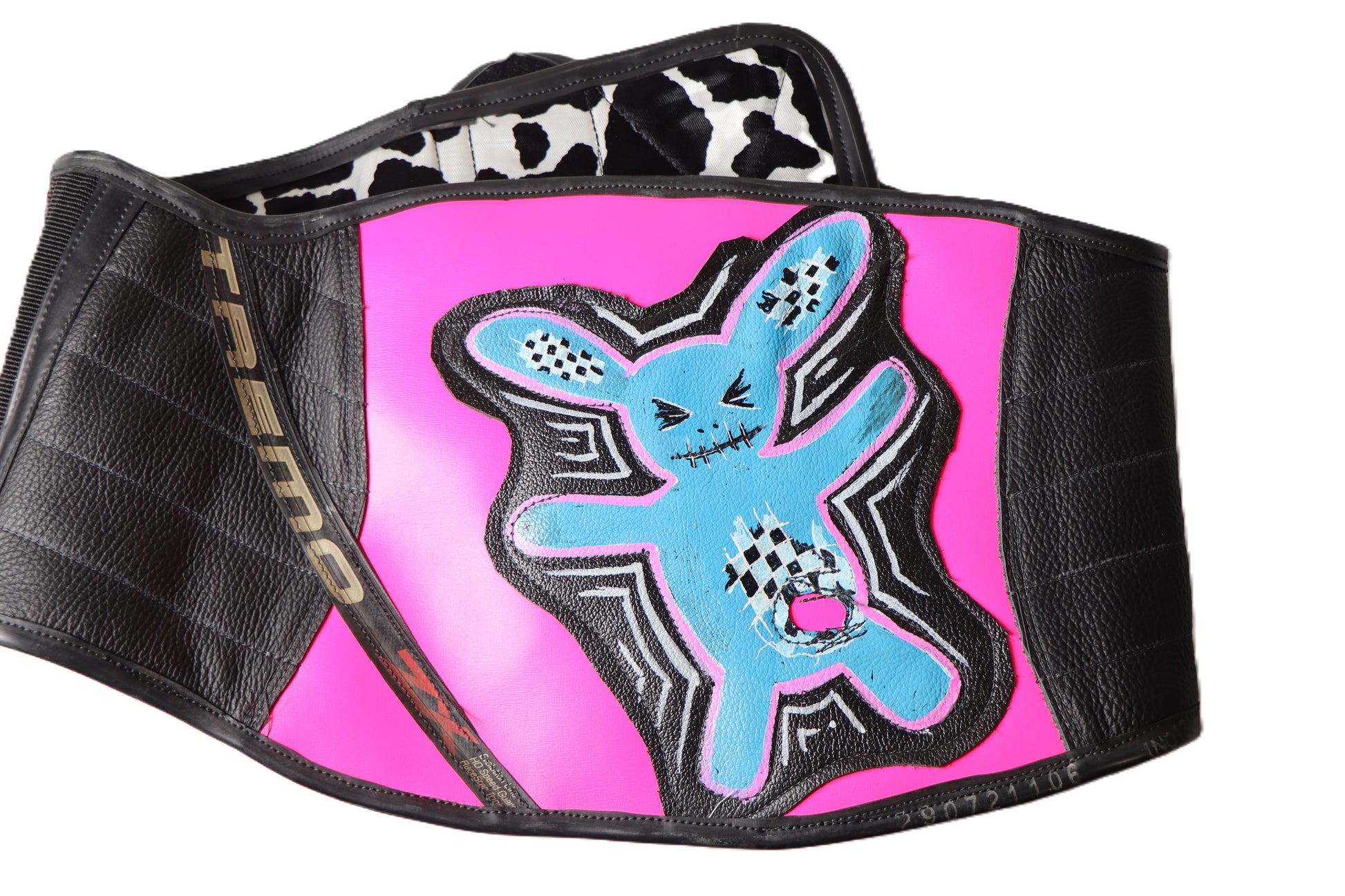 Handgefertigter Ledernierengurt aus pinkem Leder mit Handgemalter Applikation. Für einen ideale Passform wurde links und rechts ein Gummi verarbeitet. Der Nierengurt wird vorne mit Klettverschluss verschlossen, er vorne hat eine kleine Tasche .