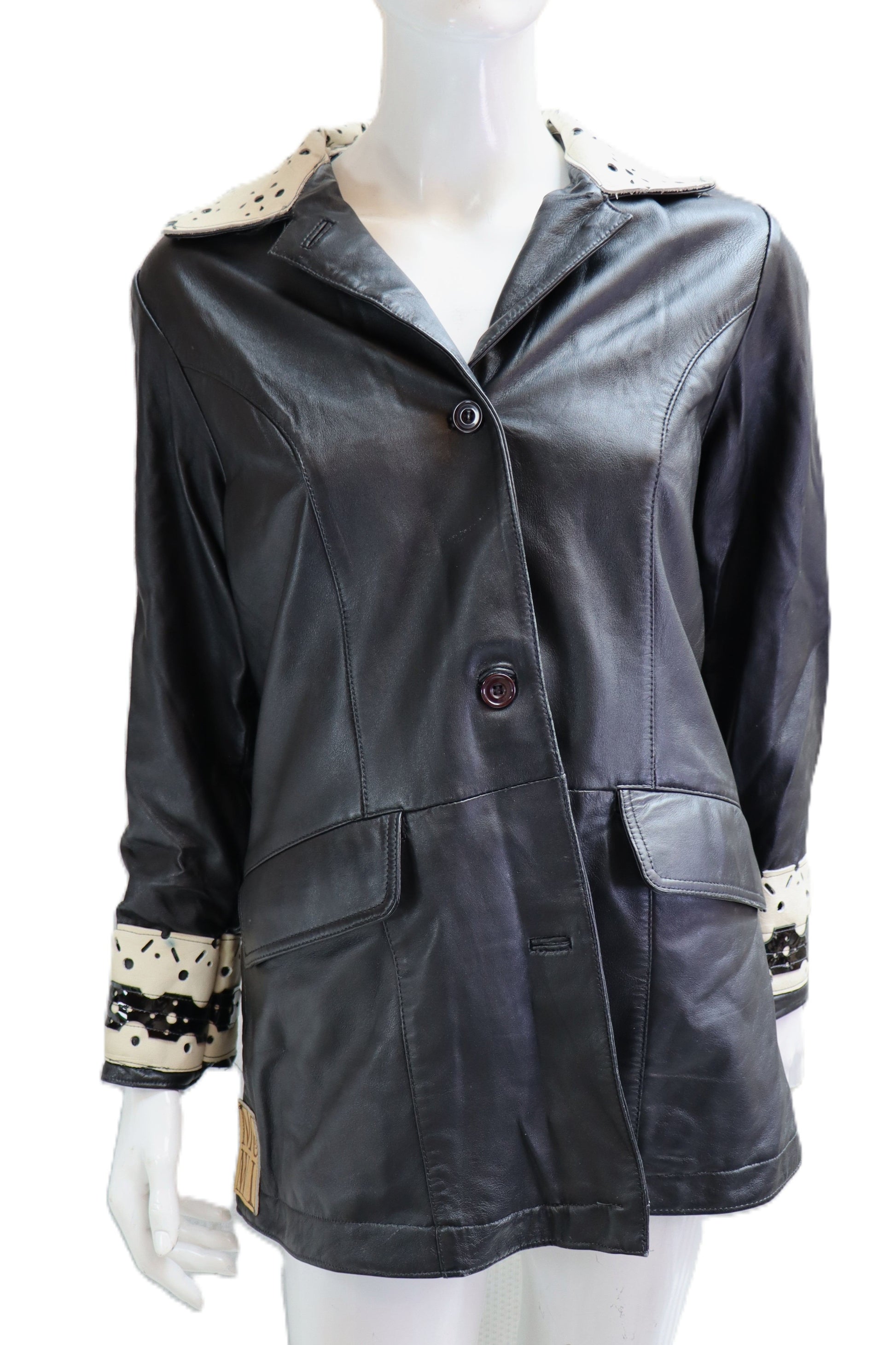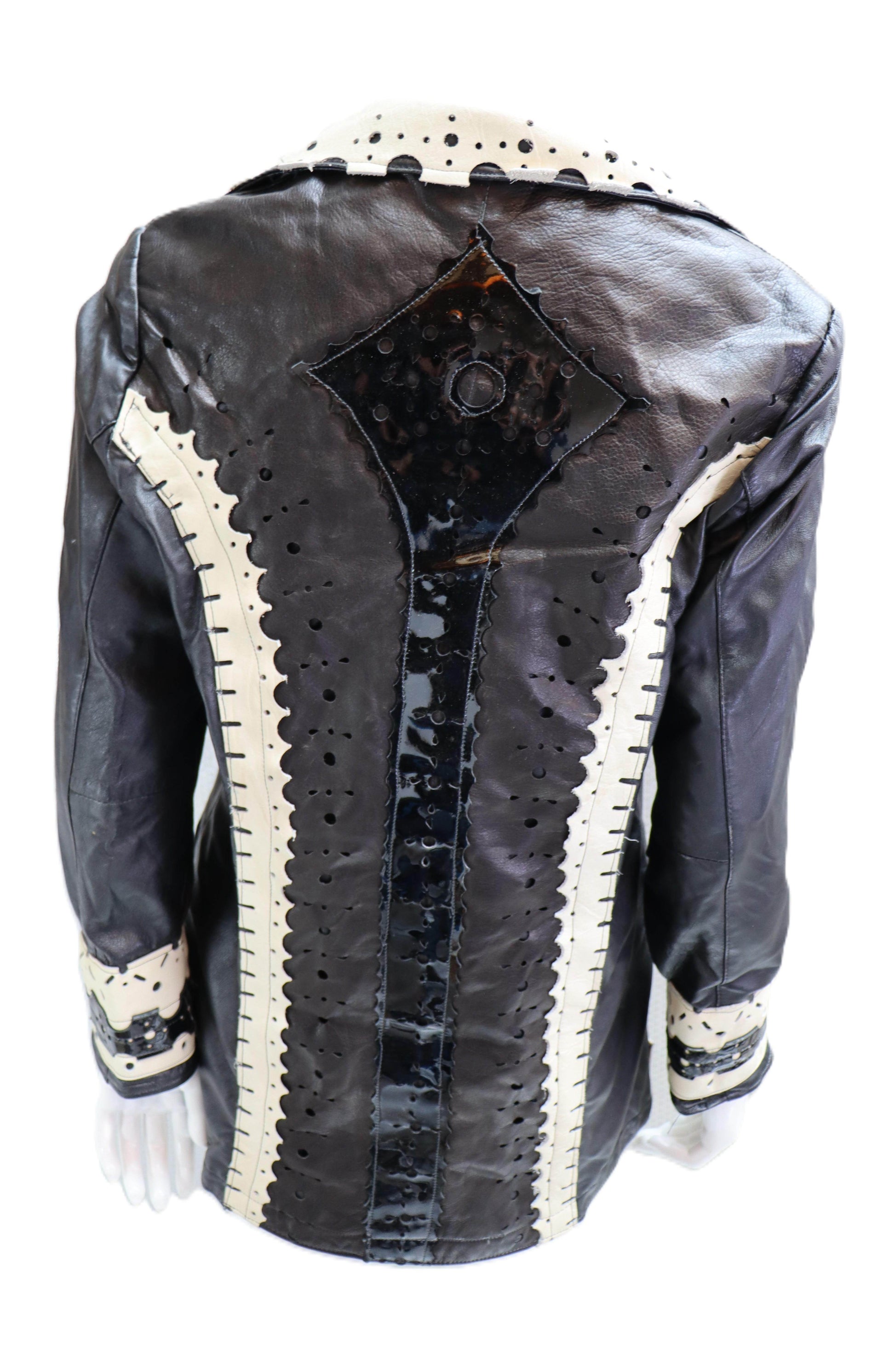 Leichter schwarzer Ledermantel mit extravaganten Lockapplikationen auf dem Rücken und den Armen.