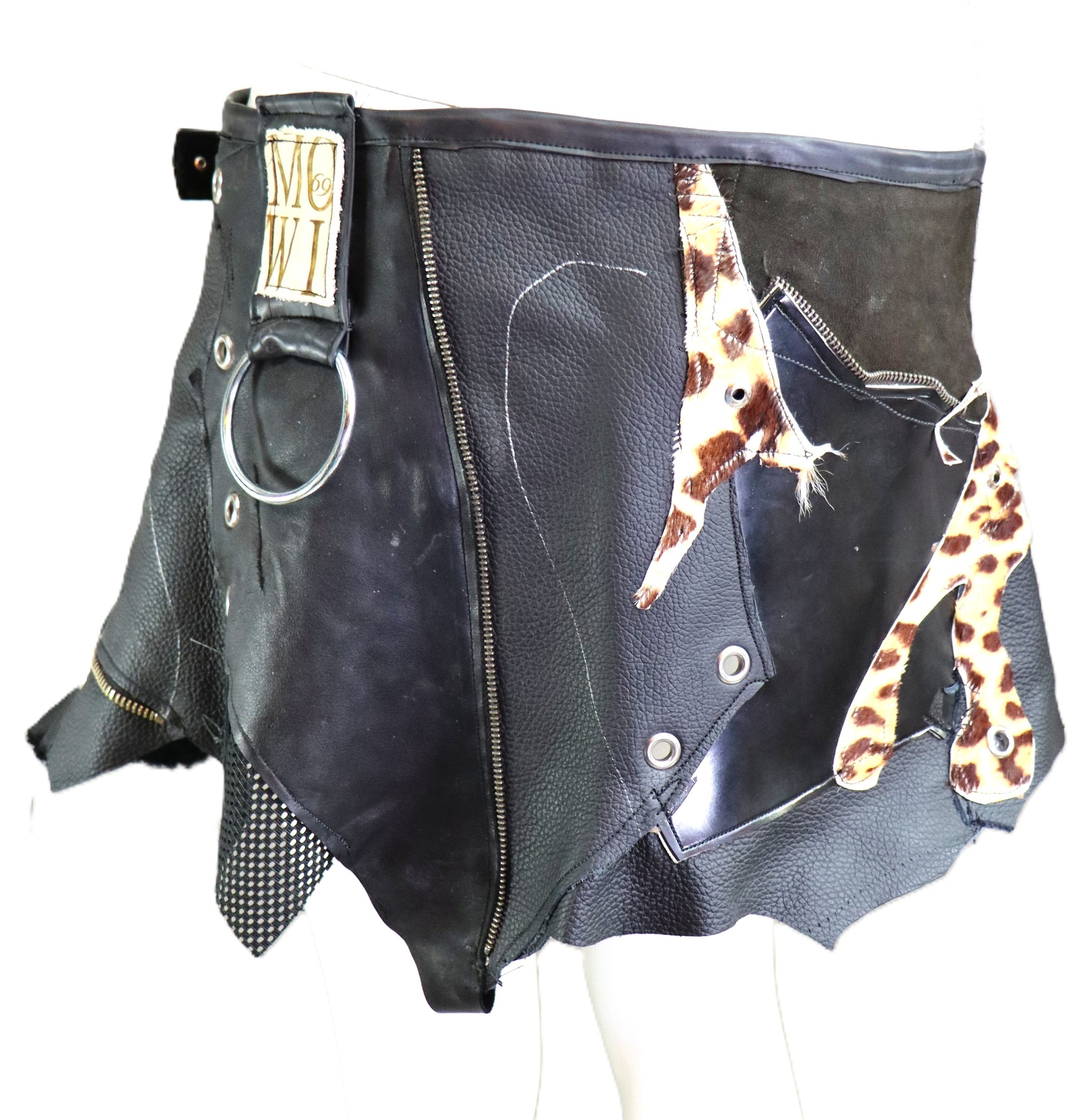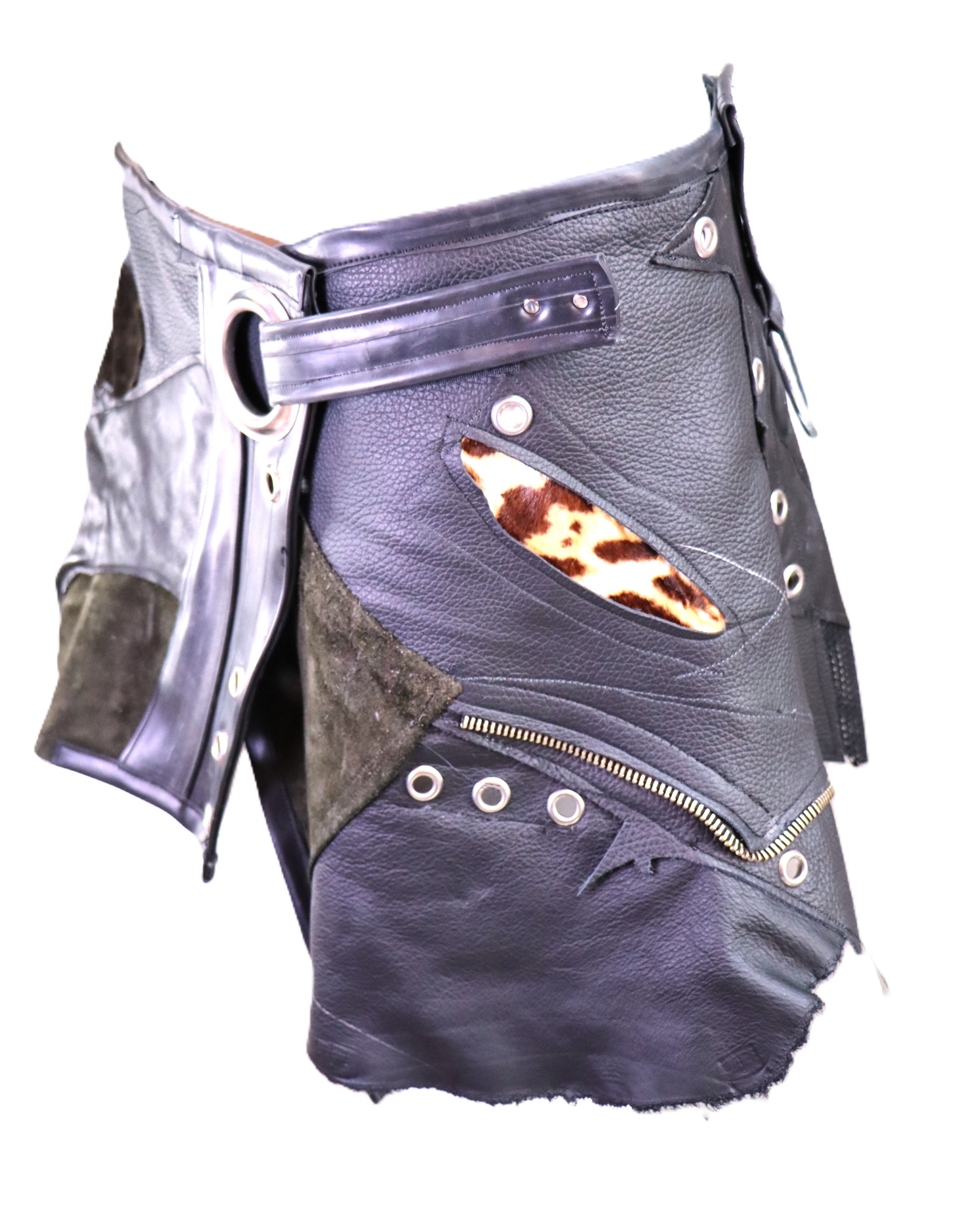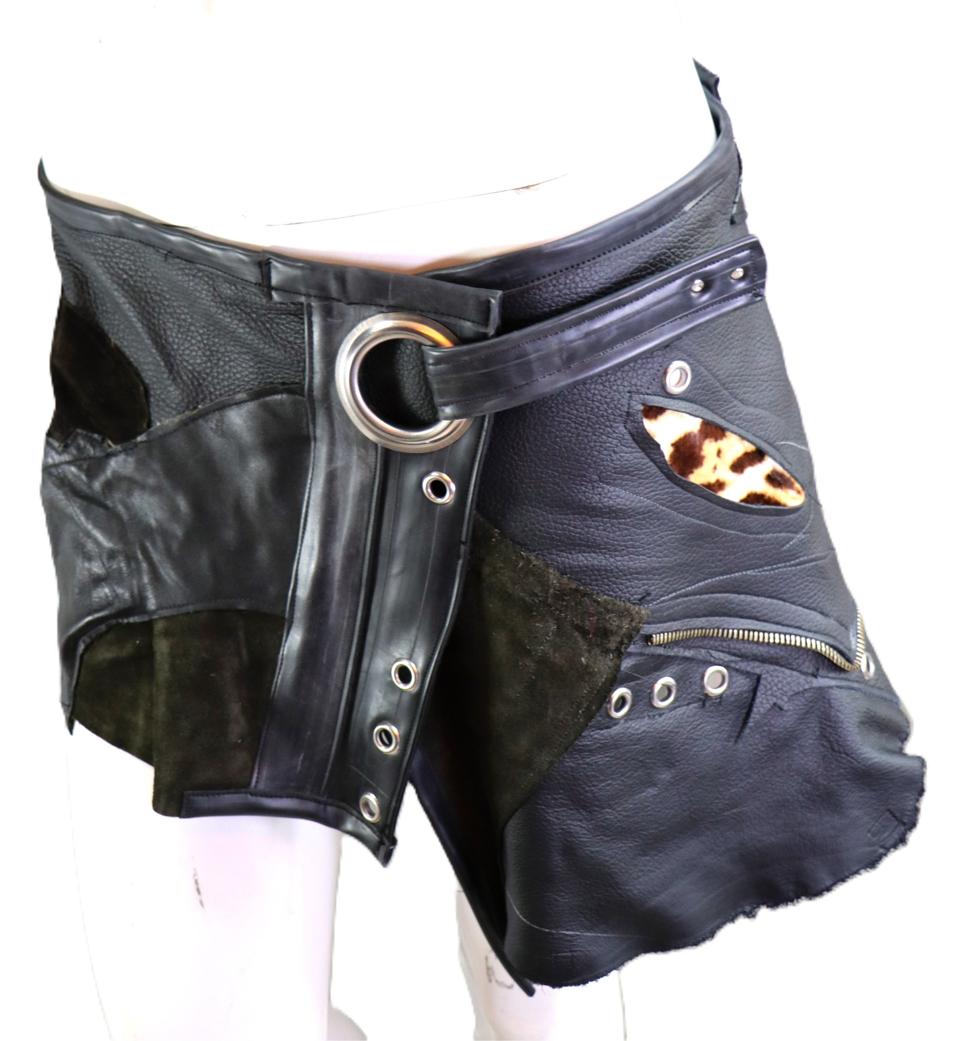 Handgefertigter Rock aus verschiedenen Lederelementen zusammengesetzt. Dazwischen wurden Fellstücke mit animalprint verarbeitet.