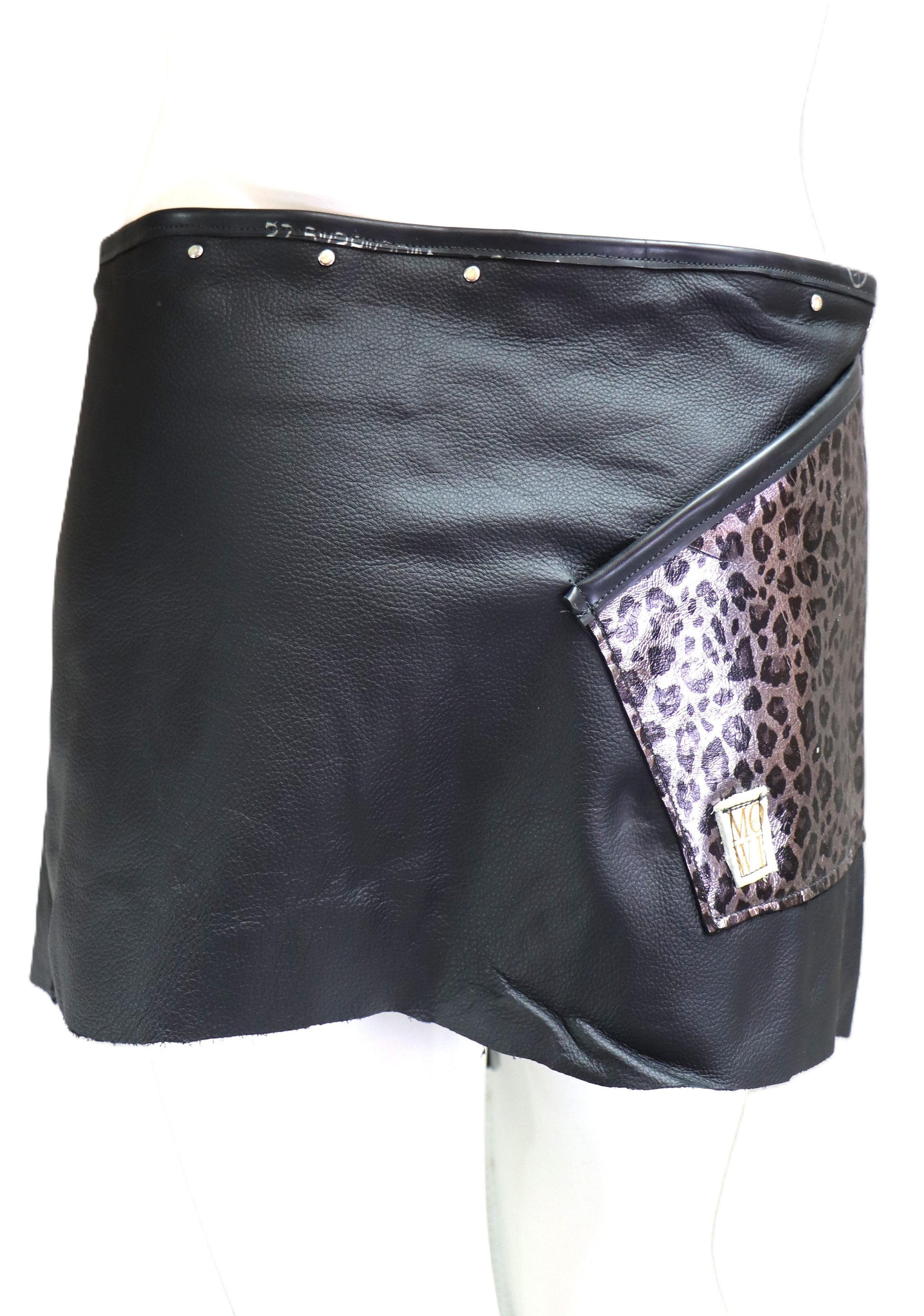 Handgefertigter schwarzer Lederrock mit großer Tasche, aus Leder mit animalprint in silber-schwarz.
