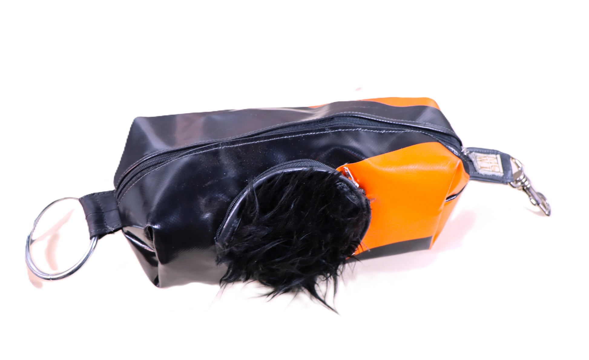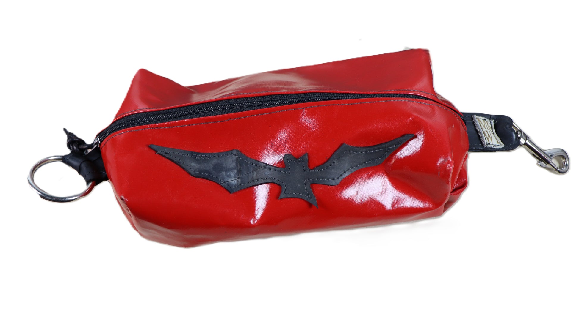 Handgefertigte mini bags aus verschiedenen Materialien. Auf der einen Seite befindet sich ein Ring auf der anderen Seite ein Karabiner. Diese Taschen haben die ideale Größe als Kulturbeutel.