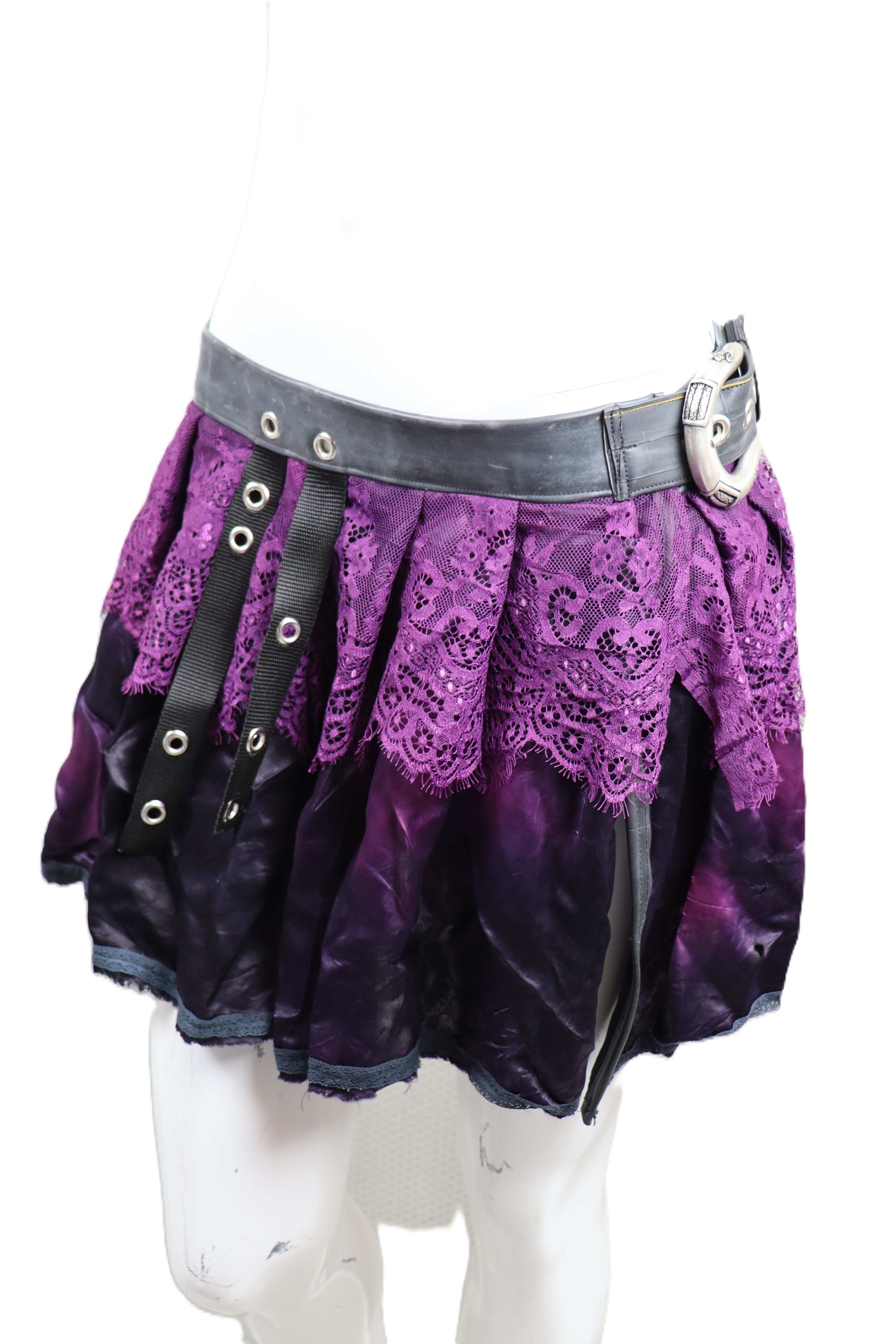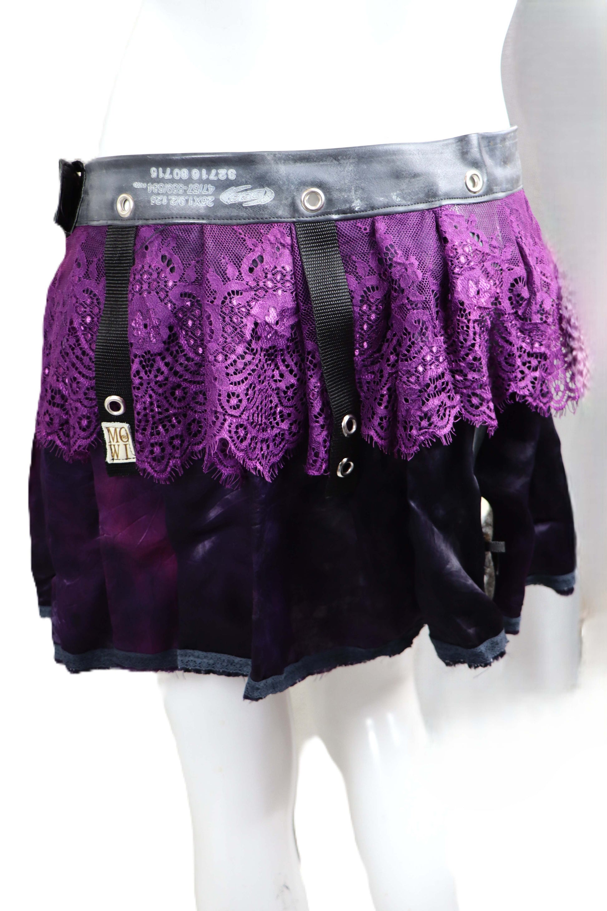 Handgefertigter Mini Rock in schwarz lila, mit Spitze. Auf einer Seite wurde ein phosphoreszierender Rabenschädel verarbeitet.