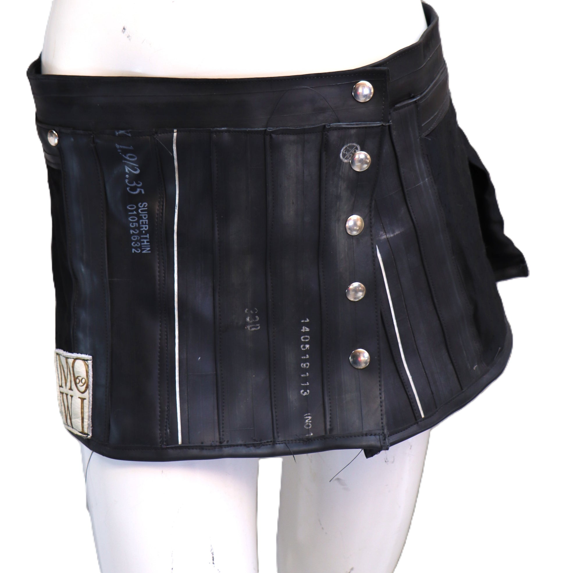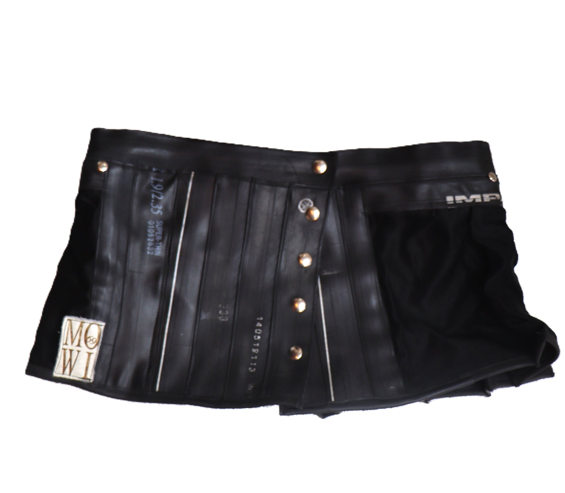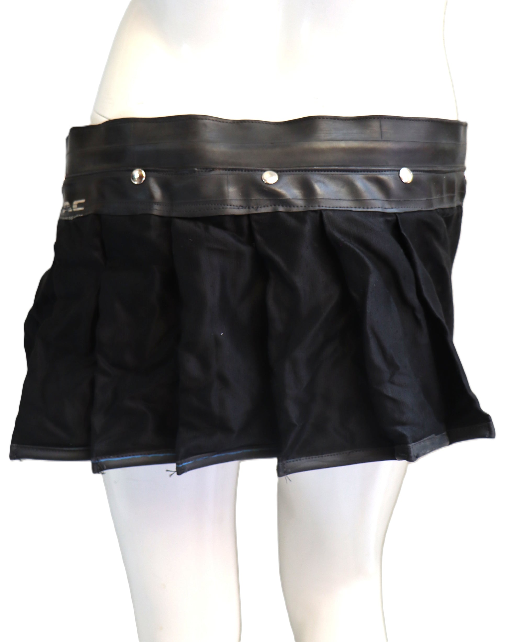Handgemachter Mini Rock aus schwarzem Stoff mit Gummi. Der Rock wird auf der Hüfte getragen.