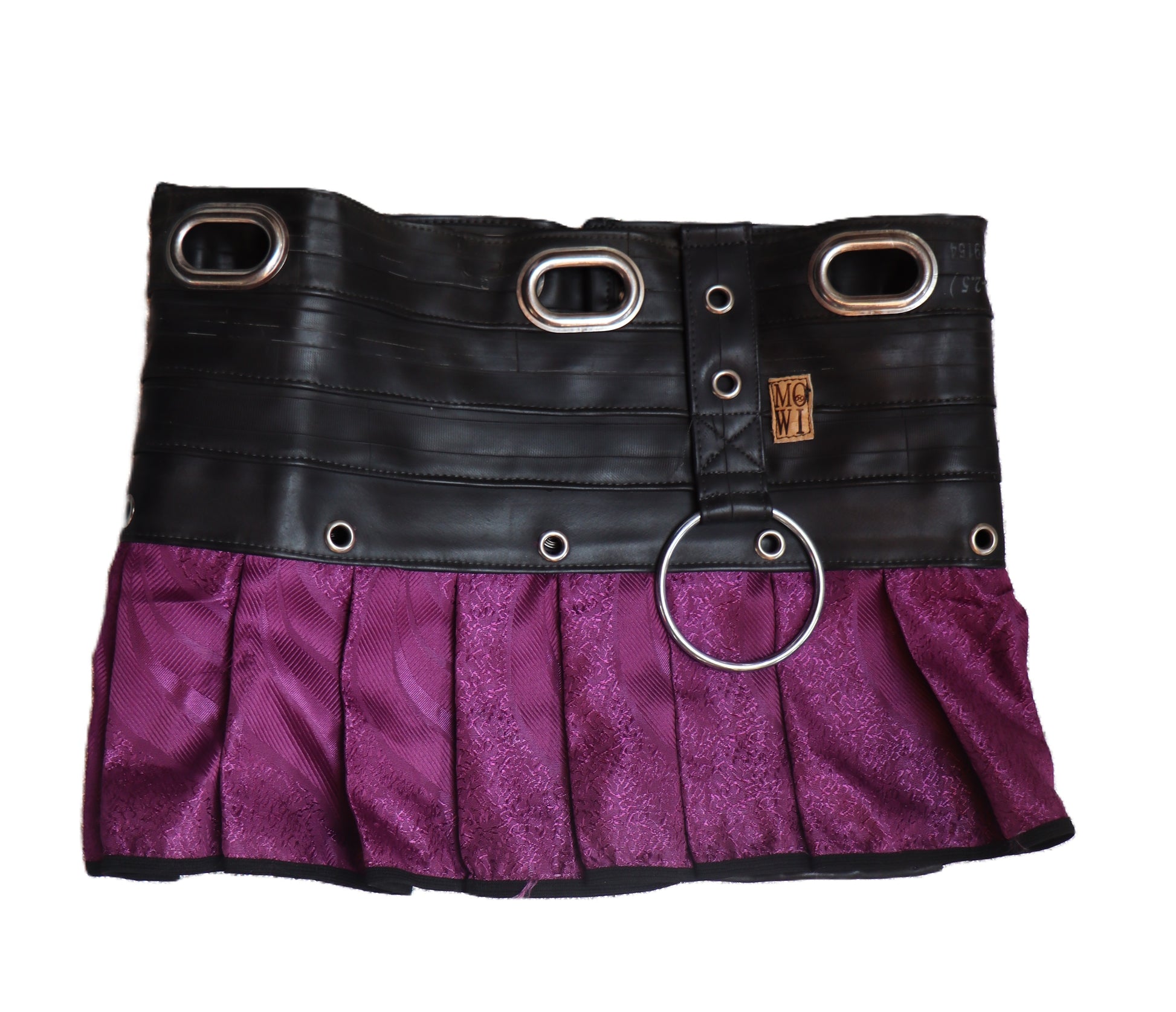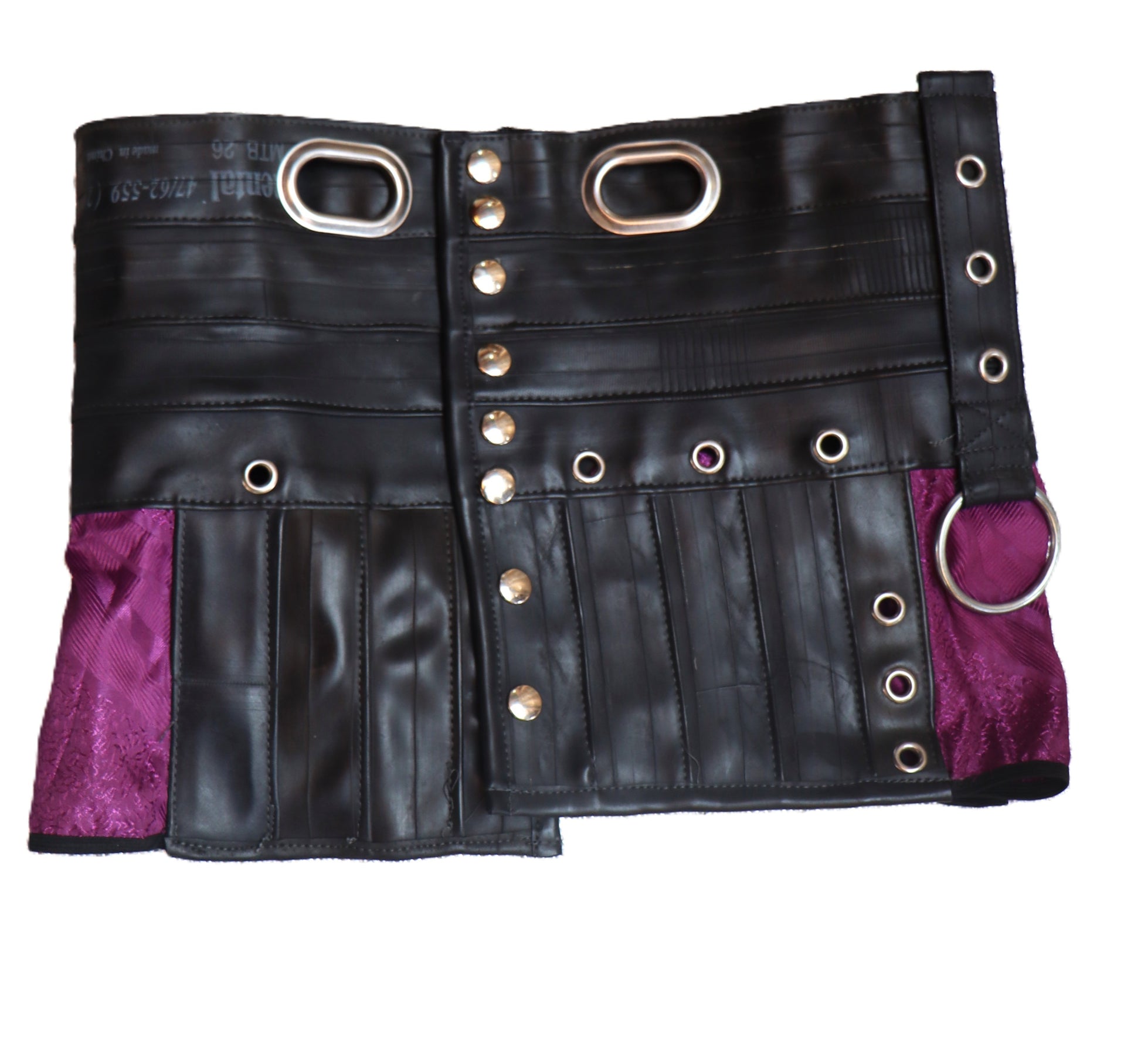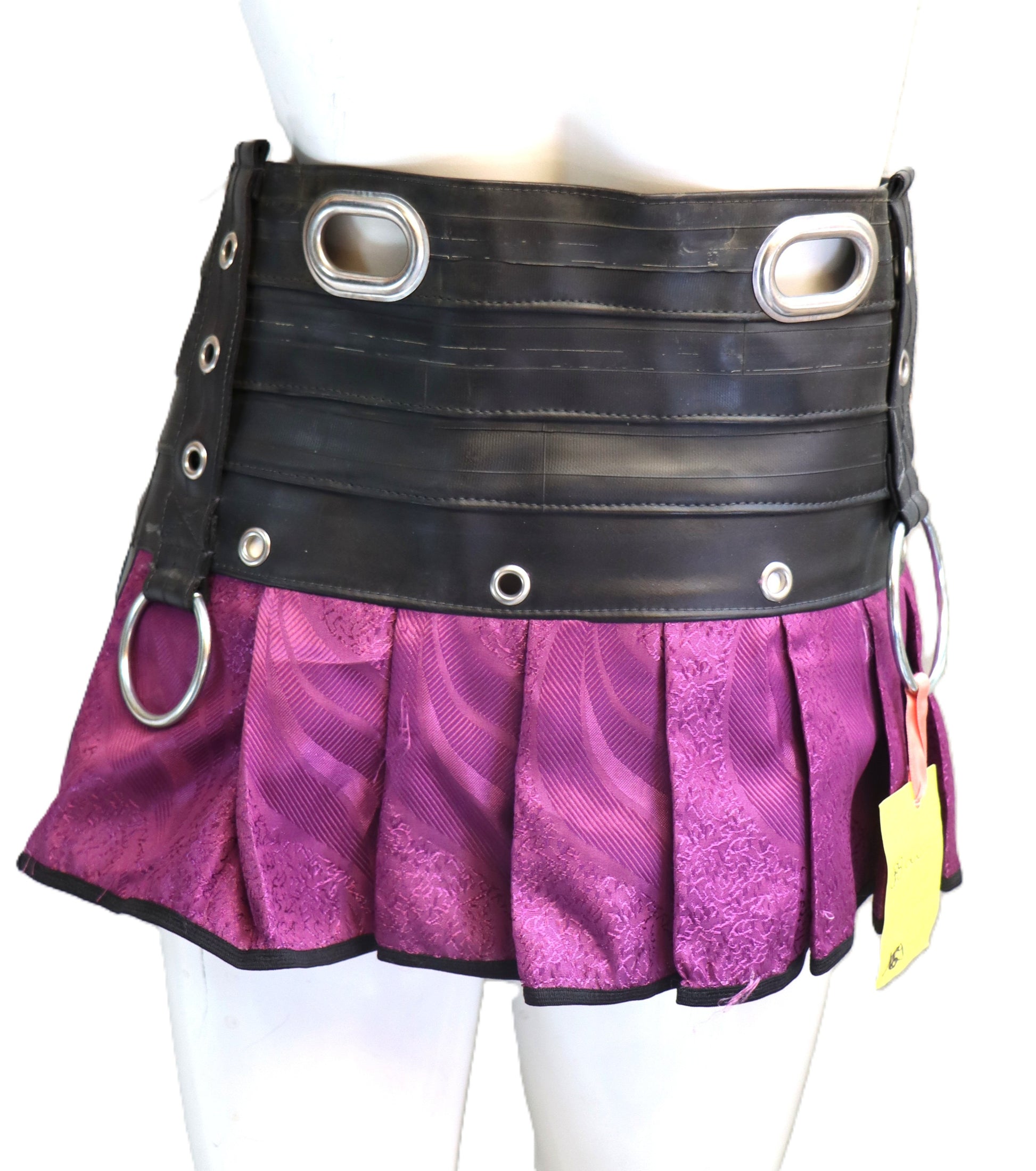 Handgefertigter Mini Rock aus violettem Stoff mit Schlauchgummi. Der Rock wird auf der Hüfte getragen.