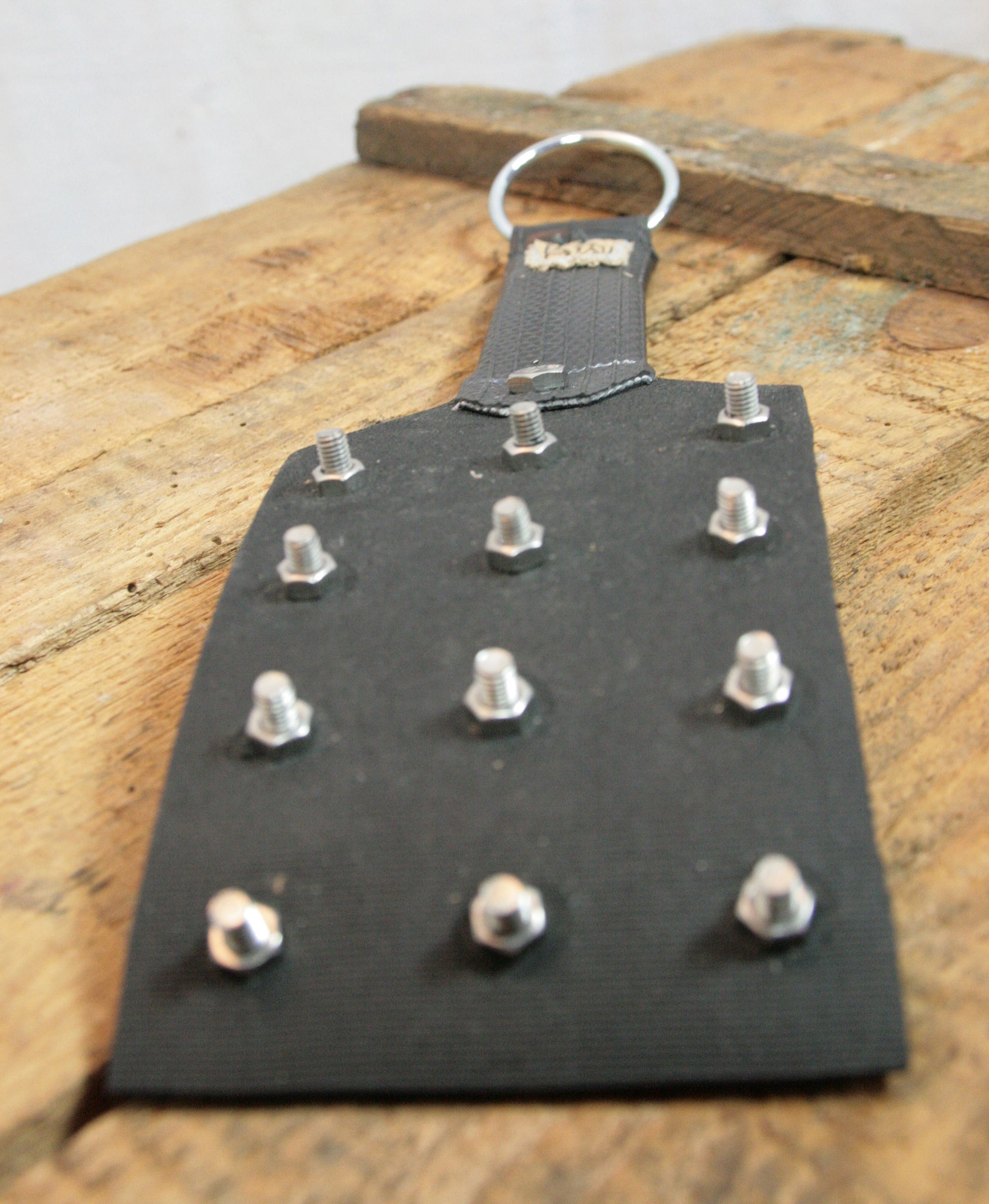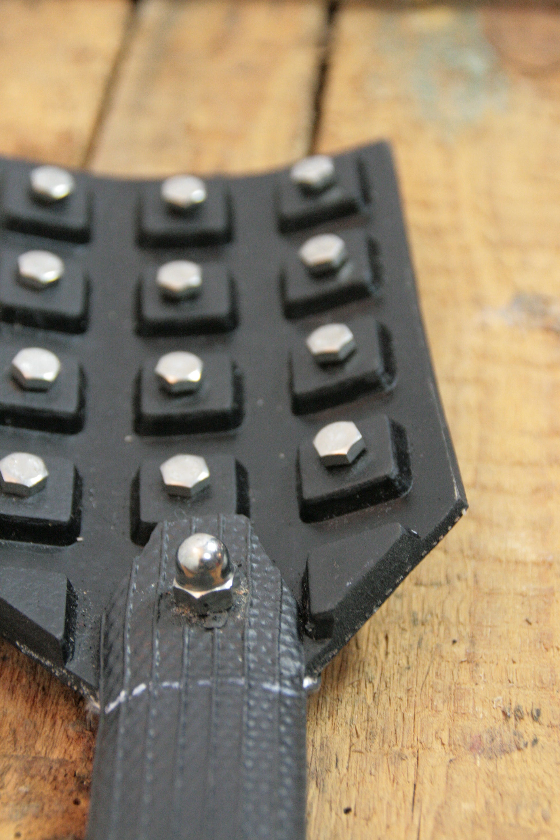 Rechteckiges, schwarzes Gummipaddel mit Schrauben.