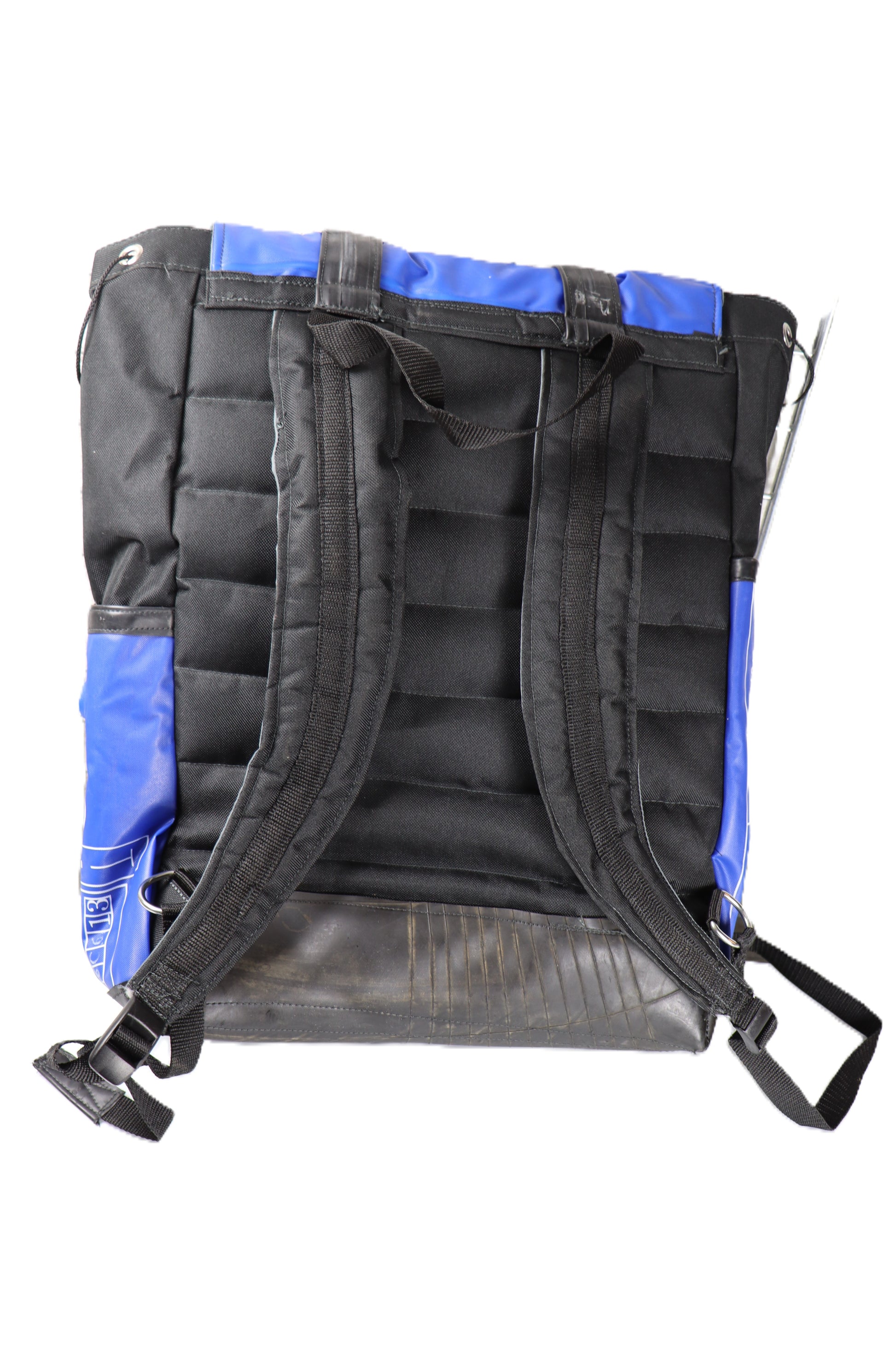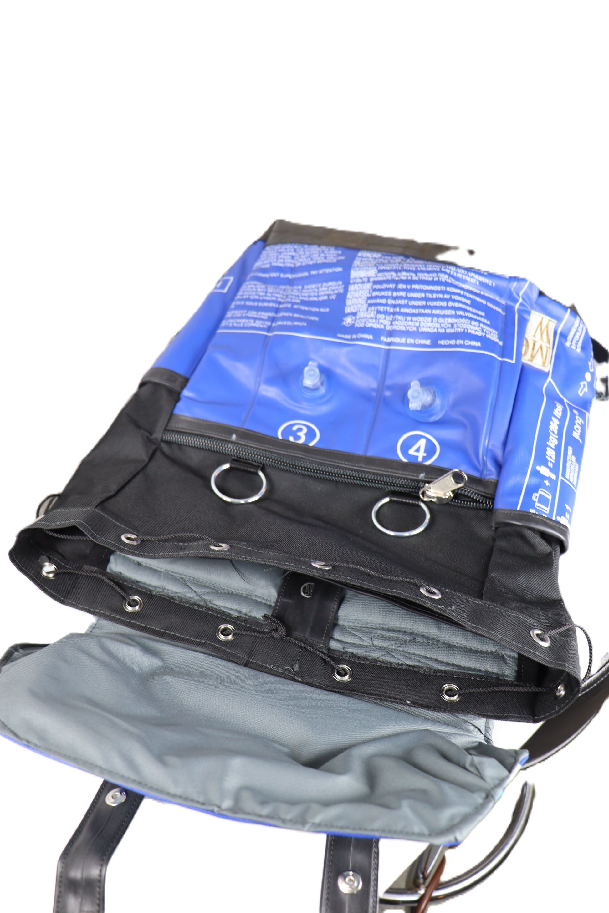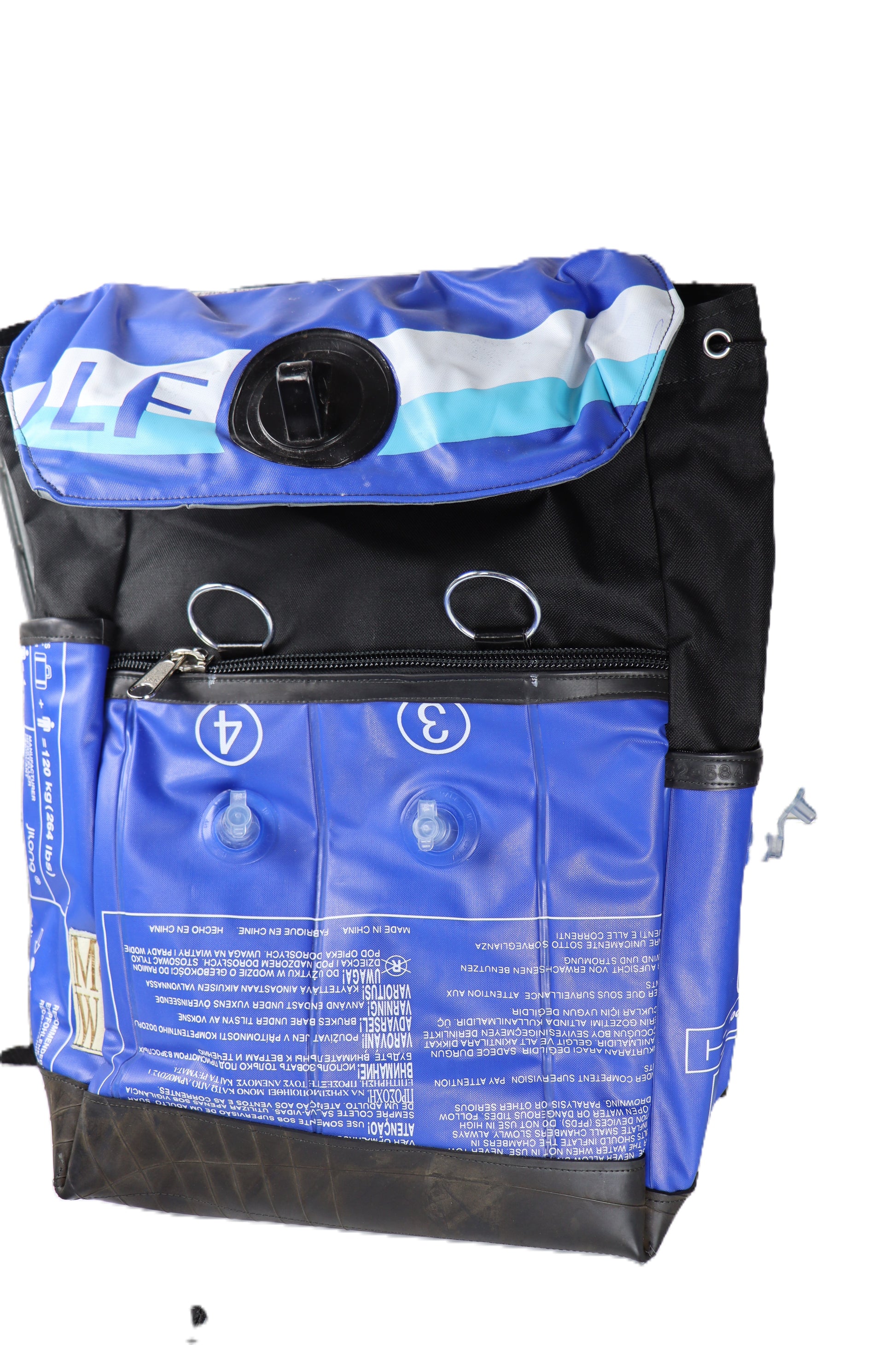 Handgefertigtr Rucksack aus upgecyceltem Schlauchbootsgummi. Das Innenleben ist mit Laptoptasche. Rückseite und Fächer aus Wasserabweisendem Stoff.