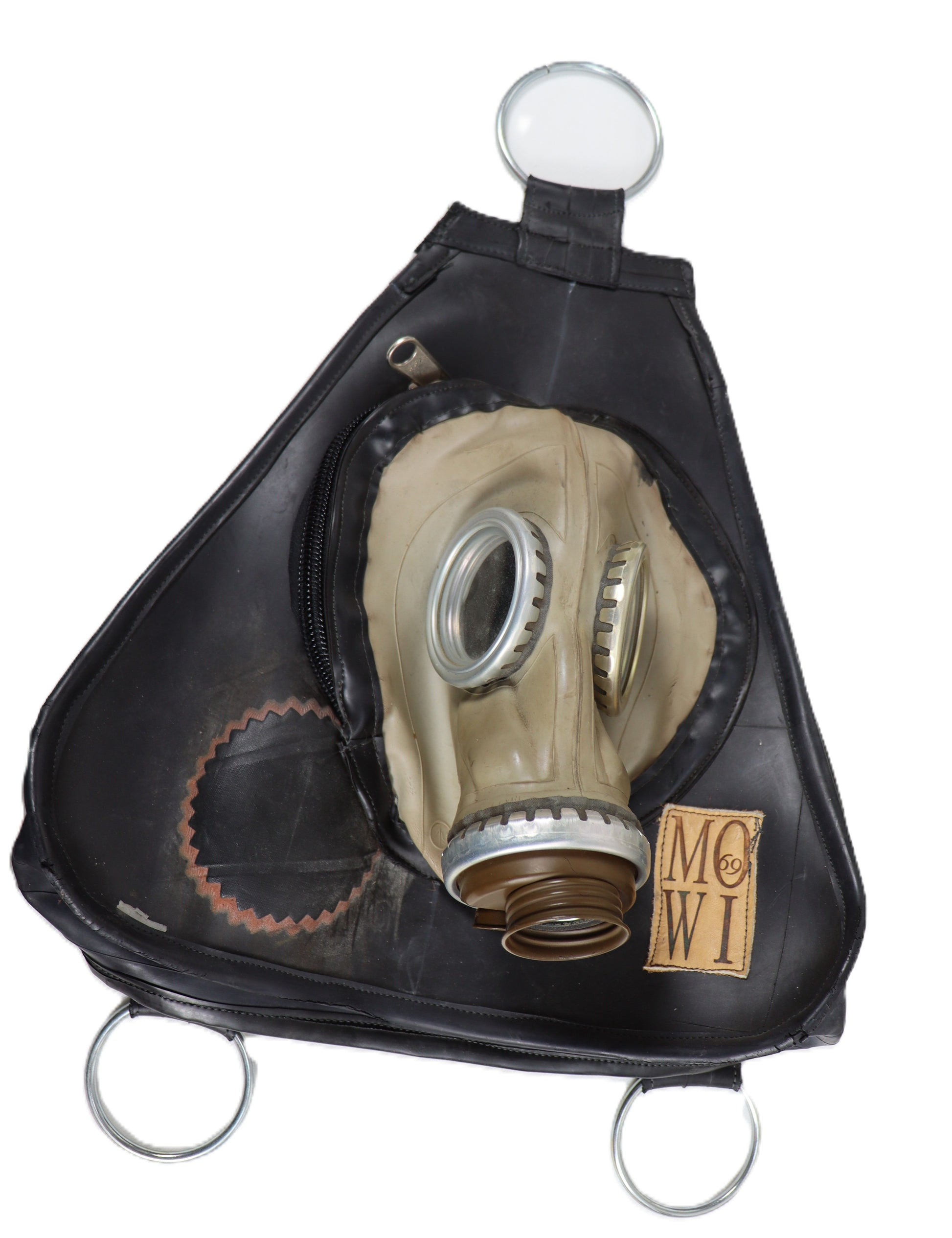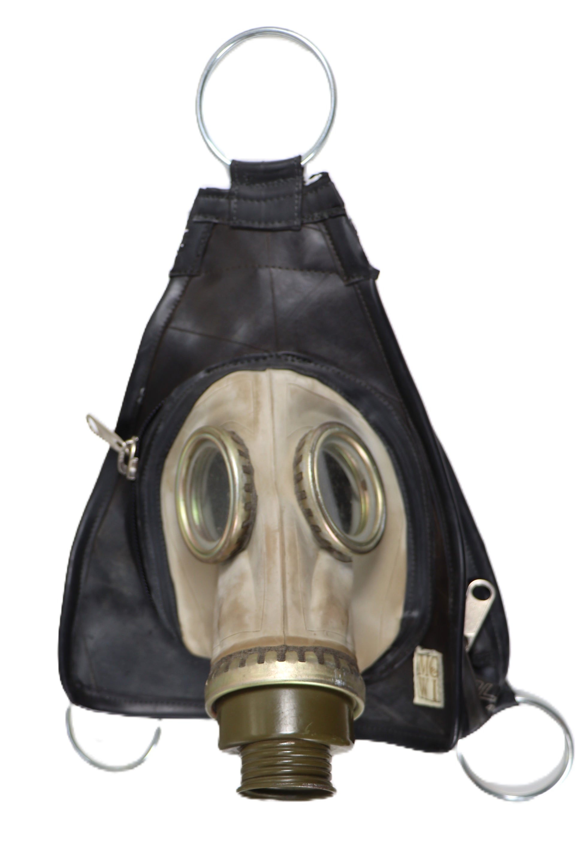 Diese Handgefertigten Rucksäcke werden an der Seite mit einem Reißverschluss verschlossen. Wenn eine Gasmaske verarbeitet wurde, ist diese ebenfalls eine Tasche. Es gibt zwei verschiedene Größen.