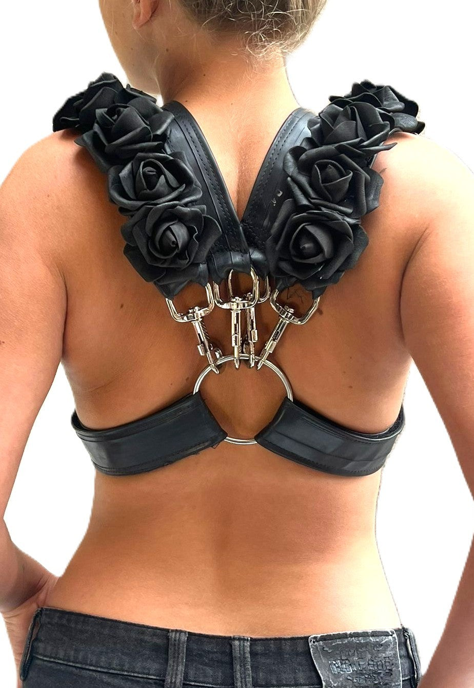 Dieser Harnessgurt ,,Rose " aus upgecyceltem Fahrradschlauch und Schaum-PE-Rosen ist eine aparte Erweiterung für Dein Gurtsystem.
