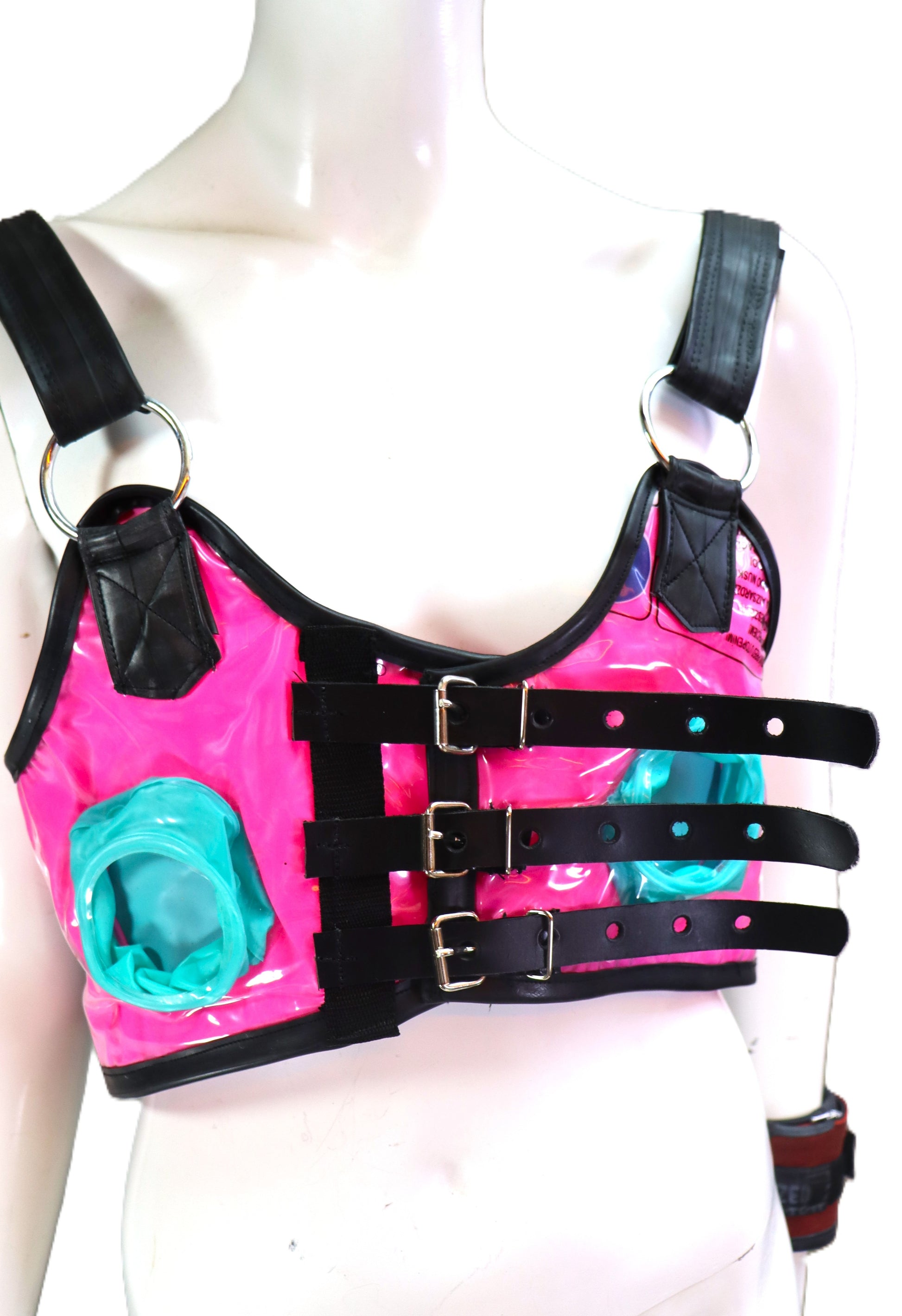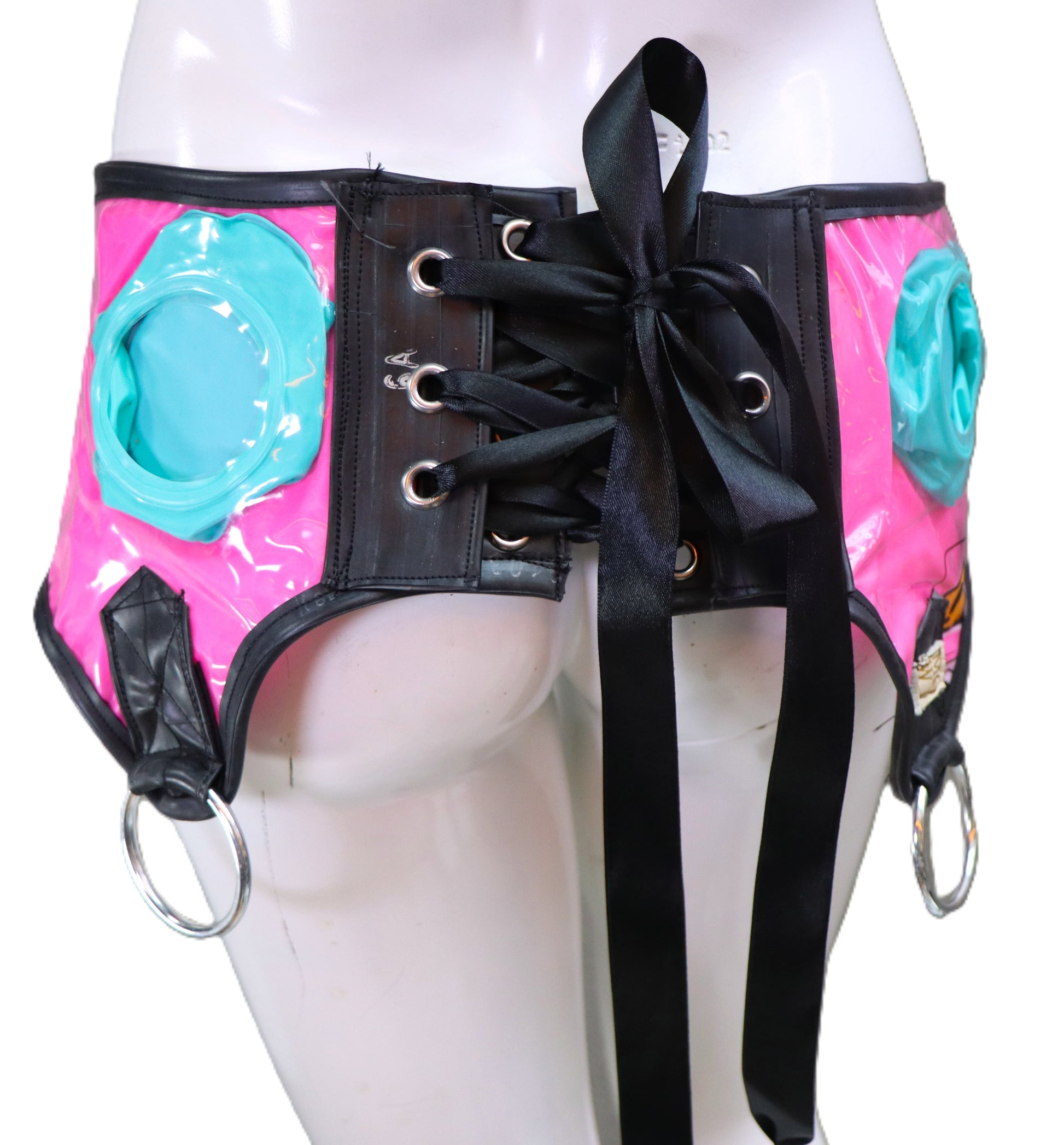 Handgefertigter Strumpfhalter aus einer Luftmatratze. Bei den allermeisten Körperformen kann der Strumpfhalter auch als Schnallenoberteil getragen werden. Angepasst wird das Kleidungsstück durch die Schnallen und Schnürungen auf der Rückseite.