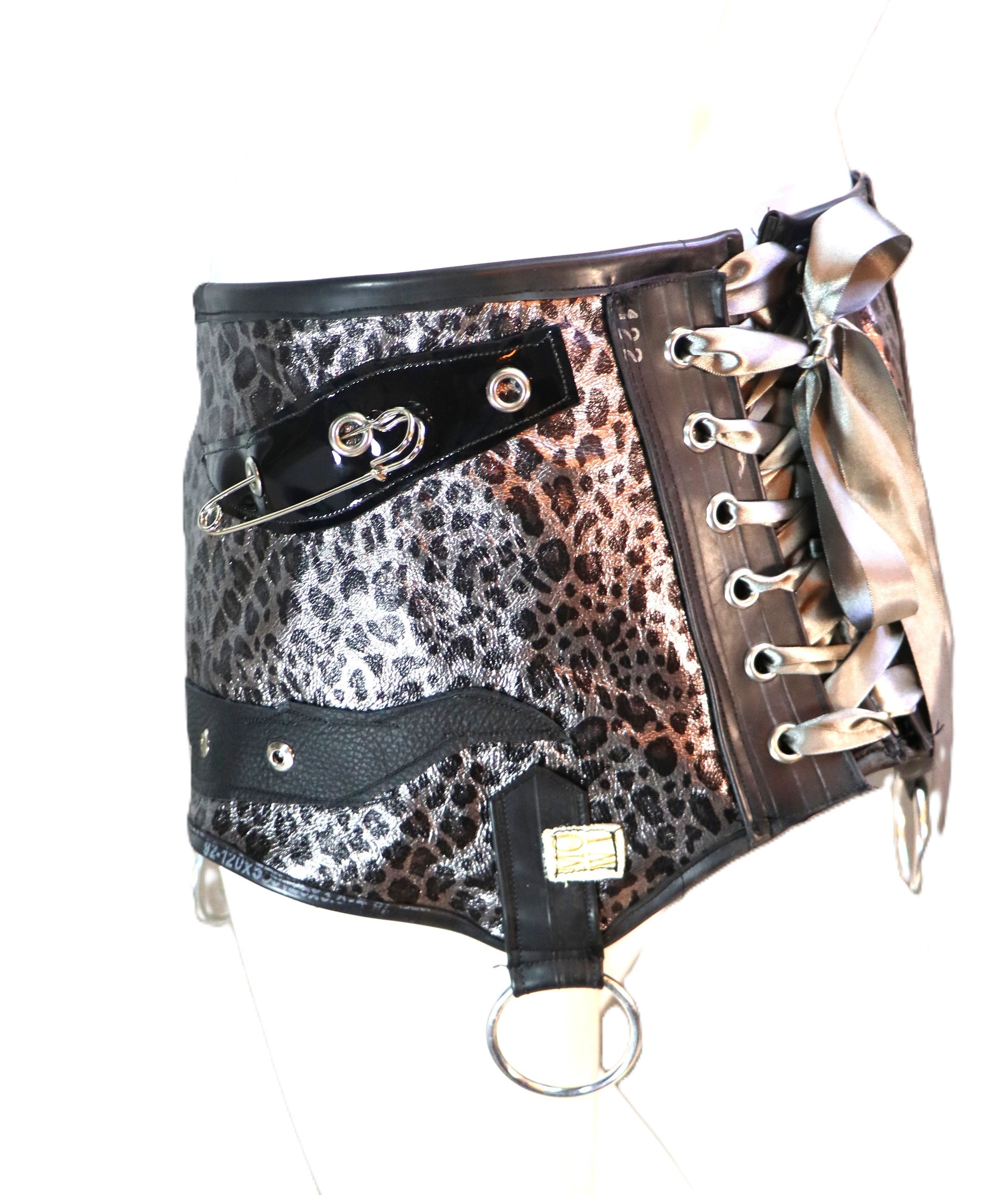 Handgefertigter Strumpfhalter aus Leder mit animalprint und Gummi. Der Strapsgürtel kann bei den meisten Körperformen auch umgedreht als Schnallenoberteil getragen werden. Die Größe kann durch die Schnallen und Schnürung angepasst werden.