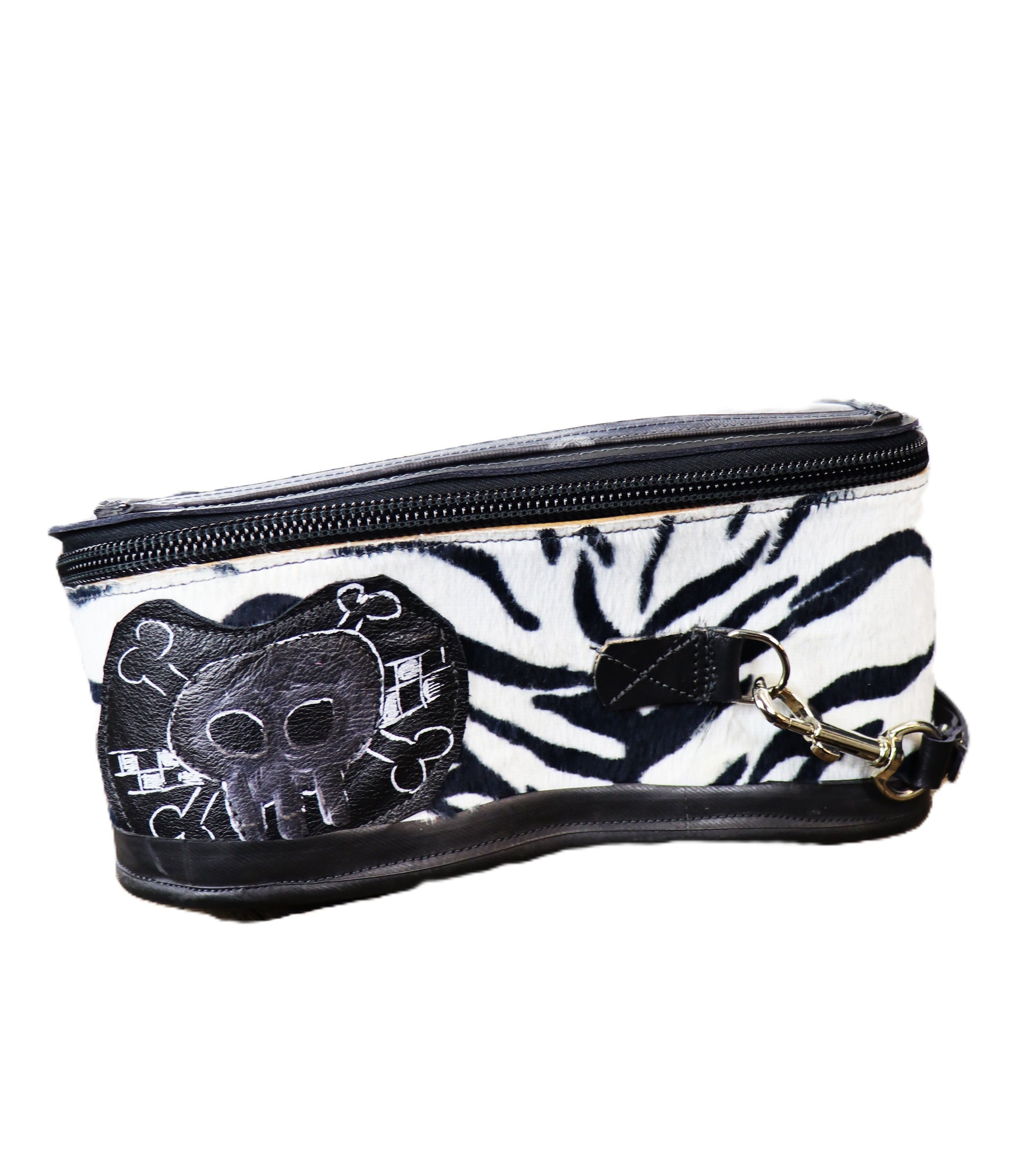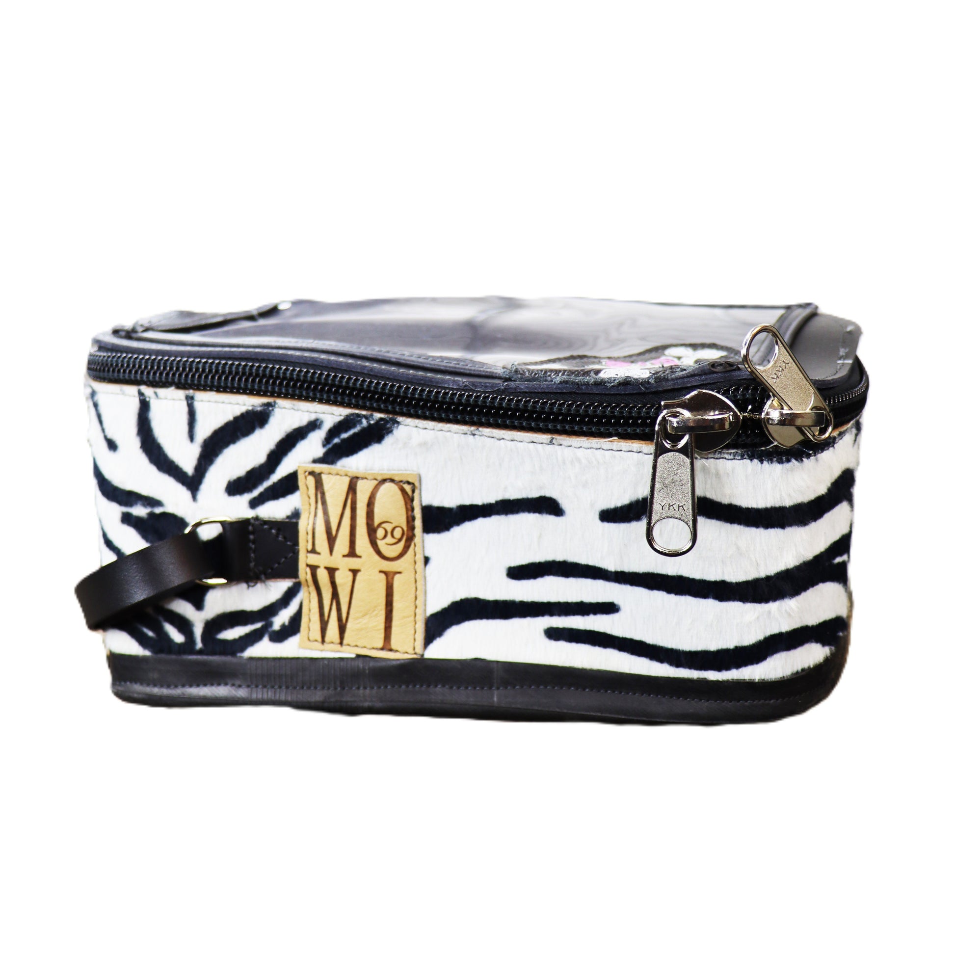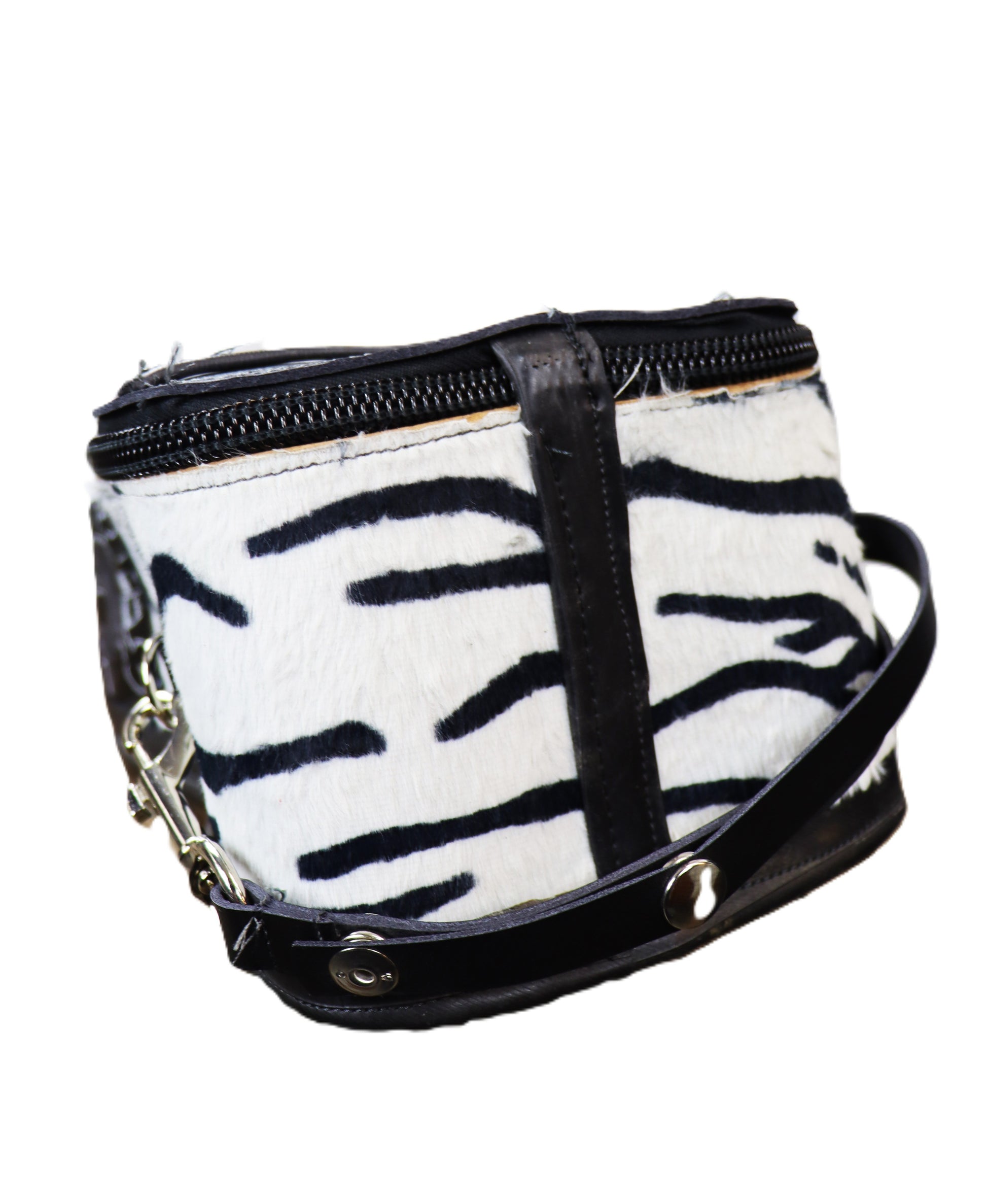 Handgefertigter Tankrucksack aus Blankleder mit Zebraplüsch überzogen. Auf der Magnetseite am Boden befindet sich LKW Schlauchgummi. Transparentes Handy oder Kartenfach auf der Deckelseite.