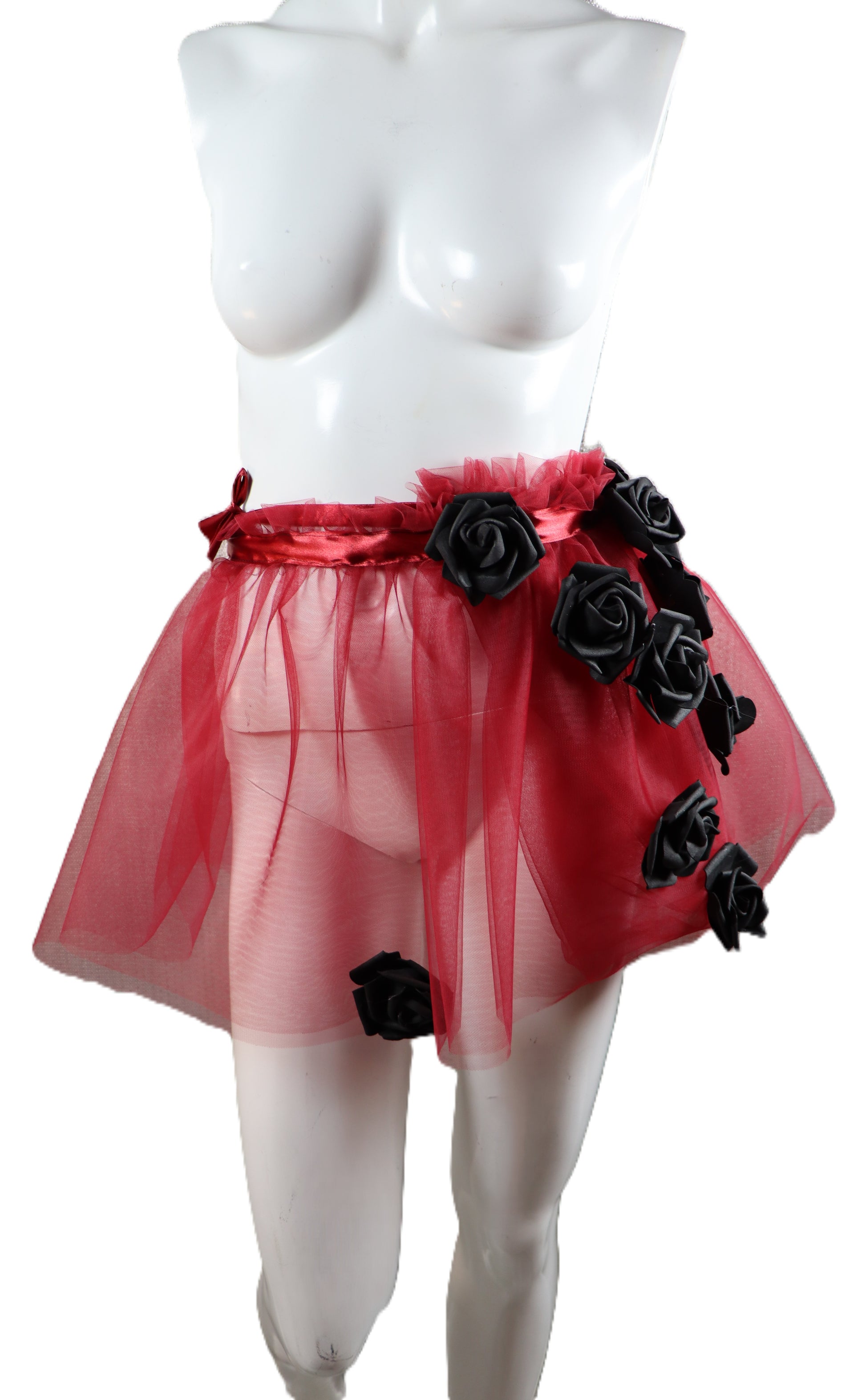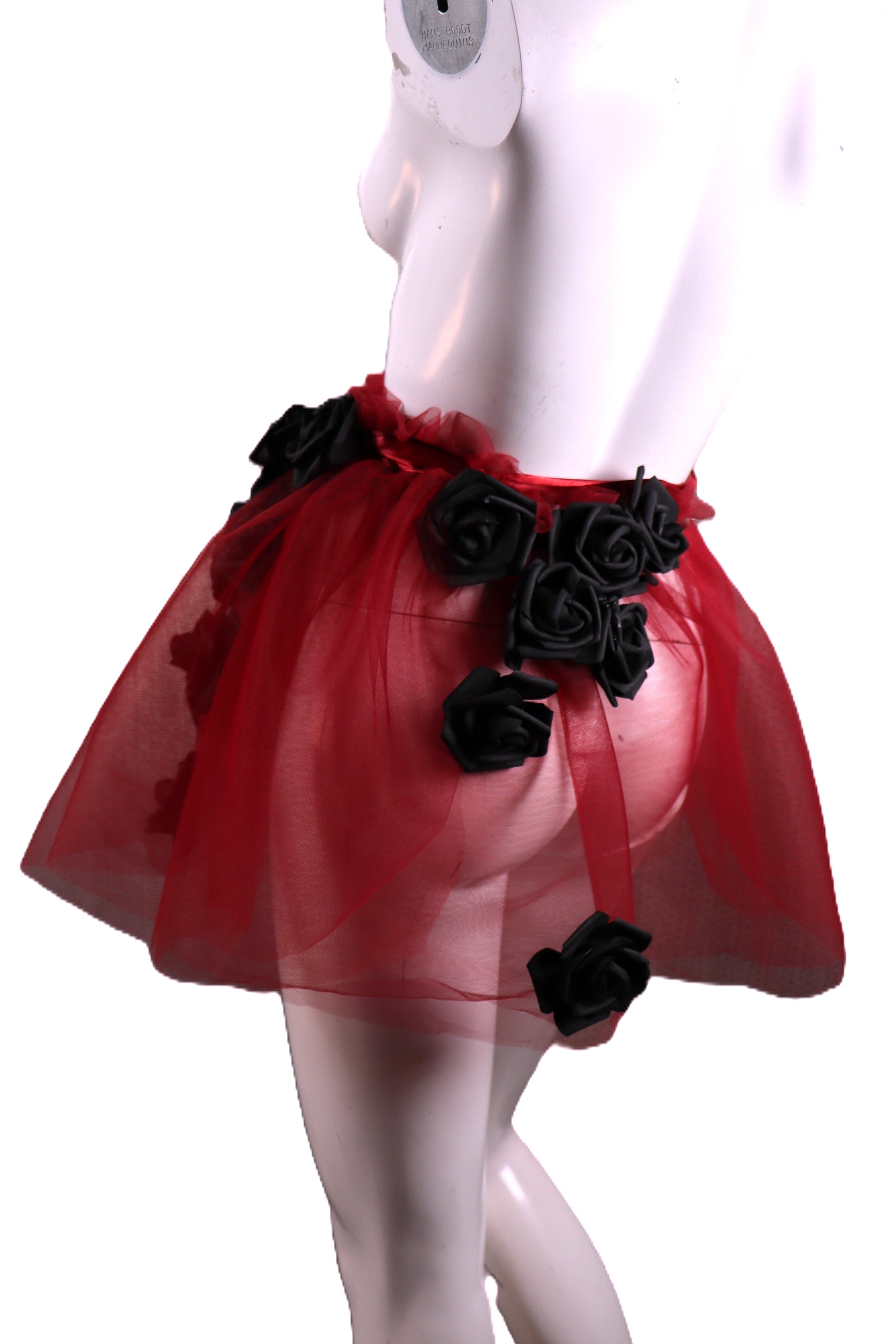 Handgefertigter Rock aus weinrotem Tüll mit schwarzen Rosen. Der Rock wird gebunden. Durch seine Transparenz schauen schwarze Strapse besonders schön dazu aus.