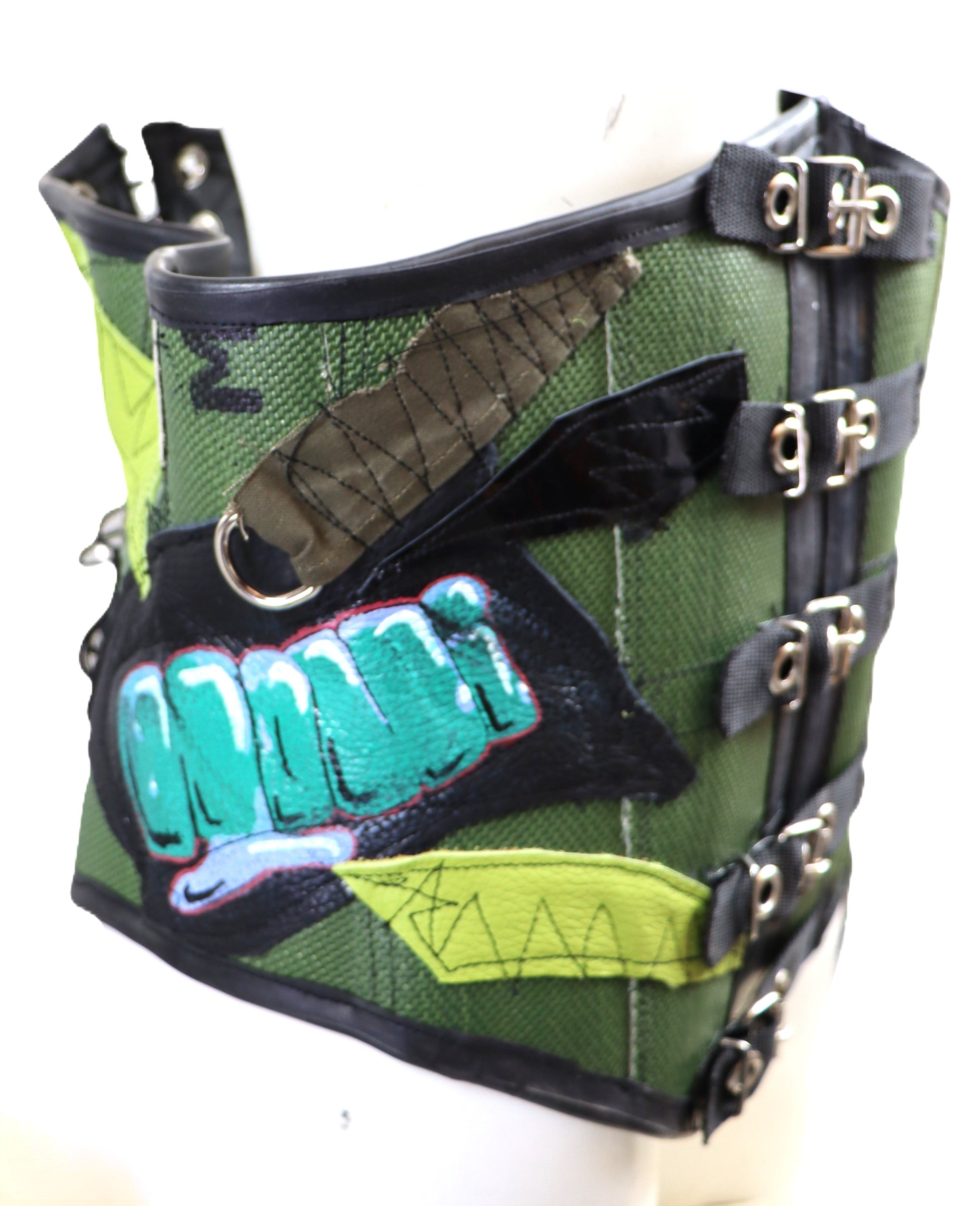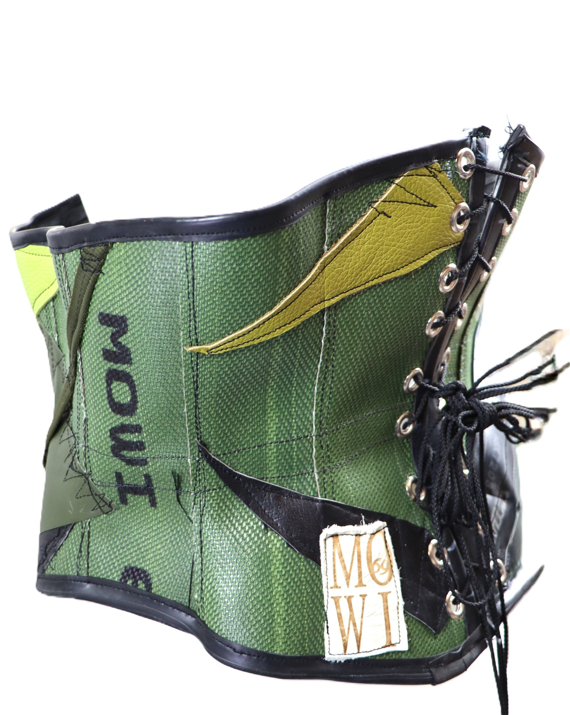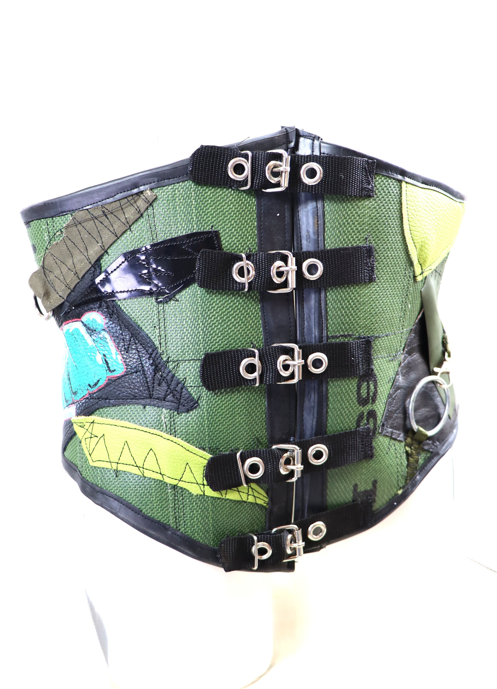 Handgefertigtes Unterbrust Korsett aus olivgrünem Feuerwehrschlauch. Die Corsage wird im Rücken durch Schnürung angepasst, Vorne kann sie an den Schnallen geöffnet werden.