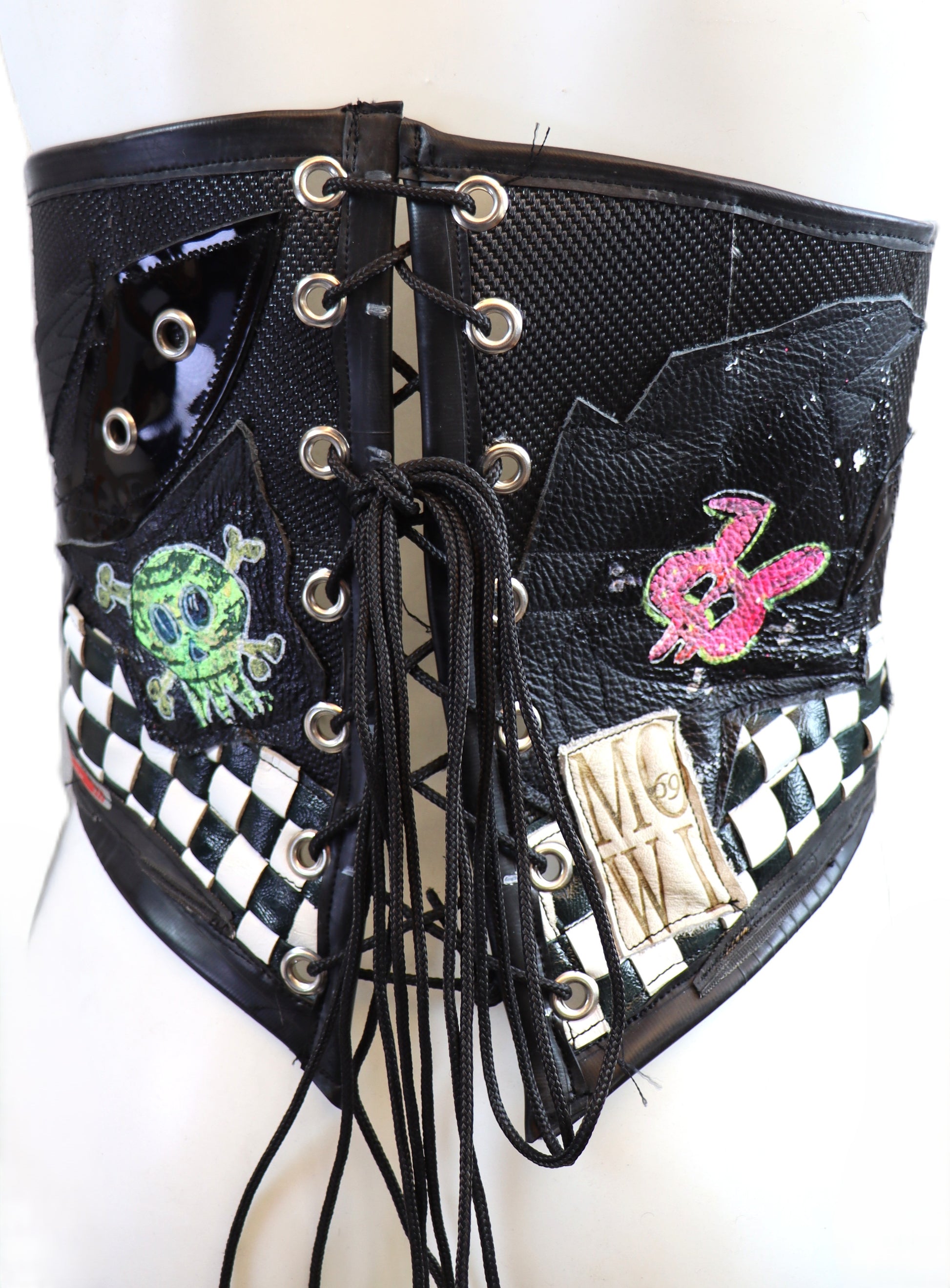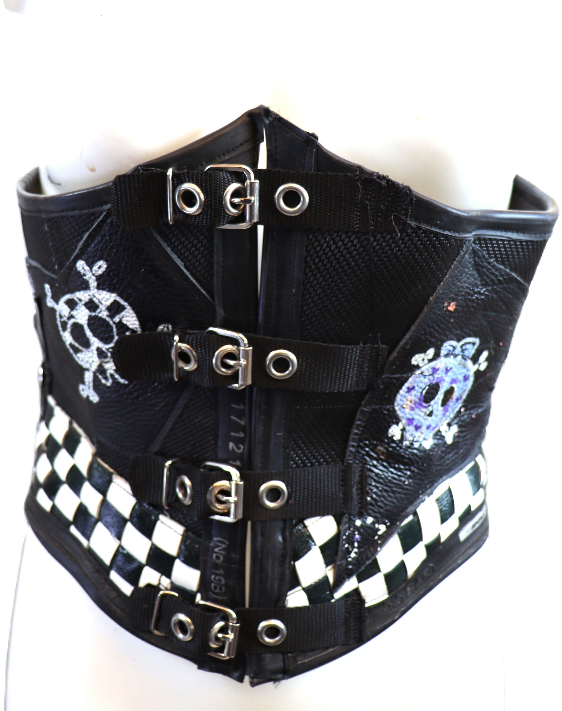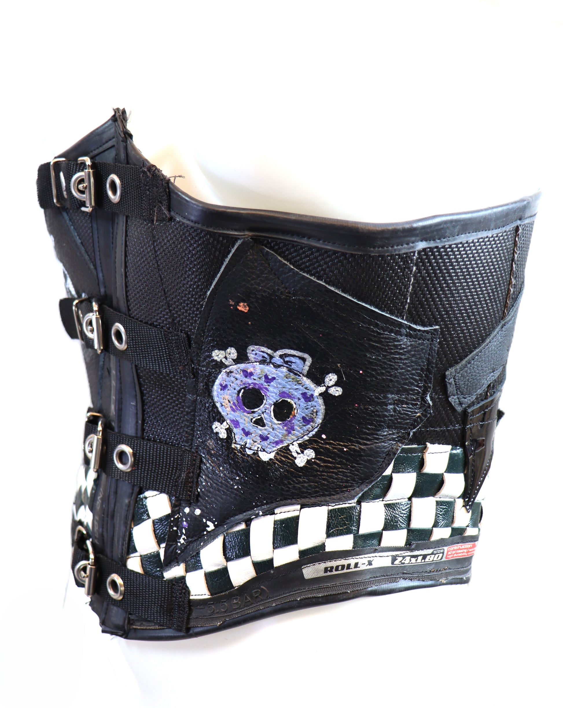 Handgefertigte Unterbrust Corsage aus schwarzem Feuerwehrschlauch mit Totenkopf Applikationen. Sie kann im Rücken durch Schnüre angepasst werden. Vorne können die Schnallen geöffnet werden.