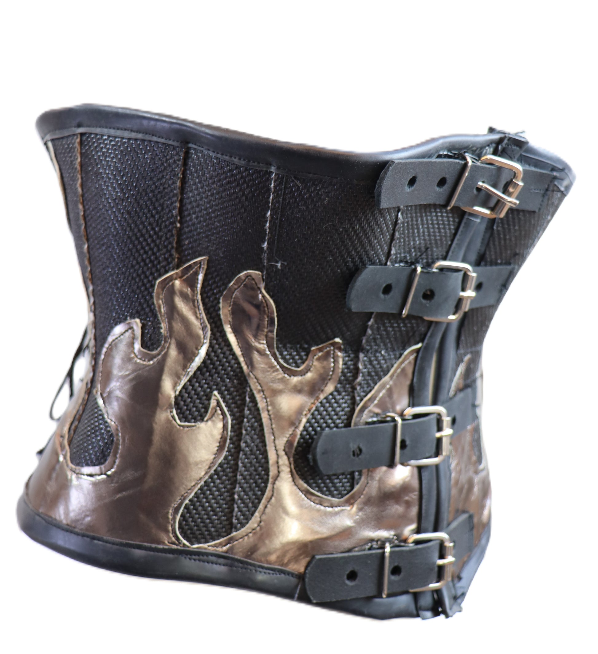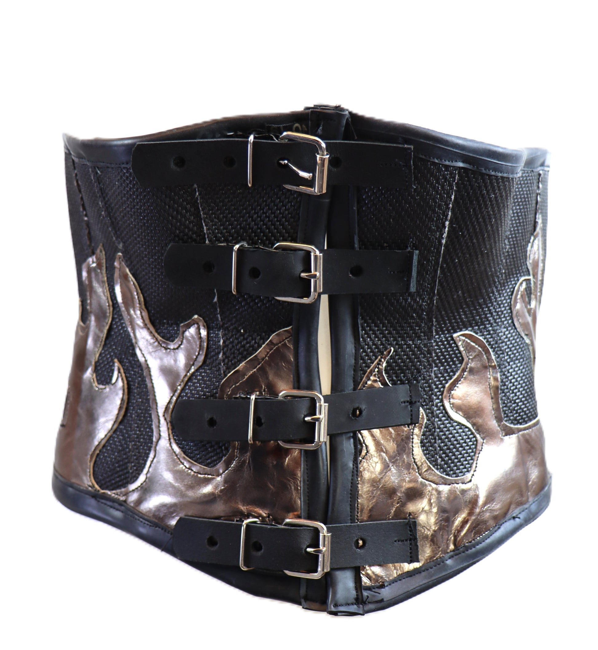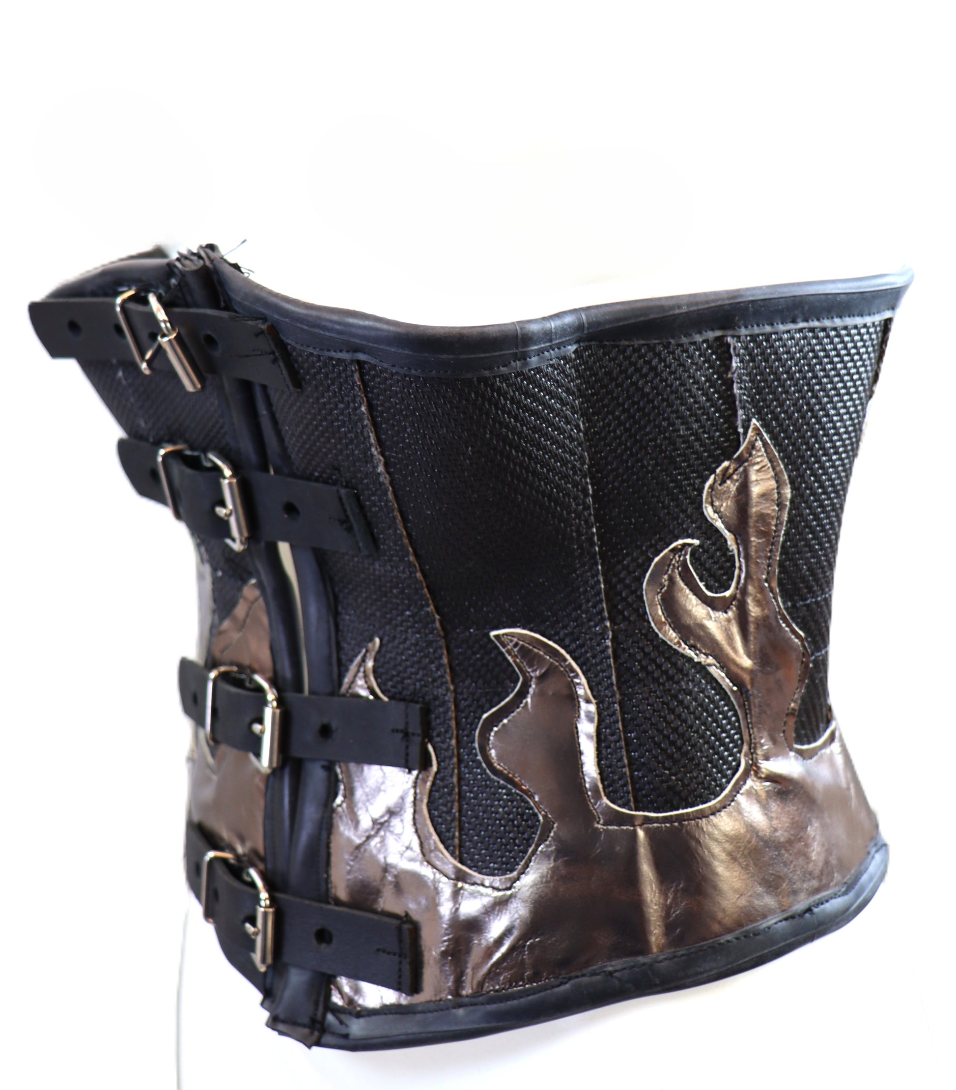 Handgefertigte Unterbrustcorsage aus schwarzem Feuerwehrschlauch mit goldenen Flammen. Das Korsett wird im Rücken durch Schnüre angepasst und kann durch die Schnallen in der vorderen Mitte geöffnet werden.