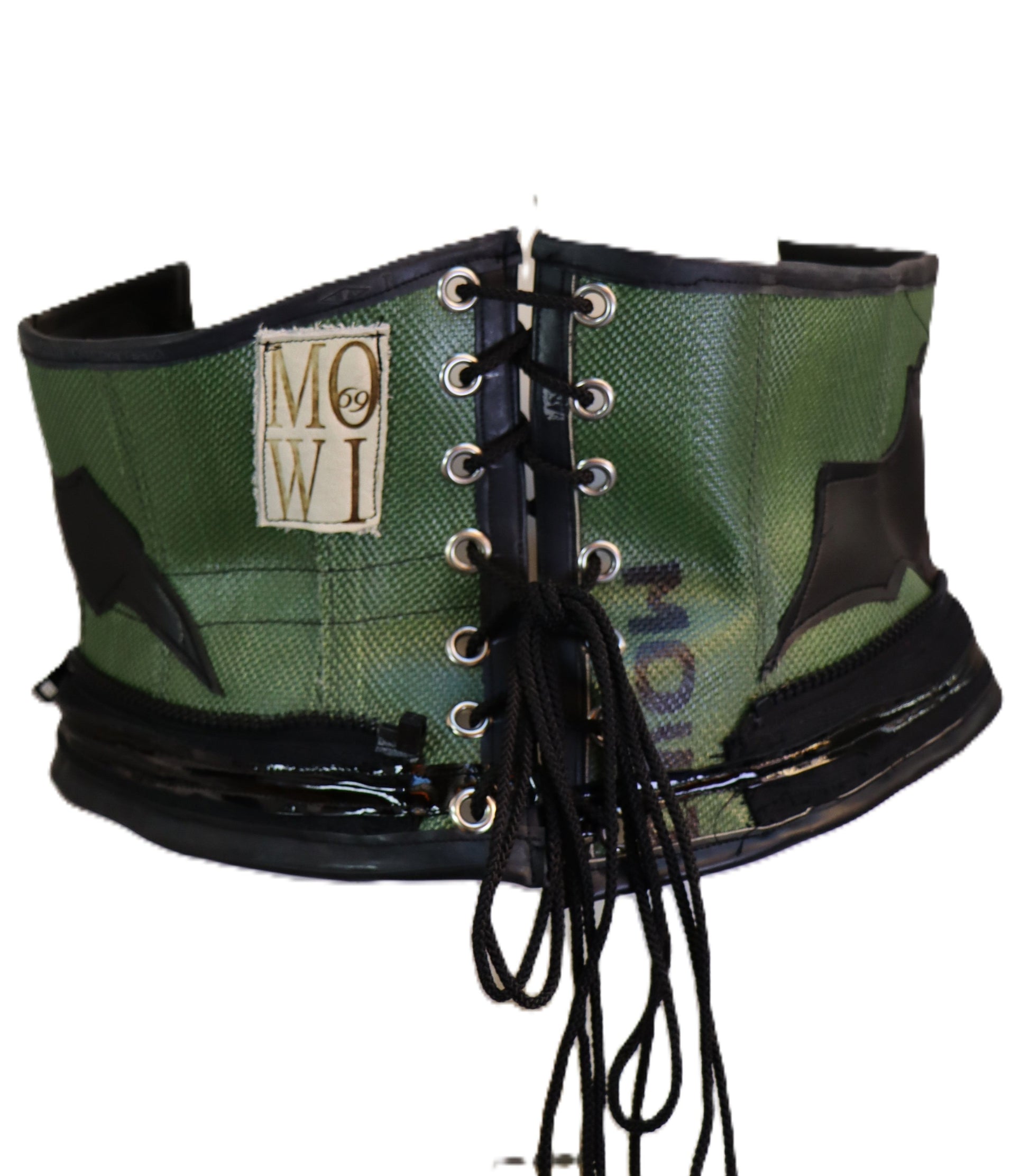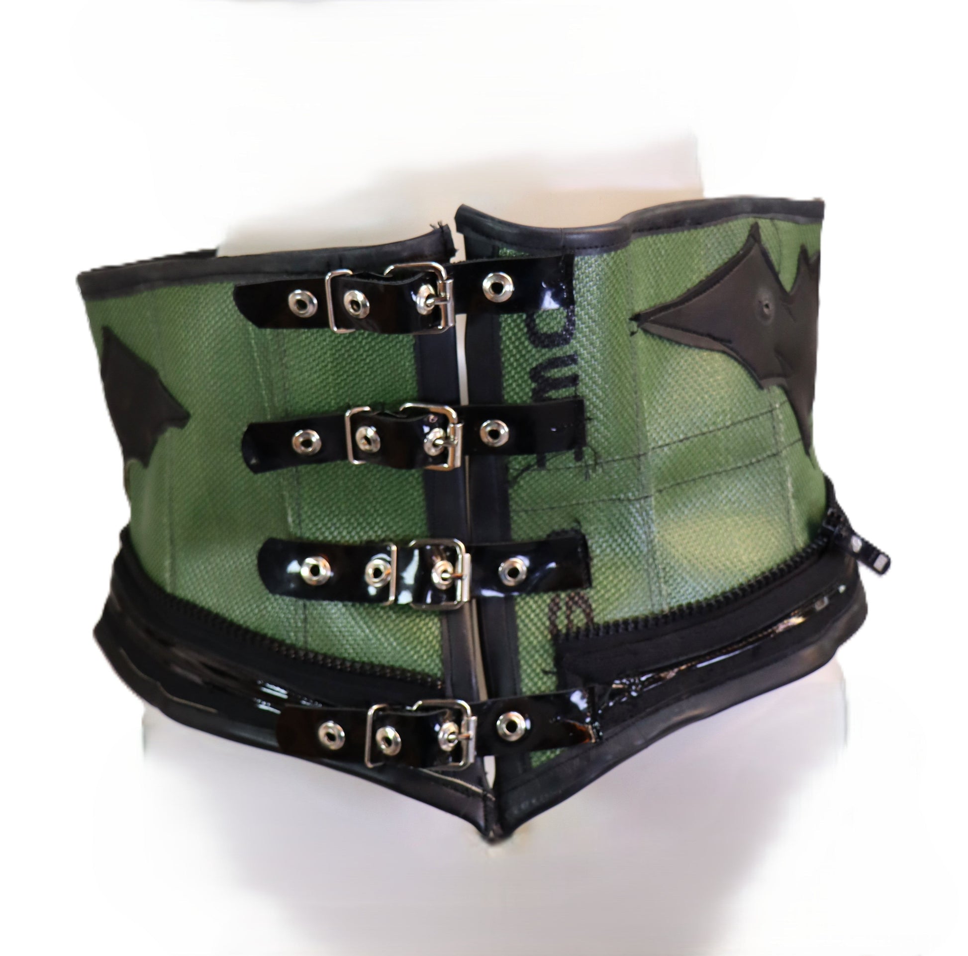 Handgefertigte Unterbrust Korsett, Corsage aus olivfarbenem Feuerwehrschlauch, mit applizierten Fledermäusen. -Unikat-