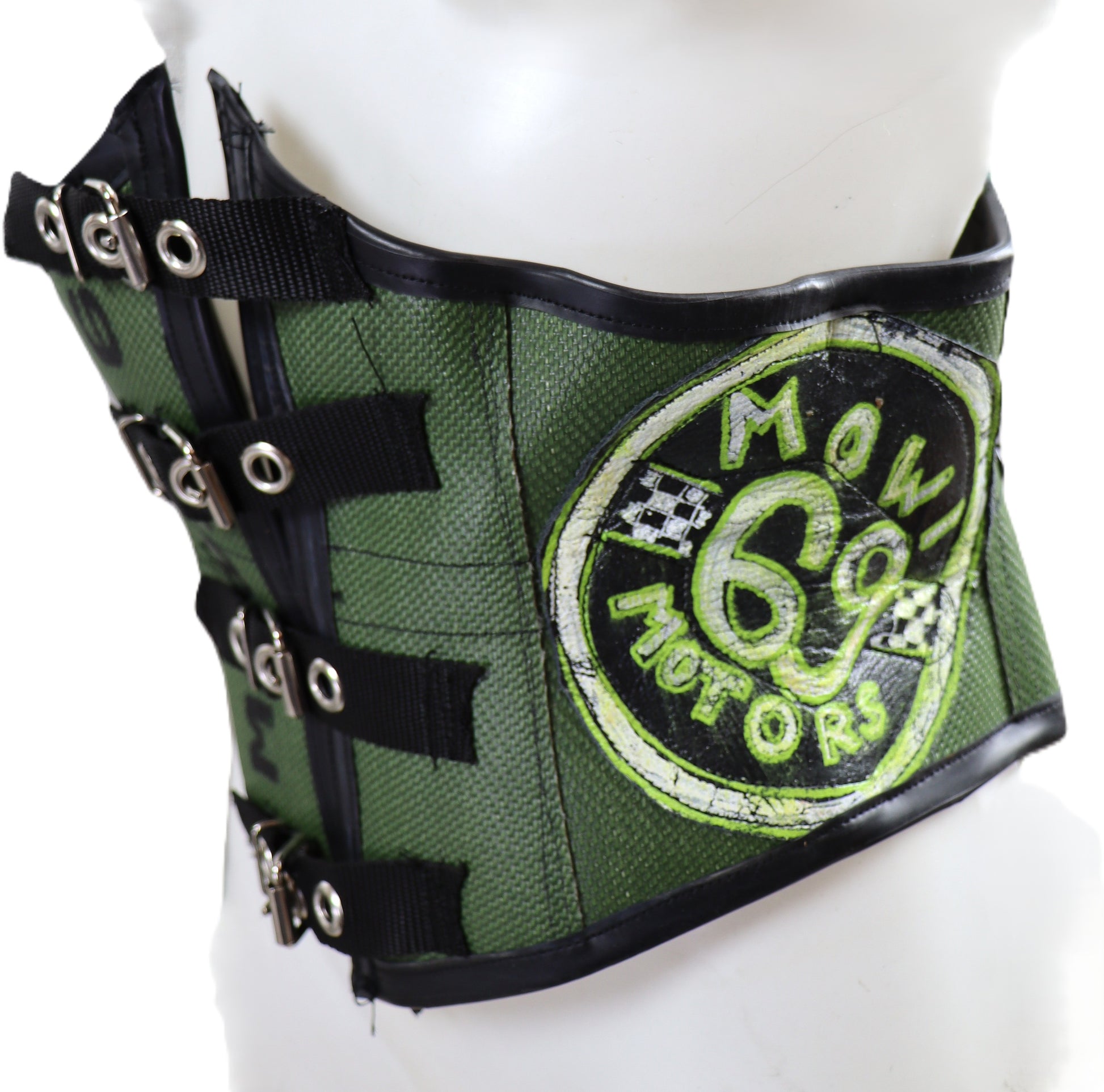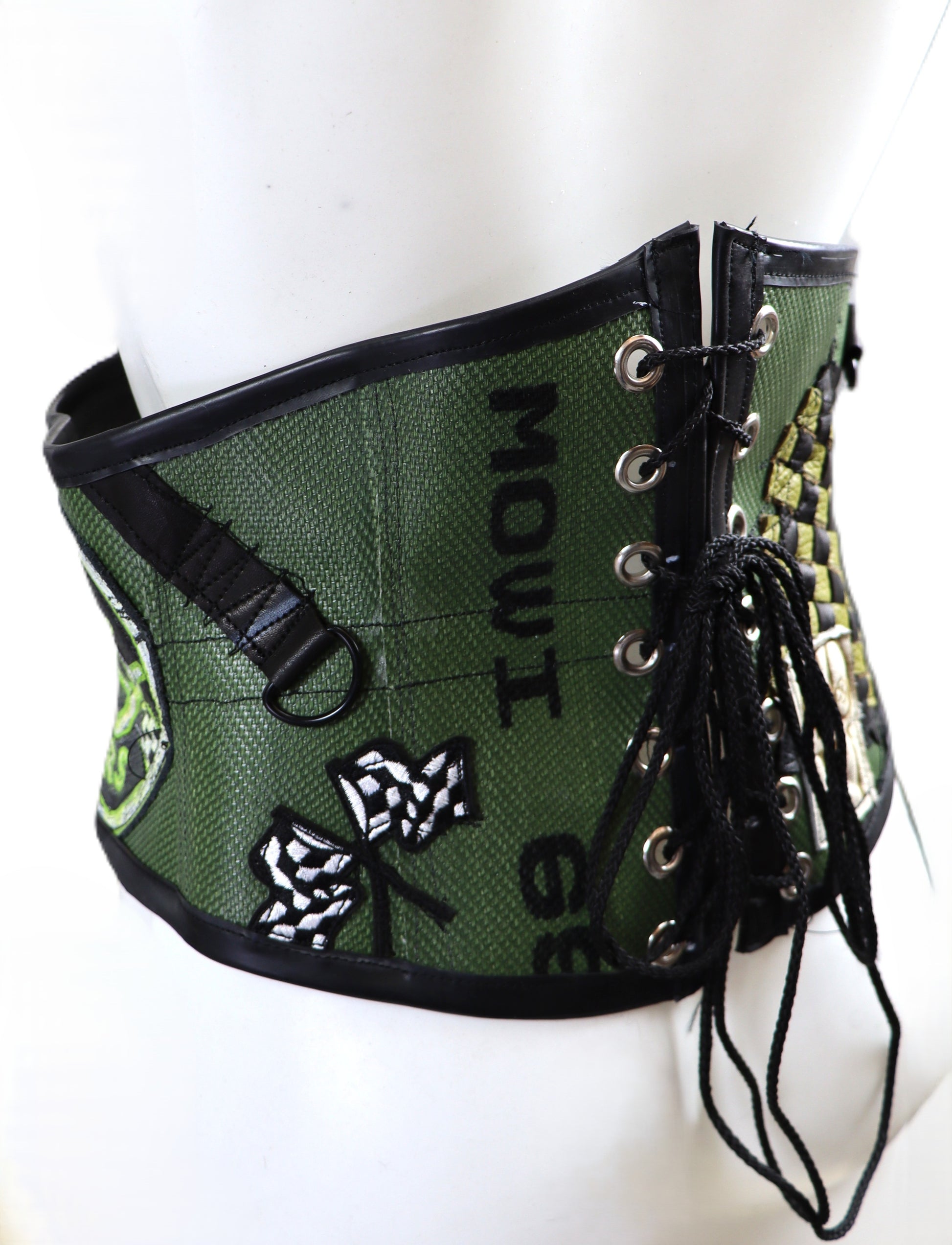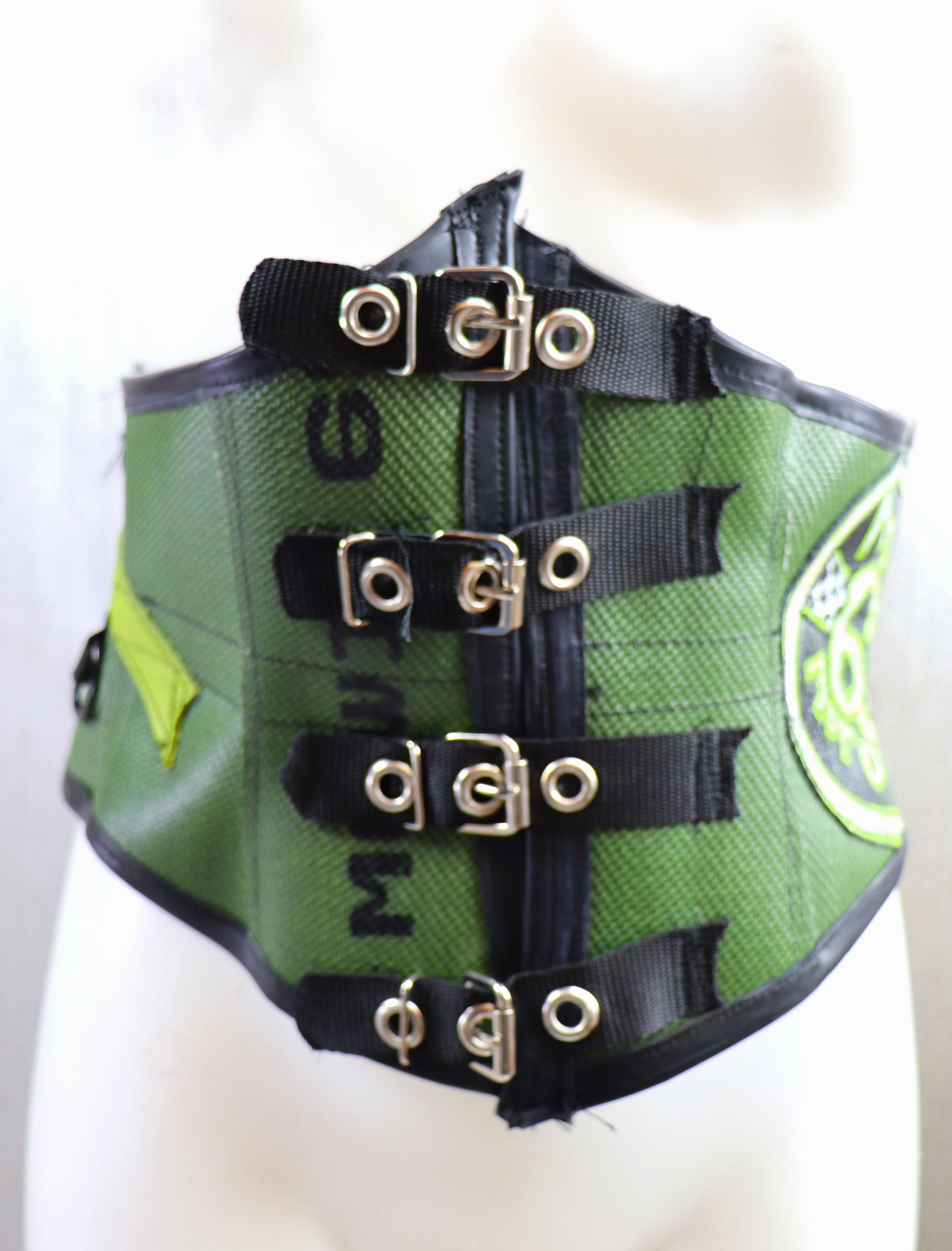 Handgefertigtes Korsett aus olivgrünem Feuerwehrschlauch. Corsage wird im Rücken geschnürt und kann vorne durch die Schnallen geöffnet werden.